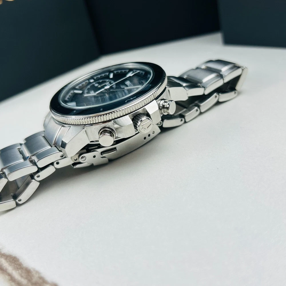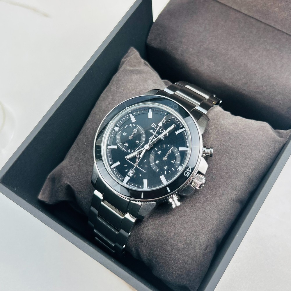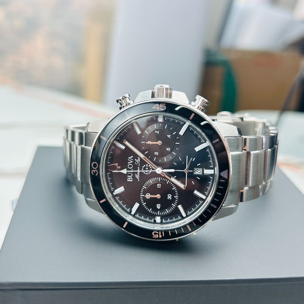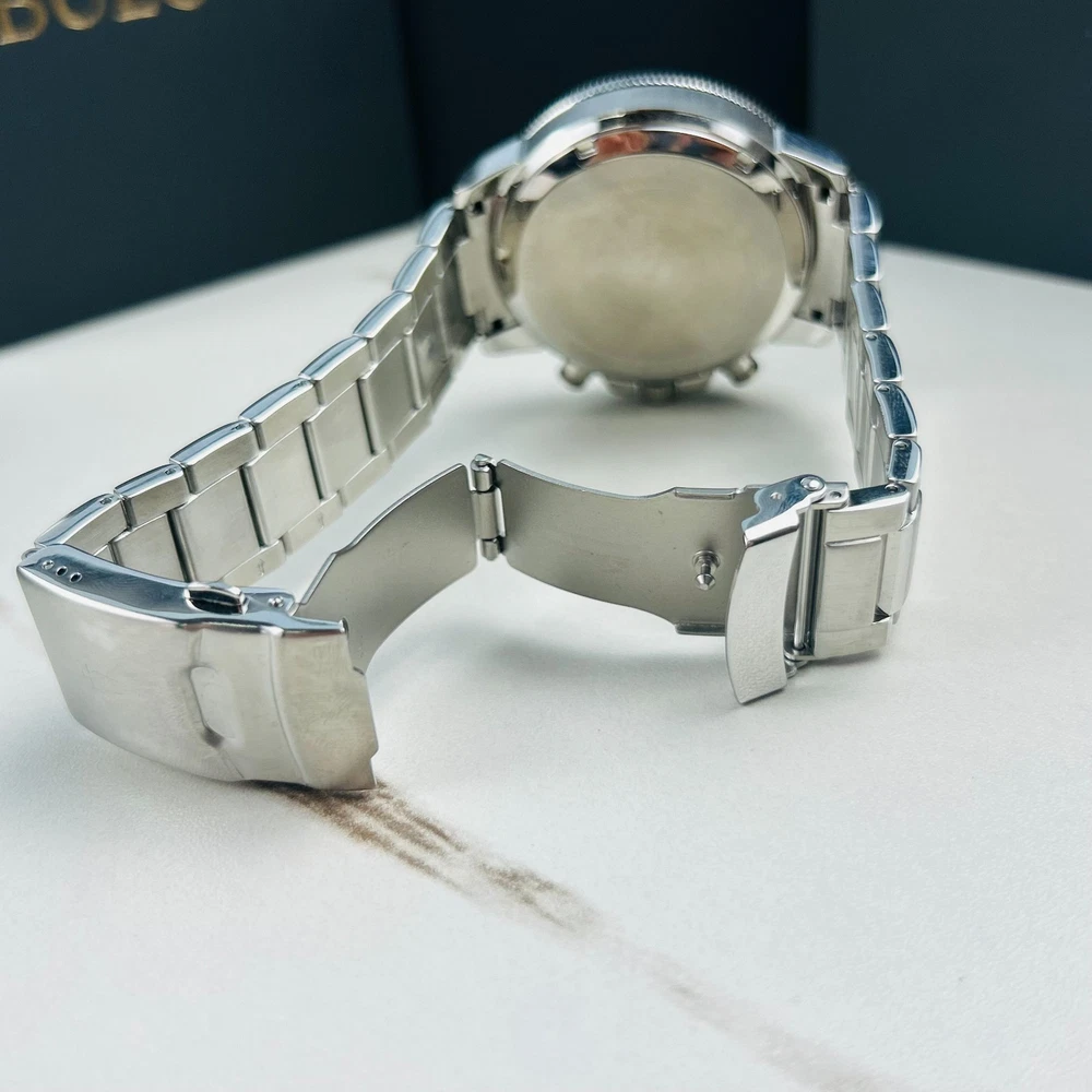 Brand: Bulova Model: 96B272 Movement: Quartz Dial Color: Black Crystal: Mineral Crystal Case Width: 45mm Lug Width: 22mm Material: Stainless Steel Water Resistance: 200m Features: Analog Display, Chronograph, 200M Water Resistance 6 hands 1/20 Second Chronograph Measures up to 60 Minutes Calendar Small Second Hand Shipping: Fast Shipping! Ship via UPS, USPS, FEDEX From the Marine Star Collection. New six-hand chronograph movement with 200-meter water resistance. In stainless steel with black glass insert on ratcheted rotating bezel, black dial with luminous hands and markers, and calendar feature, domed mineral crystal, screw-back case, stainless steel bracelet with fold-over...buckle closure, safety bar and extender.