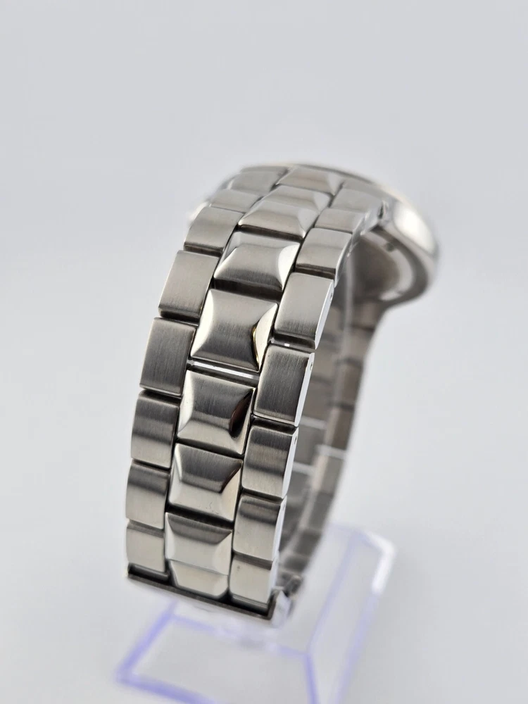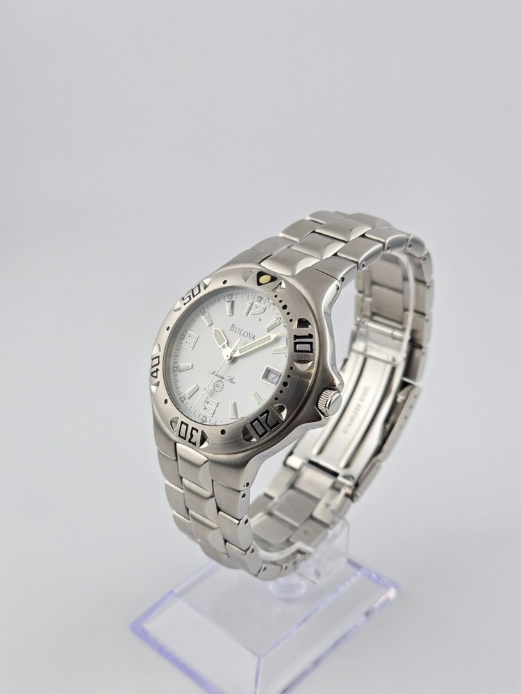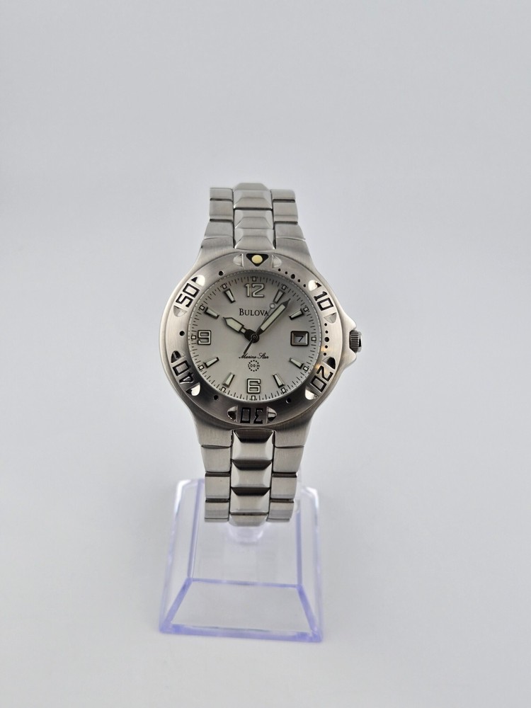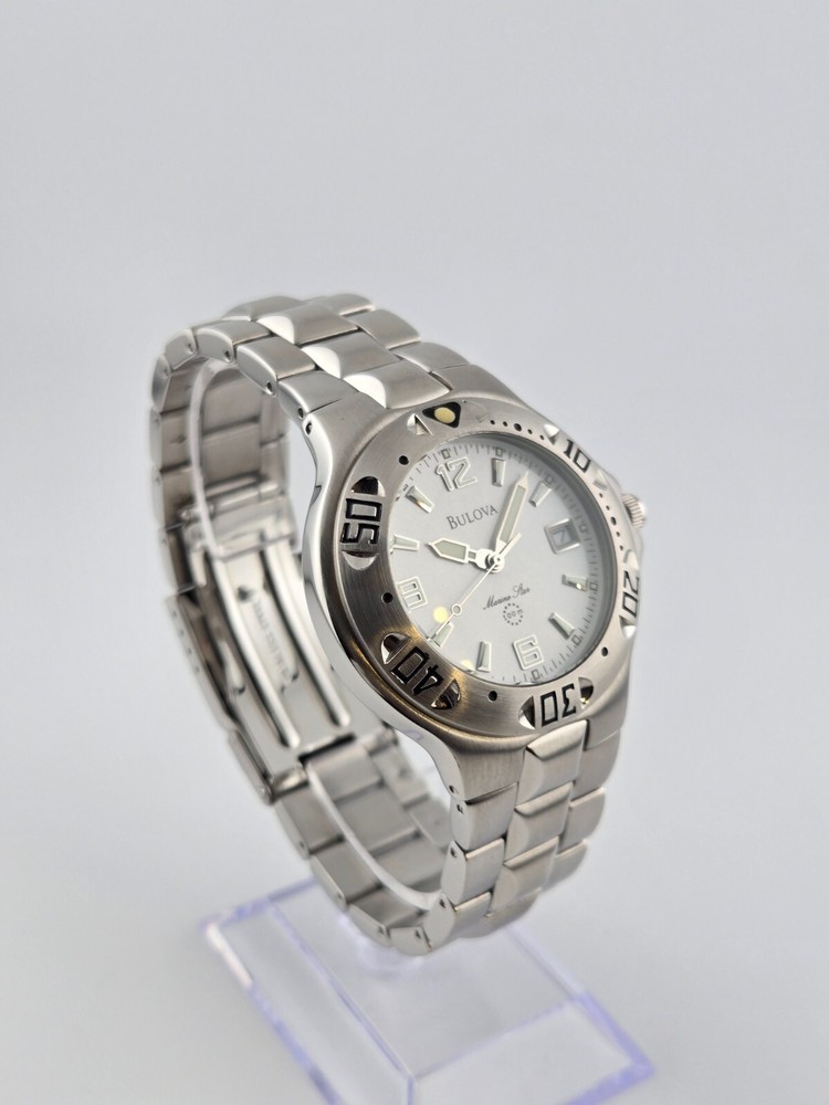 Bulova Men's Marine Star White Dial Stainless Steel Watch - 96B74 VINTAGE MODEL With Gift Box! This watch is a Shelf Pull from one of the Major Department Stores. Watch has micro scratches on the watch case/band, visible under direct light The Bulova Men's Marine Star White Dial Stainless Steel Watch (Model 96B74) is a timeless and sophisticated timepiece that seamlessly blends functionality with elegant design. Featuring a polished silver stainless steel bracelet and a matching silver bezel, this watch exudes a refined, classic look that is perfect for both everyday wear and special occasions. The bright white dial provides excellent contrast against the silver-tone markers and hands, ensuring easy readability at a glance. With its clean and minimalist aesthetic, the 96B74 brings a sense of timeless style to any outfit. Powered by a precise quartz movement, this Bulova Marine Star watch delivers reliable timekeeping with a smooth ticking seconds hand and a date function for added convenience. The durable mineral crystal glass offers protection against scratches and everyday wear, keeping the dial in pristine condition. A sturdy folding clasp ensures a secure and comfortable fit, while the stainless steel bracelet gives the watch a polished yet versatile feel, suitable for both casual and formal settings. With a water resistance of 100 meters (10 ATM), the Bulova Men's Marine Star is built to handle water activities such as swimming and snorkeling, making it both stylish and practical. Whether you're looking for a dependable daily timepiece or a polished accessory for a night out, this vintage-inspired model offers both performance and timeless appeal. Delivered in its original packaging, this Bulova watch is the perfect choice for those seeking a high-quality, versatile timepiece that combines classic design with modern functionality. Features Model: 96B74 Series: Marine Star Bracelet: Stainless Steel Glass: Mineral, shatter-resistant Bezel: Unidirectional Movement type: Quartz (battery powered) Water protection: 10 ATM Fast and Free Shipping You're already purchasing the item. Why pay additional for shipping, especially slow shipping? We get your order shipped out within 1-business day and delivered to your doorstep as quickly as possible. Competitive Pricing With our dynamic pricing model, our prices are always competitive. Our prices are some of the lowest that you will find on the internet. Rest assured that you're getting a good deal when purchasing with us. 30-day Money Back Guarantee We are committed to making sure that you leave this transaction satisfied. If you're unhappy with the product for any reason, you may return it back for your money-back or a replacement within 30 days. No questions asked!