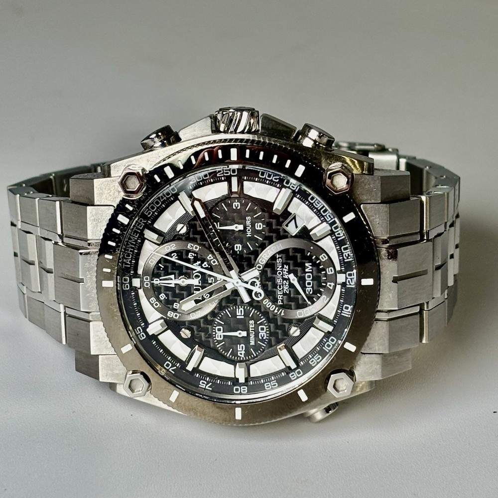 The Bulova Precisionist Chronograph Stainless Steel Quartz Men's Watch 98B405 is a stylish and versatile timepiece suitable for various occasions. With a sleek silver bezel, case, and band, this watch exudes a modern and sophisticated look. The quartz movement ensures accurate timekeeping, while the chronograph feature adds practicality to its design. Packaged in its original box, this watch also includes papers for authenticity. The diver, sport, and casual styles make it a great choice for men looking for a dependable and fashionable accessory.