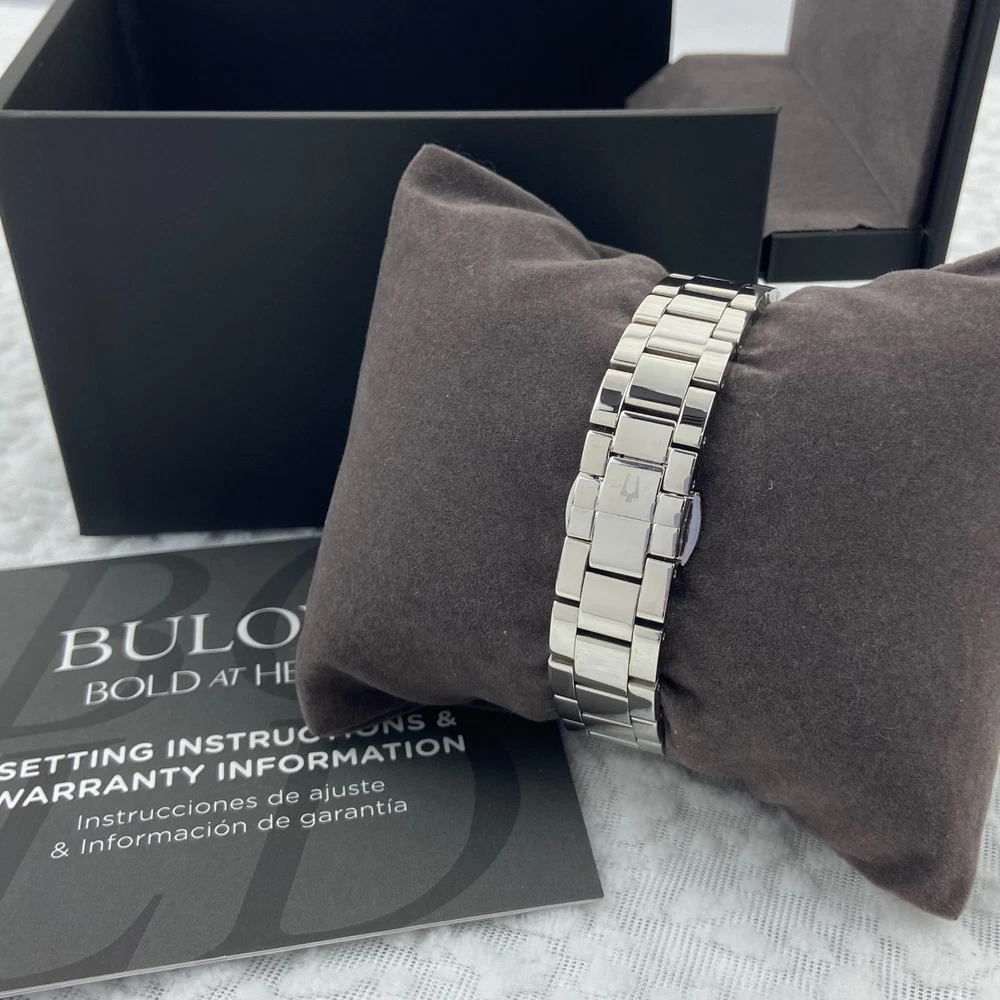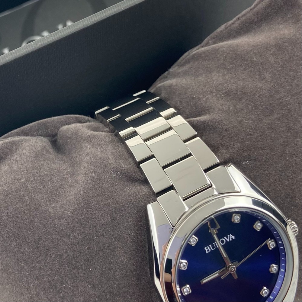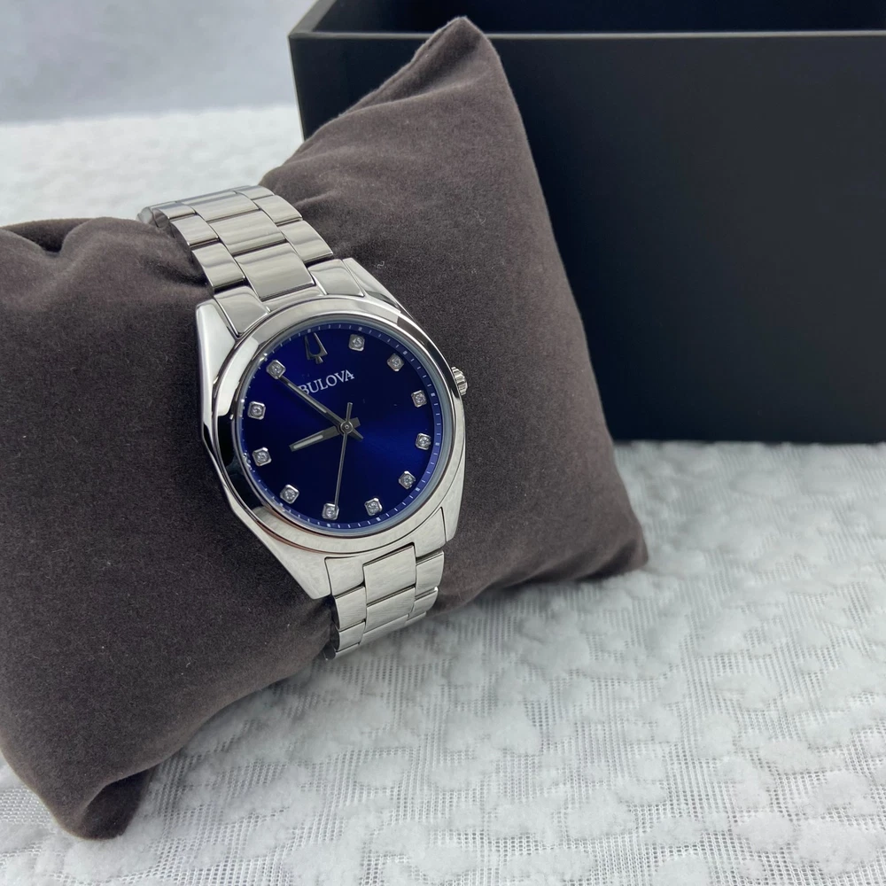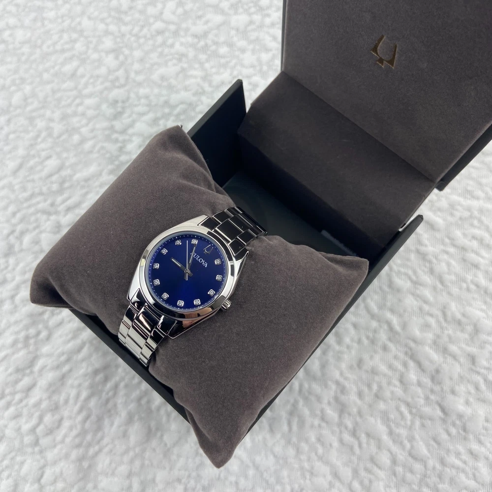 Bulova Surveyor Women's Watch 96P229 Diamond Blue Dial Stainless Steel Strap Description The Surveyor from Bulova is a classic women’s watch that will never go out of style. This silver-tone watch has a stainless steel case and bracelet with a blue three-hand dial hand set with 11 diamonds for both the look and feel of a luxury watch. With beautiful details and an elegant flair, this accessory brings a touch of timeless elegance to any occasion. Specifications Model: 96P229 Dial: Blue; Diamond Accents;Silver Accents Case: 31 mm; Silver-Tone; Stainless Steel Lug: 16 mm Band: Bracelet; Stainless Steel; Deployant Clasp with Push Buttons Crystal: Mineral Crystal; Impact and shatter resistant Water-Resistance: WR [Splash Resistant] Weight (g): 105 Movement: 2035; Quartz A movement powered by a battery. The quartz crystal regulates the time achieving accuracy to 15 seconds a month. Functions: 3 Hand NOTE: Please feel free to email me with any questions, and I will respond within 24 hours. I will do my best to resolve any issues you may have. Kindly avoid leaving neutral or negative feedback without contacting me first. Thank you for your understanding, and I hope you have a pleasant shopping experience!