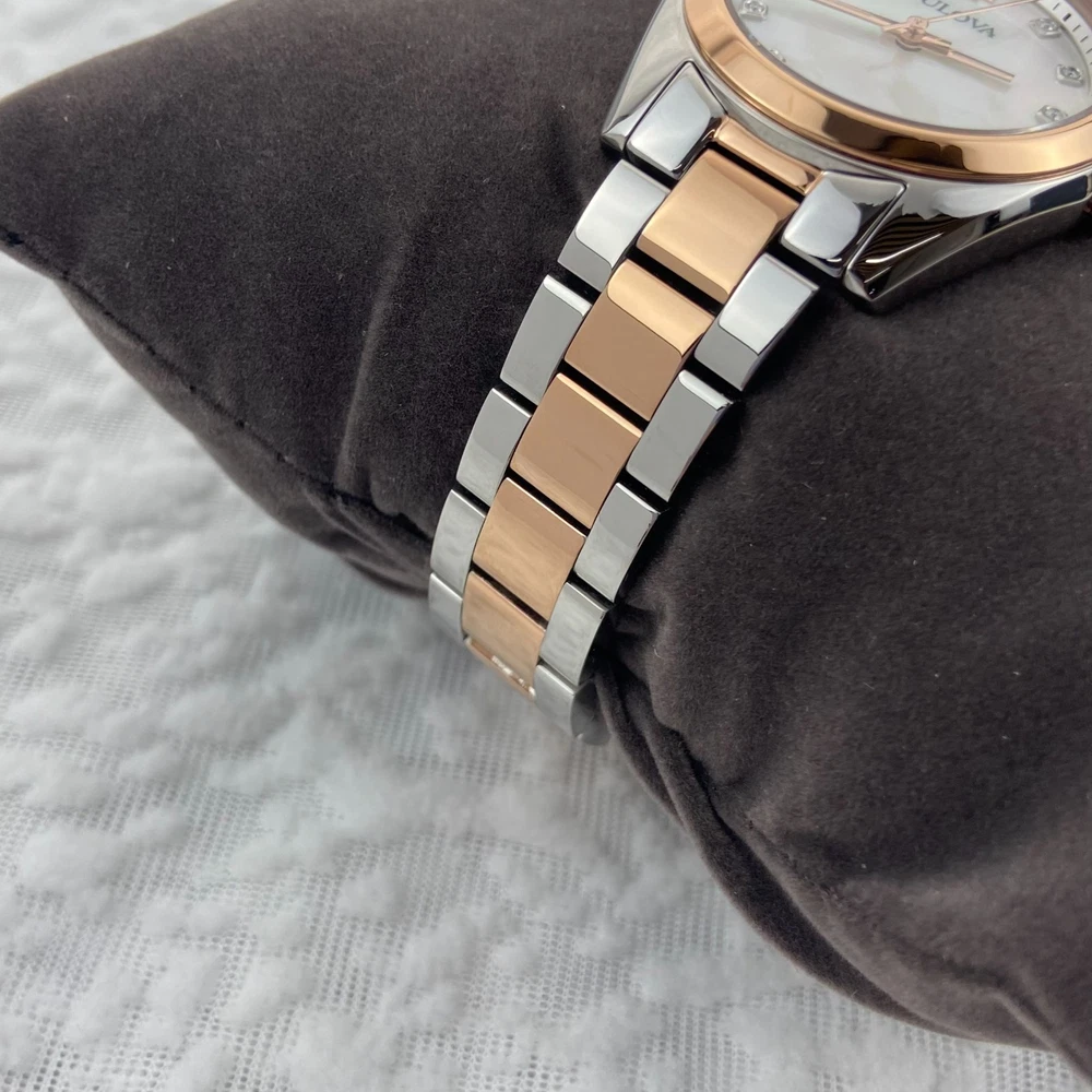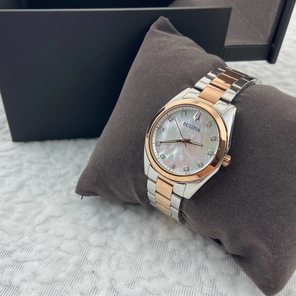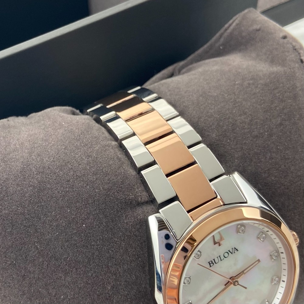 Bulova Surveyor Women's Watch 98P207 Mother of Pearl White Dial Rose Gold Strap The classic Surveyor collection from Bulova has been updated with a ladies sporty watch. This two-tone watch, in rose-gold and silver tones, has a stainless steel case and bracelet with an elegant flair. The white mother-of-pearl dial is hand set with 11 diamonds for a feminine look. This timepiece is beautifully detailed, making it an elegant addition to any collection. Product Details Technical Specs SKU: 98P207 Band: Two Tone Stainless Steel Bracelet with Deployment Clasp Case: Two Tone Stainless Steel Functions: 3 Hand Dial Colour: Mother-of-Pearl Case Size (MM): 31MM Crystal: Mineral Crystal Water Resistance: Splash Resistant NOTE: Please feel free to email me with any questions, and I will respond within 24 hours. I will do my best to resolve any issues you may have. Kindly avoid leaving neutral or negative feedback without contacting me first. Thank you for your understanding, and I hope you have a pleasant shopping experience!