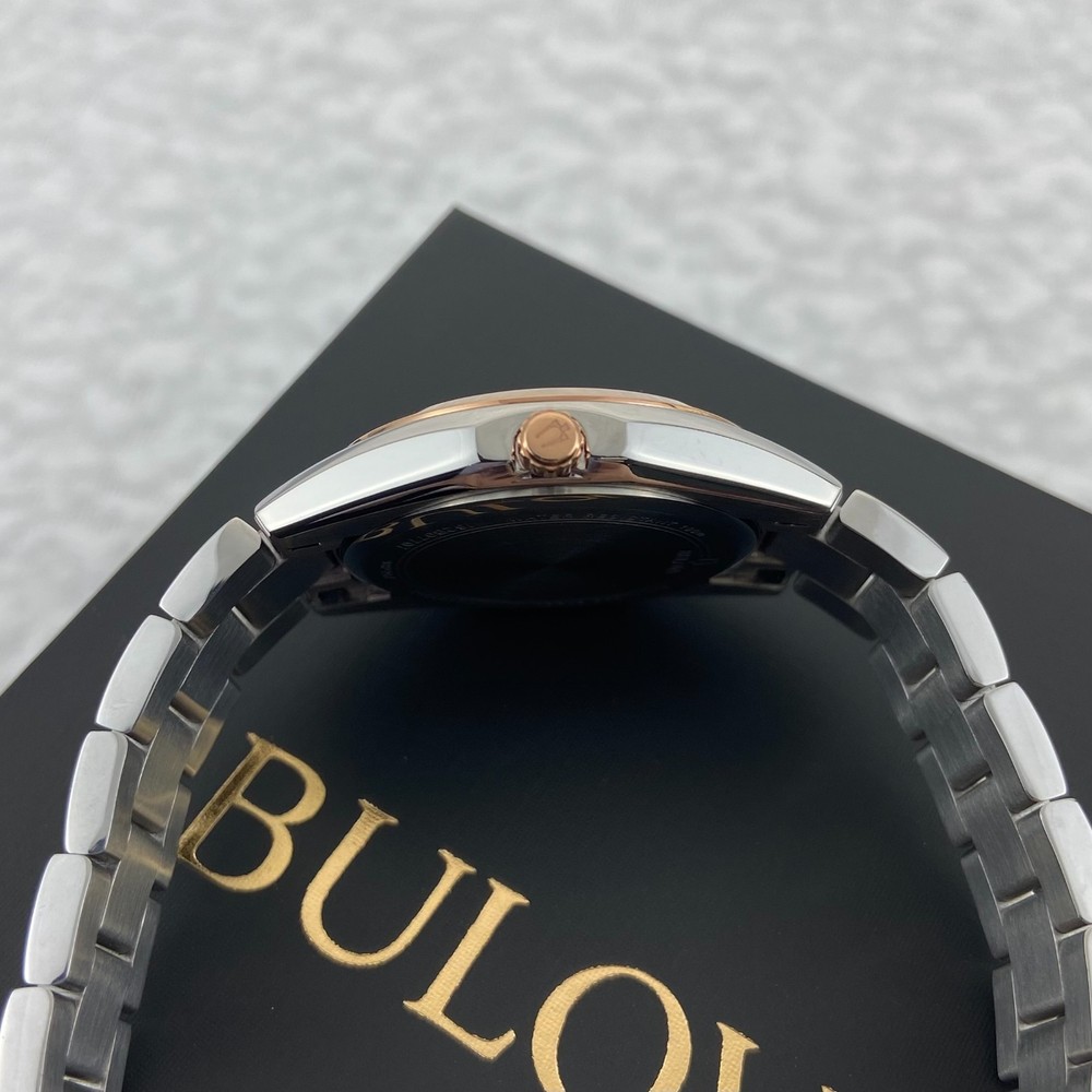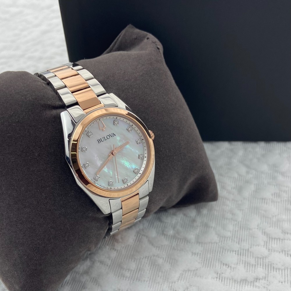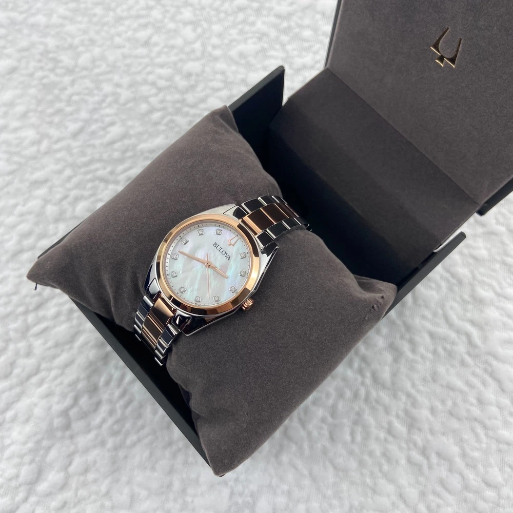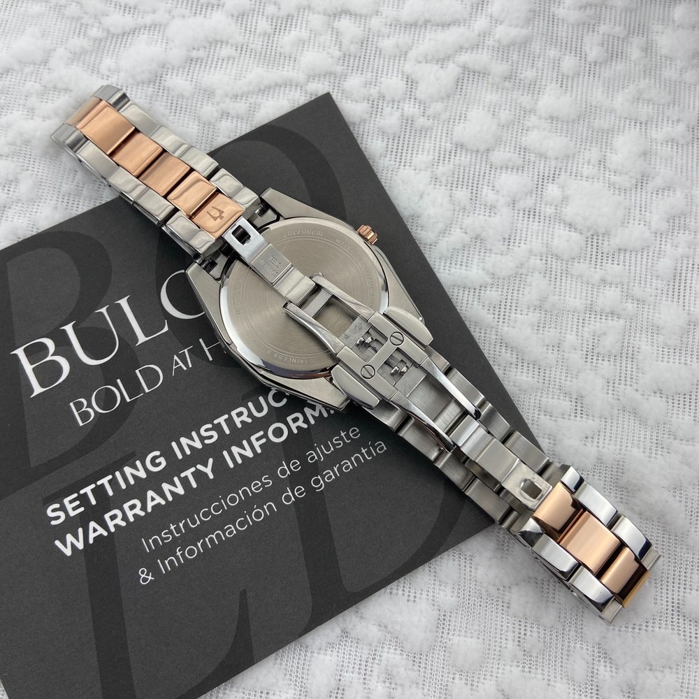 Bulova Surveyor Women's Watch 98P207 Mother of Pearl White Dial Rose Gold Strap The classic Surveyor collection from Bulova has been updated with a ladies sporty watch. This two-tone watch, in rose-gold and silver tones, has a stainless steel case and bracelet with an elegant flair. The white mother-of-pearl dial is hand set with 11 diamonds for a feminine look. This timepiece is beautifully detailed, making it an elegant addition to any collection. Product Details Technical Specs SKU: 98P207 Band: Two Tone Stainless Steel Bracelet with Deployment Clasp Case: Two Tone Stainless Steel Functions: 3 Hand Dial Colour: Mother-of-Pearl Case Size (MM): 31MM Crystal: Mineral Crystal Water Resistance: Splash Resistant NOTE: Please feel free to email me with any questions, and I will respond within 24 hours. I will do my best to resolve any issues you may have. Kindly avoid leaving neutral or negative feedback without contacting me first. Thank you for your understanding, and I hope you have a pleasant shopping experience!