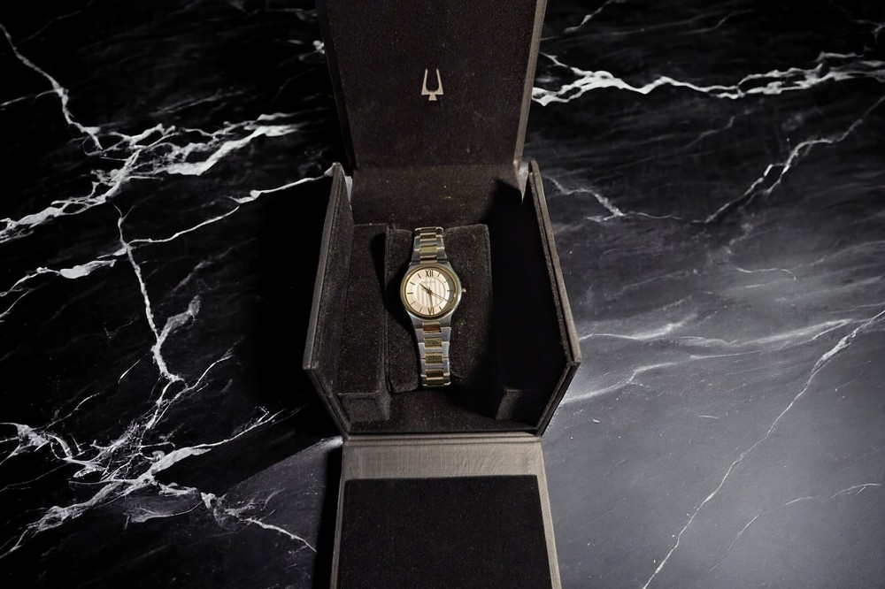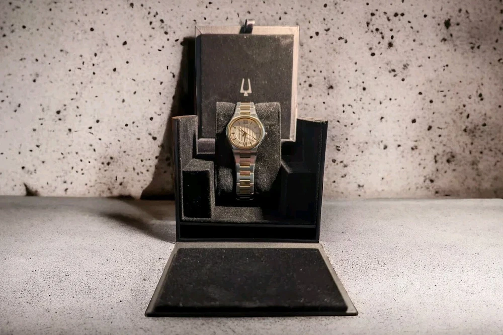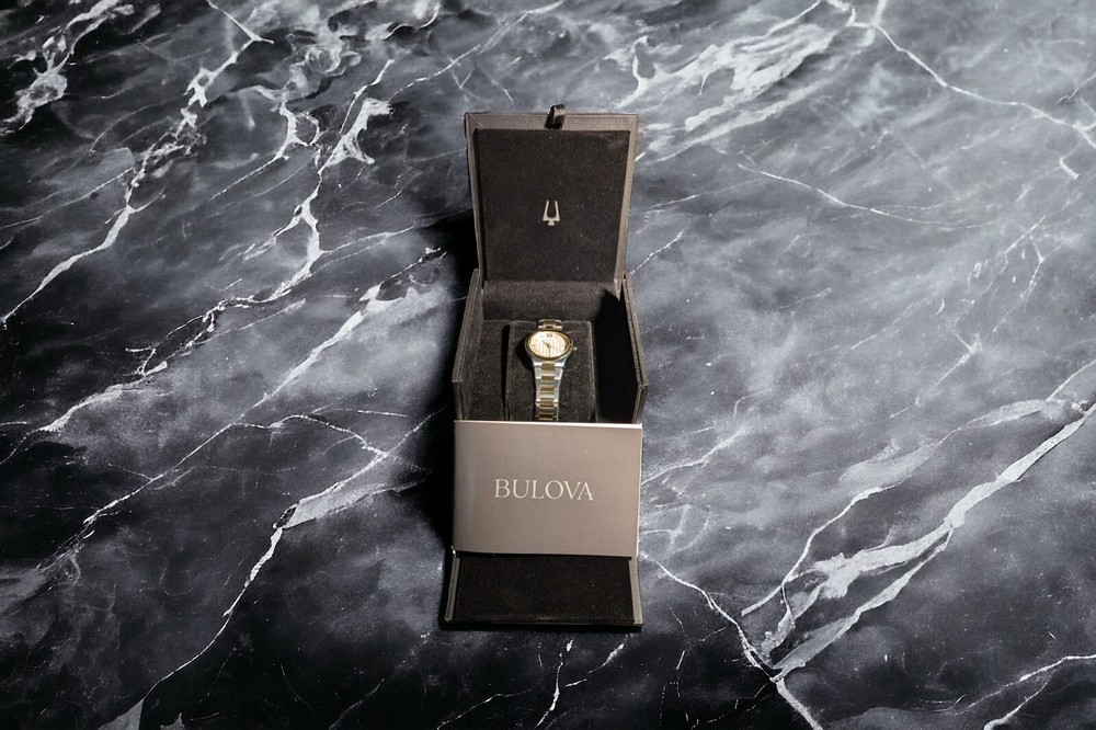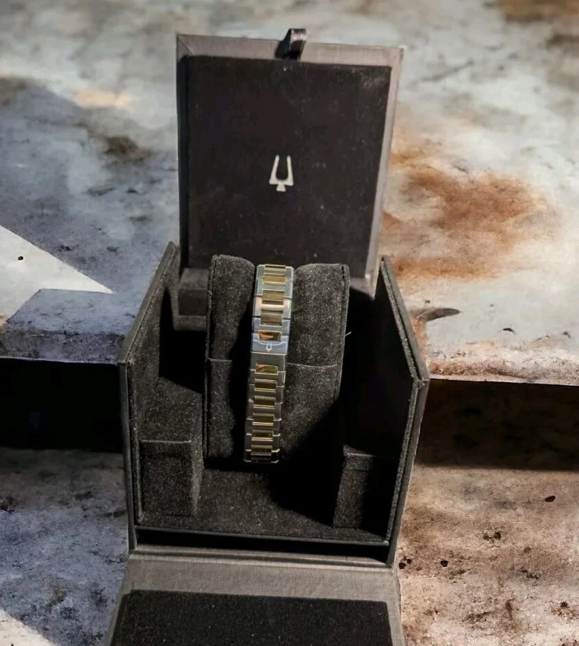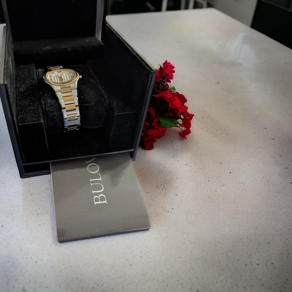 This stunning Bulova wristwatch is the perfect accessory for any fashion-forward woman. With a beautiful gold tone case and gold bezel, this watch is a true statement piece. The analog display features a gold dial and gold hands, all surrounded by a stunning silver stainless steel band. This watch has been worn only once and comes with a new battery installed 12/07/24, making it an excellent choice for anyone looking for a reliable timepiece. It is water-resistant up to 30 meters and comes with its original box, papers, and manual/booklet. Whether you're dressing up for a special occasion or just want to add some elegance to your everyday look, this Bulova watch is the perfect choice.