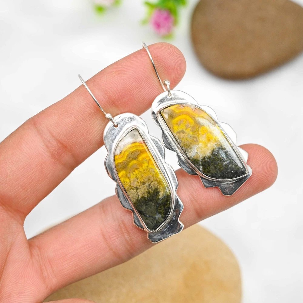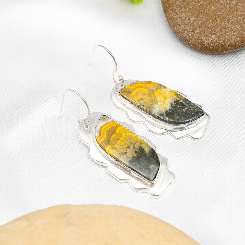 Absolutely love these earrings! The bumble bee jasper has such unique, earthy tones, and the sterling silver setting gives them a sleek, elegant look. They're lightweight, comfortable to wear all day, and the craftsmanship is top-notch. Perfect for adding a natural, bohemian touch to any outfit. Highly recommend!