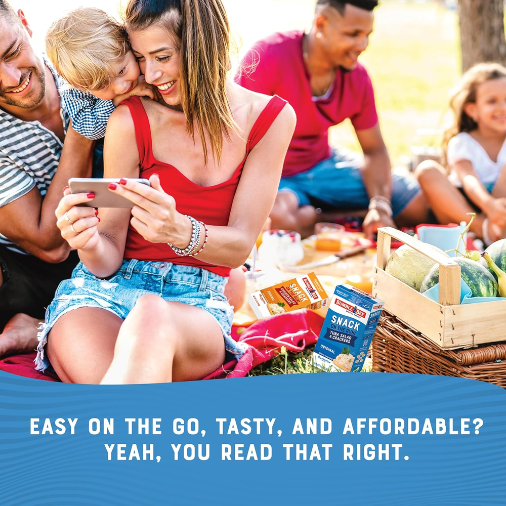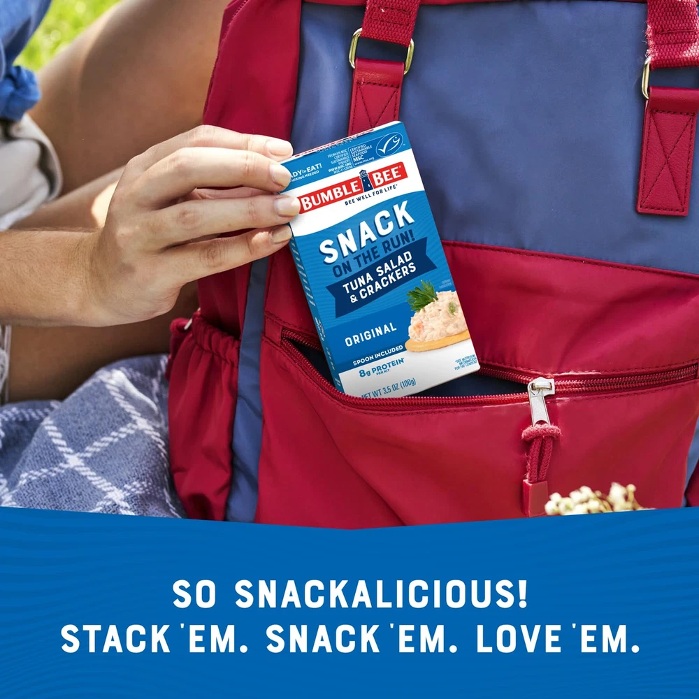 ORIGINAL TUNA SALAD KIT: Each box includes one can of classic premium tuna salad made with wild caught light tuna fish (already mixed and ready to eat), six crackers, and a spoon. PROTEIN IN A HURRY: Tasty flavor-packed tuna salad with buttery crackers is the perfect snack to help you stay satisfied on the run. Contains 8g of protein per kit (1 serving). Bulk case contains twelve kits. SHELF STABLE PANTRY STAPLE: Requires no refrigeration for easy storage at home, and is a quick grab-and-go option for office or school lunch, while traveling, or as a post-workout pick-me-up. Even faster than fast food! ON THE GO: Perfectly sized for your lunchbox or backpack and ready to go wherever life takes you! Great for outdoor activities like picnics, hiking, biking, camping, and sports. SUSTAINABLE TUNA: MSC Certified Sustainable Seafood, Wild Caught, and Dolphin Safe. We get it, you’re really busy. No, like we actually get it. That’s why we made our Bumble Bee Snack on the Run! kits. Because being on the go shouldn’t mean foregoing the finer things in life, like our beautifully filling tuna salad on crackers you can eat straight from the box. The iconic, the classic, the ever-comforting tuna salad, premixed and ready to eat anywhere you want. All you have to do is open the box and dig in.