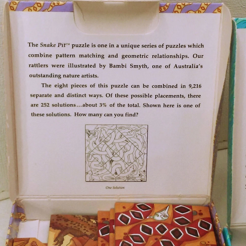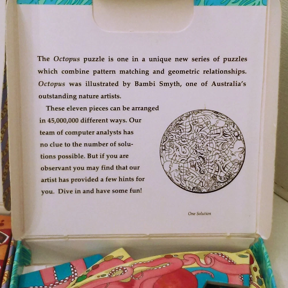 Character Family: snake + octopus Brand: Binary Arts Natures Spaces Year: 1993 Type: Cube/Twist Puzzle Shape: square circle with 1000s of solutions Material: Cardboard Size: 7x7x7 Theme: Animals
