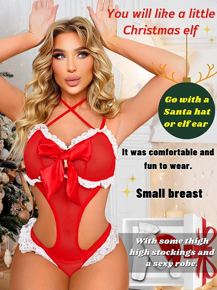 About this Item: 【Fabric】Mesh & Satin, Lace / Bright and Rich Red / Sheer / Beautiful white lace detailing and soft to the touch. Neck - Drawstring / Bra - Pull On closure Hand Wash Only 【Bra】Stretch Bralette / Adjustable Shoulder Straps / Unpadded / Unlined / Ties around the neck so you can adjust it to your height and chest size. 【Bottom】Thong / Irregular Cut Design / Made your booty looks bigger and waist looks smaller. 【Matching】Decorative Satin Ribbon Bow / Little Bell / Lace Ruffle / Little Fuzz Ball / Removable Mesh Bow 【Don't Miss】With some thigh high stockings and a sexy robe, made for a great Christmas wrapped look. 【Occasion:】For: a nice Christmas gift for your significant other, a Christmas themed photoshoot, great for spicing things up in the bedroom, honeymoon trip, Valentine’s day and heats up your night life. 【Package Content :】 1*Christmas Bodysuit