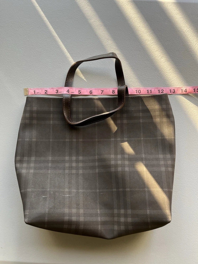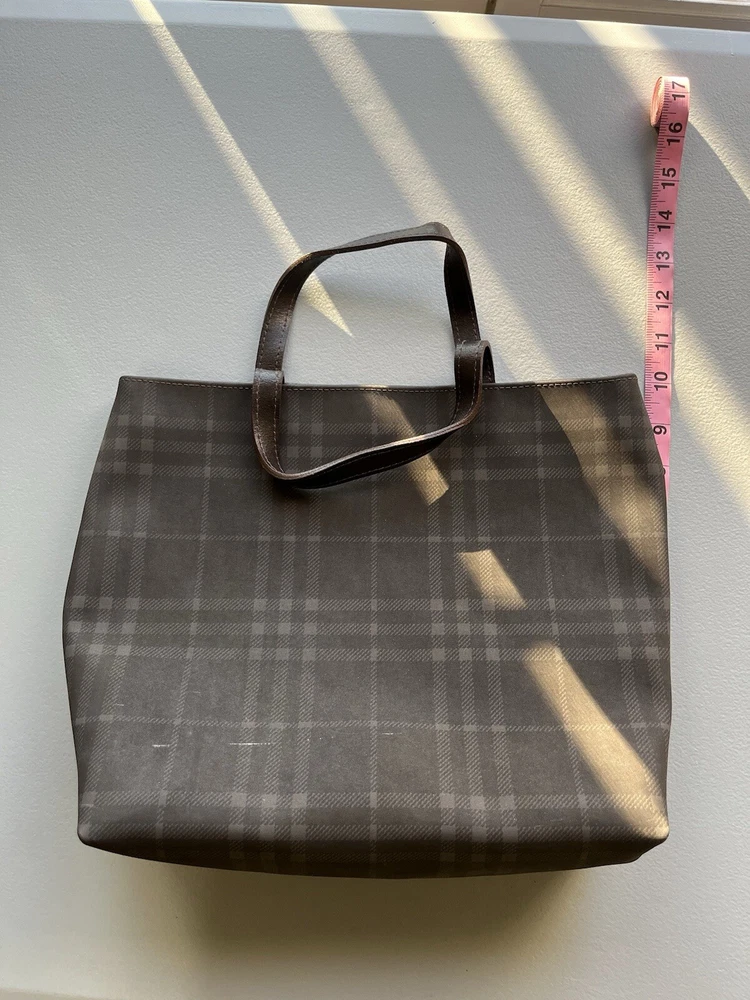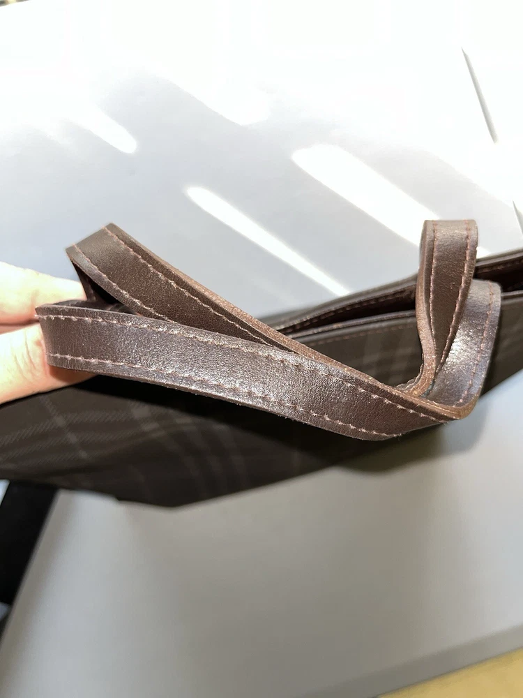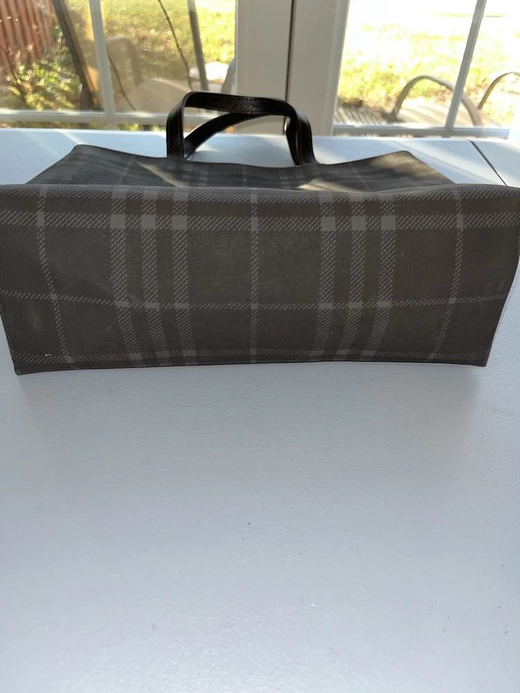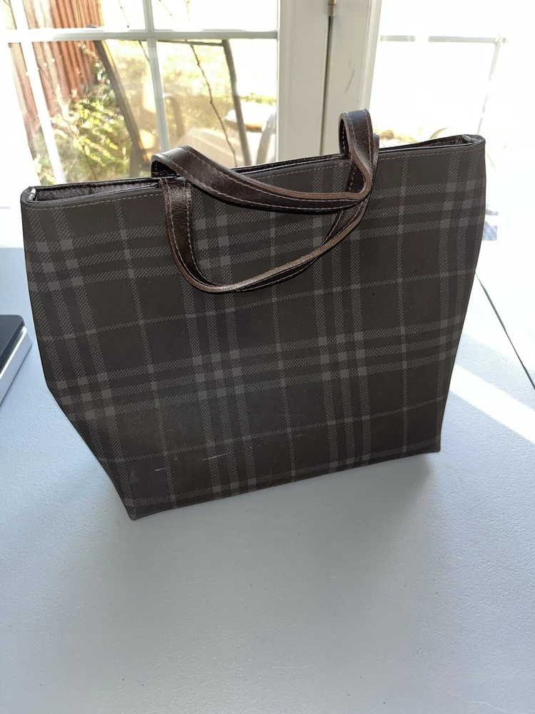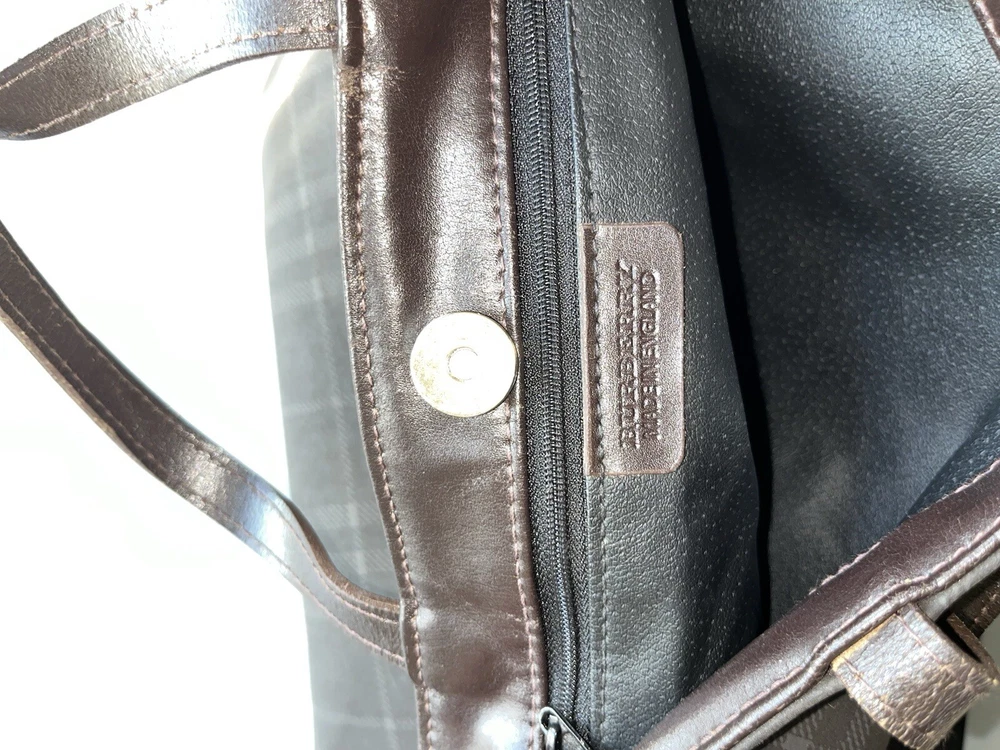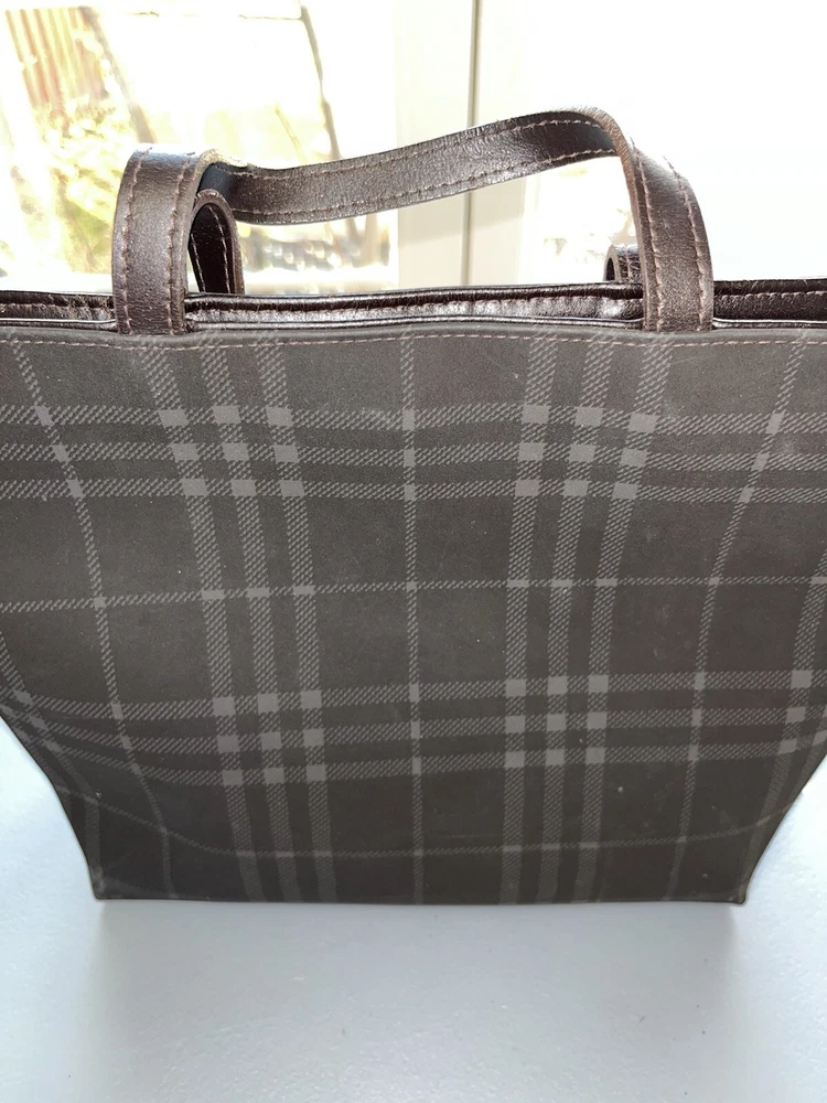 This is an authentic vintage Burberry London Nova Check Tote Handbag. It features a checkered pattern, brown handles/straps, and is made of leather and PVC exterior materials. The lining color is also brown. This tote is a perfect addition to any collection item is used as pictured.