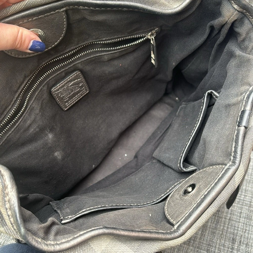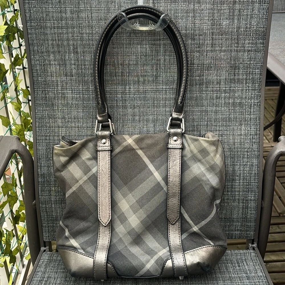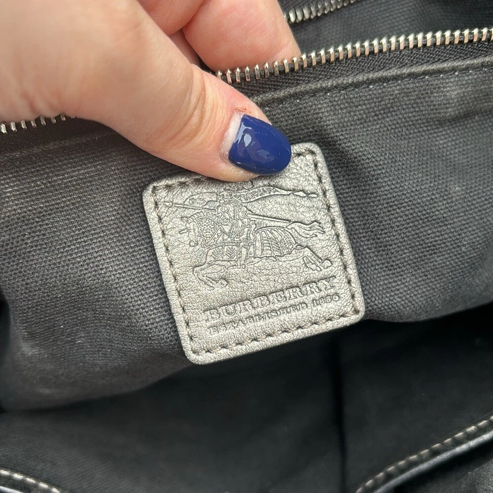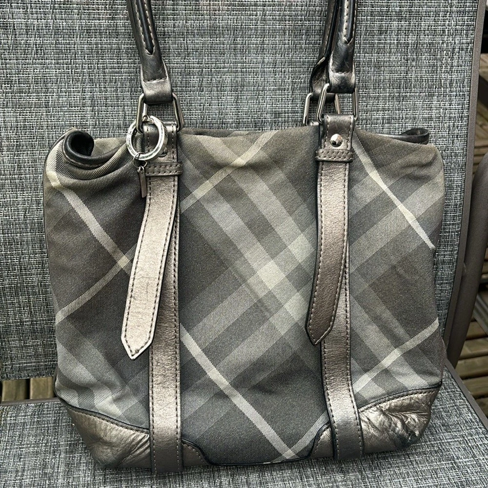 Comes with a certificate of authenticity. Burberry Tote • Grey Canvas • Smoked Check Pattern • Silver-Tone Hardware • Leather Trim • Dual Shoulder Straps • Leather Trim Embellishment • Canvas Lining & Three Interior Pockets • Snap Closure at Top • Protective Feet at Base Shoulder Strap Drop: 7.75" Height: 10.75" Width: 10.5" Depth: 5.25" Very good condition. Item is preowned and vintage. Please refer to all photos, some markings at interior.