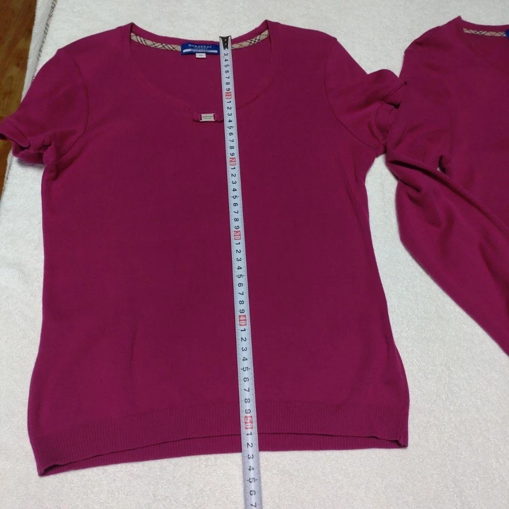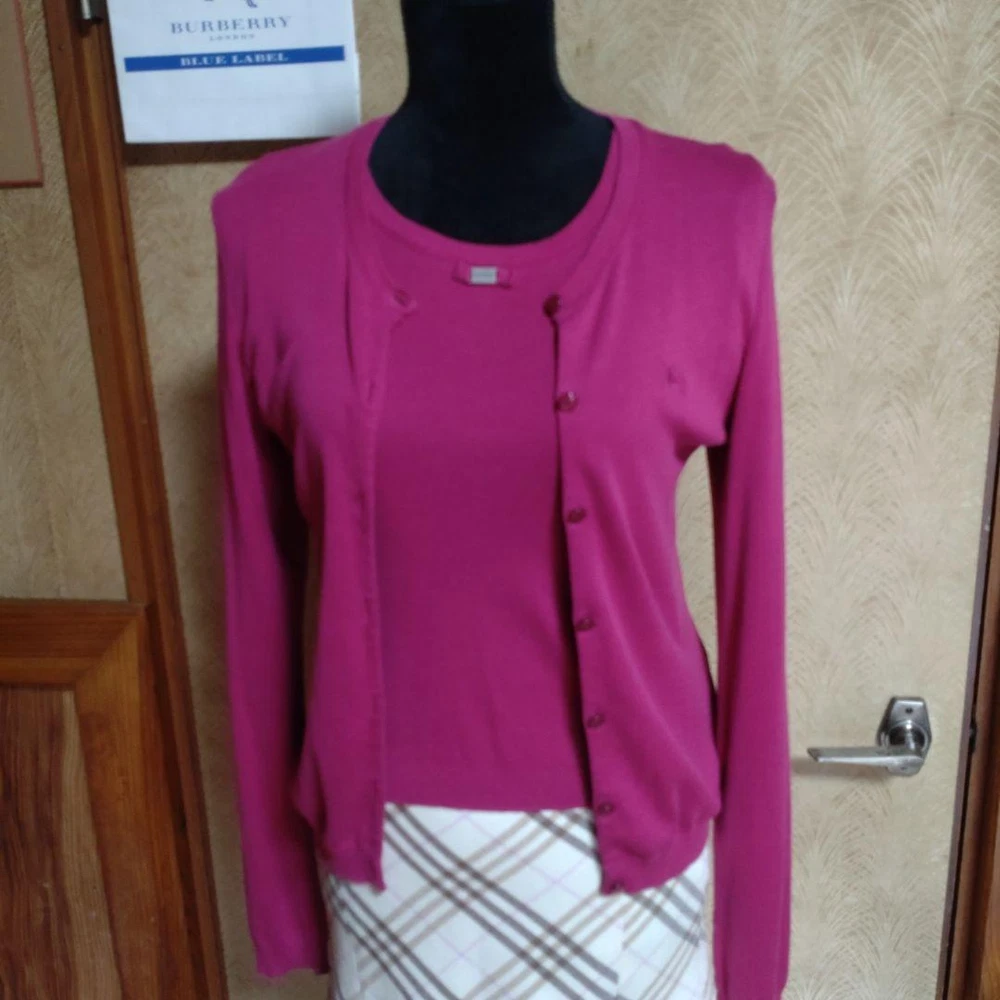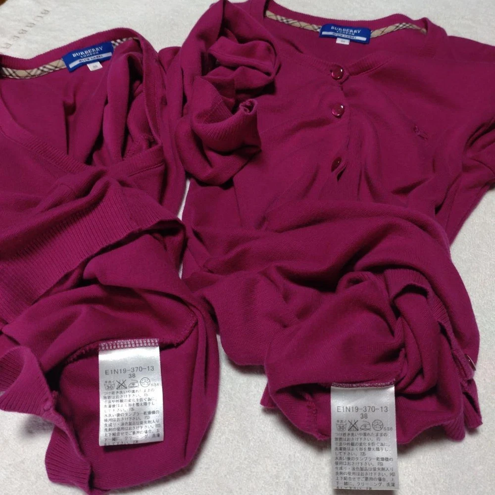 Burberry Blue Label Knit Twin Set Cardigan & Short Sleeve Top Purple 38 Key Features **Burberry Blue Label Ensemble** - **Brand**: Burberry Blue Label - **Product Type**: Twin Knit Set (includes short-sleeve knit and long-sleeve cardigan; skirt not included) - **Color**: Purple with a pink hue - **Size**: 38 - **Material**: Cotton knit, lightweight and soft on the skin - **Features**: - Versatile wear: can be worn separately or together - Wrinkle-resistant and machine washable - Suitable for all seasons; perfect for layering with turtlenecks or under warm coats - Elegant yet simple design, pairs well with skirts or pants - **Condition**: Gently used, washed after each wear. No noticeable scratches or stains, but slight signs of use may be present. Please refer to photos for details. This ensemble offers both style and comfort, making it a great addition to your wardrobe. Specifications Brand Burberry Blue Label Country Japan Product Description Item Title Burberry Ensemble Short Sleeve Knit And Long Cardigan Payment Supports managed payments Please pay within 5 days after auction is finished. About Us We are located in Japan. It's our pleasure to make you happy by proposing our recommend item. If you have any questions or request about items, please feel free to ask us. International Buyers - Please Note: -Import duties, taxes, and charges are not included in the item price or shipping charges. These charges are the buyer's responsibility. -Please check with your country's customs office to determine what these additional costs will be prior to bidding/buying. -These charges are normally collected by the delivering freight (shipping) company or when you pick the item up - do not confuse them for additional shipping charges. -We do not mark merchandise values below value or mark items as - gifts - The US and International government regulations prohibit such behavior. Thank you for your understanding.