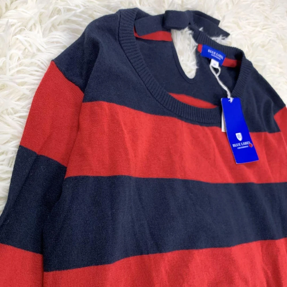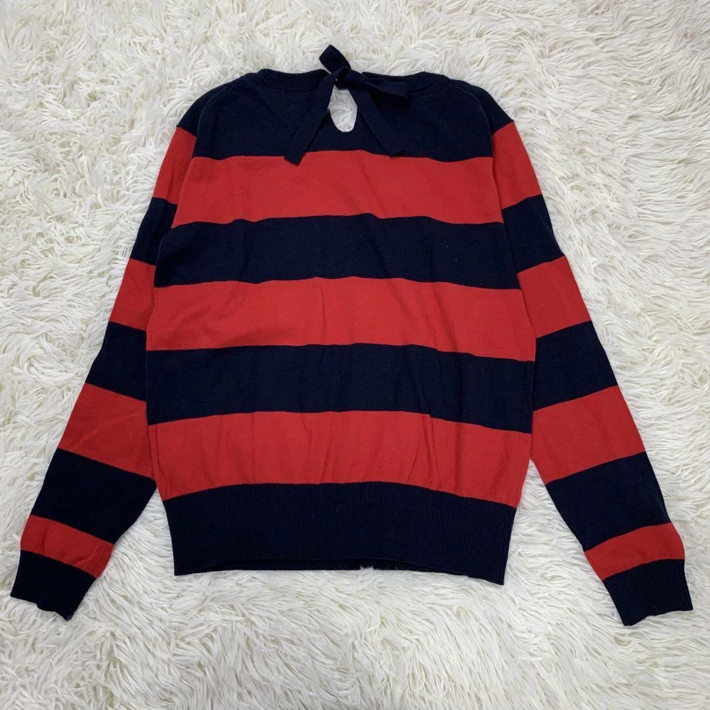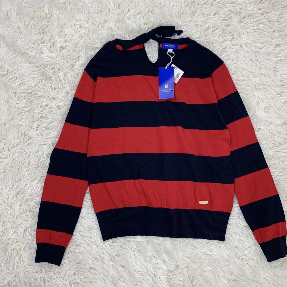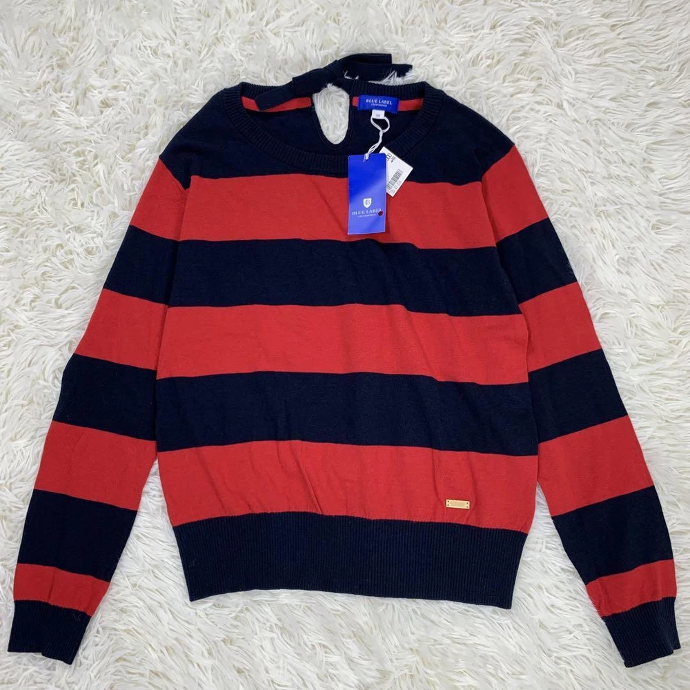 Burberry Blue Label Red Navy Striped Long Sleeve Sweater Size M New Tags Key Features **BURBERRY BLUE LABEL Striped Sweater** - **Brand:** Burberry Blue Label - **Product Type:** Long Sleeve Sweater - **Model:** Striped Design - **Price:** ¥15,400 (tax included) **Features:** - **Color:** Red and Navy Stripes - **Material:** 80% Cotton, 20% Wool - **Size:** M (38) - **Measurements:** - Length: Approx. 51 cm - Width: Approx. 43 cm - Shoulder Width: Approx. 42 cm - Sleeve Length: Approx. 53 cm - **Design:** Stylish and sophisticated with a back ribbon accent that enhances femininity. - **Comfort:** Made from soft material for all-day wear. **Condition:** - Gently used with minor folding wrinkles due to home storage. Please consider this before purchasing. Perfect for autumn, winter, and spring seasons. Specifications Brand Burberry Blue Label Country Japan Product Description Item Title With Tag Burberry Blue Label Striped Long Sleeve Sweater Red And Navy M Payment Supports managed payments Please pay within 5 days after auction is finished. About Us We are located in Japan. It's our pleasure to make you happy by proposing our recommend item. If you have any questions or request about items, please feel free to ask us. International Buyers - Please Note: -Import duties, taxes, and charges are not included in the item price or shipping charges. These charges are the buyer's responsibility. -Please check with your country's customs office to determine what these additional costs will be prior to bidding/buying. -These charges are normally collected by the delivering freight (shipping) company or when you pick the item up - do not confuse them for additional shipping charges. -We do not mark merchandise values below value or mark items as - gifts - The US and International government regulations prohibit such behavior. Thank you for your understanding.