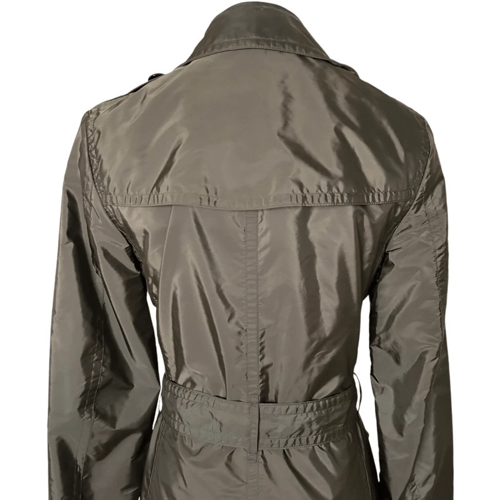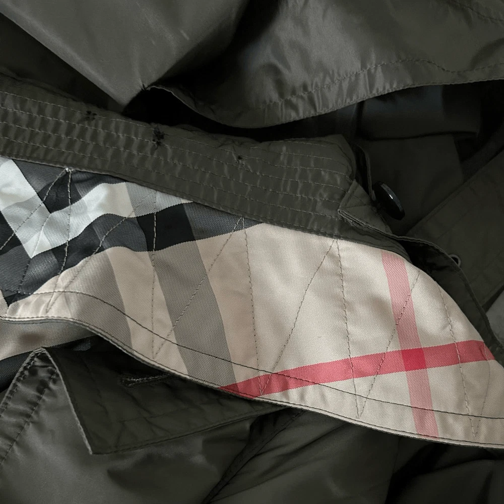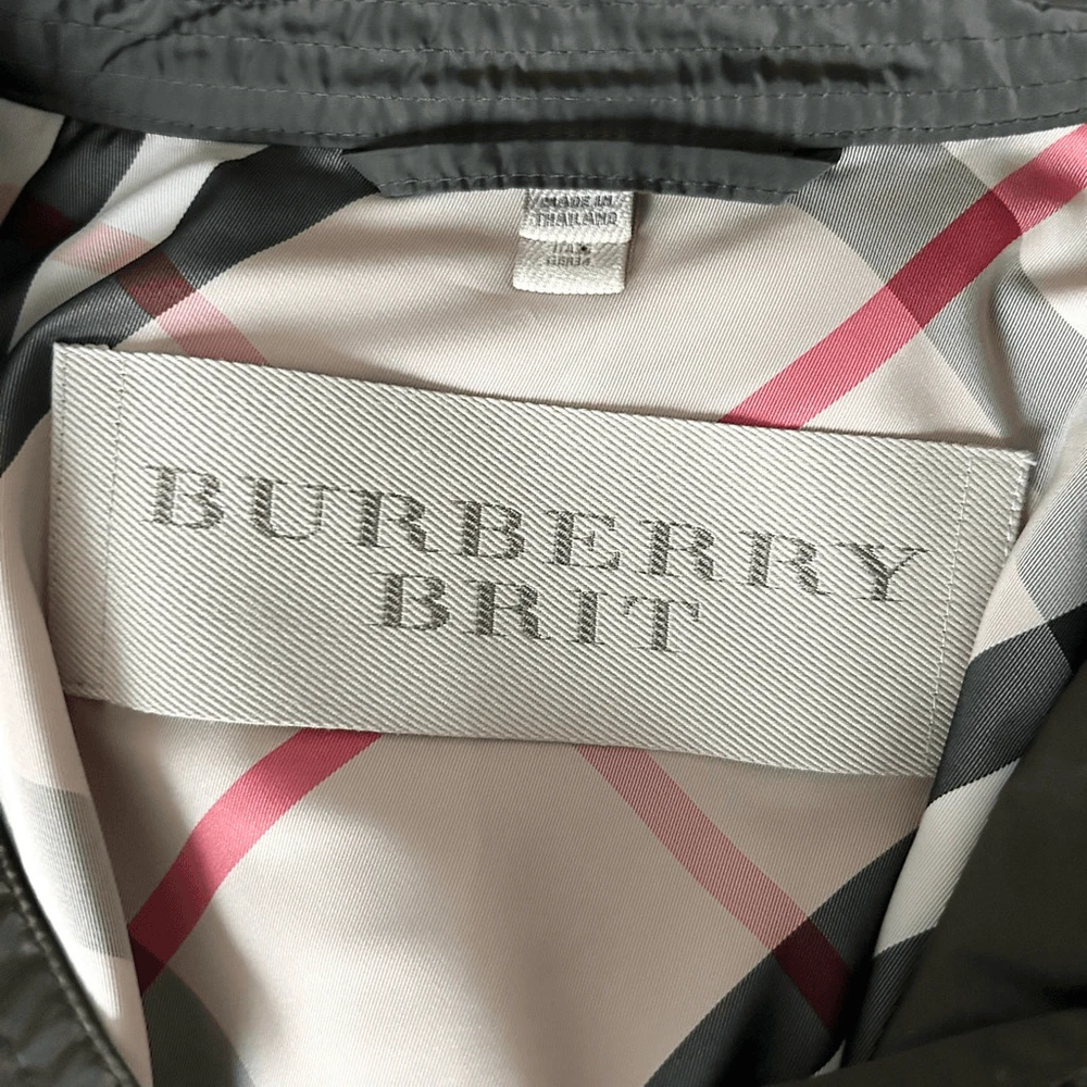 Brand: Burberry Color: Green Size: 4 Season: Fall, Spring, Winter Style: Trench Coat Sleeve Length: Long Sleeve Model: Burberry Brit Department: Women Exterior Color: Green Lining Material: Polyester Size Type: Regular Type: Coat Theme: Army Outer Shell Material: Polyamide Jacket/Coat Length: Long Features: Packable