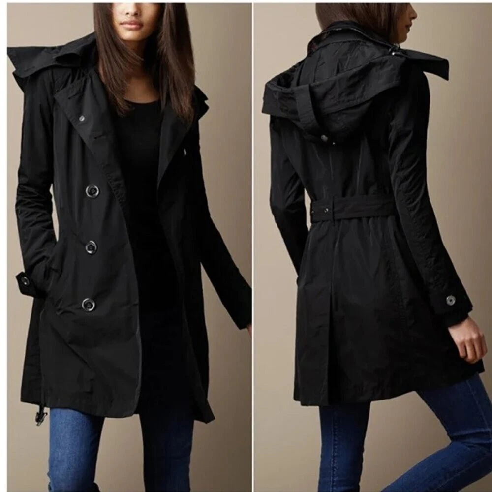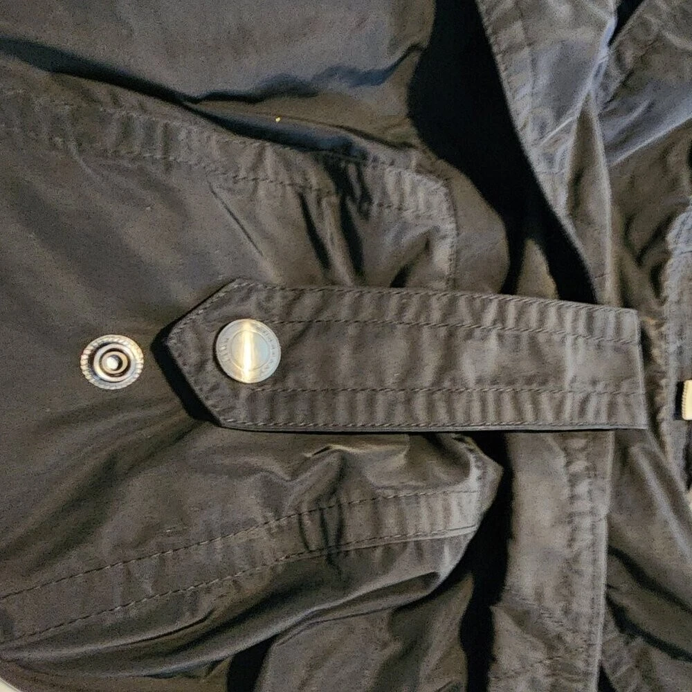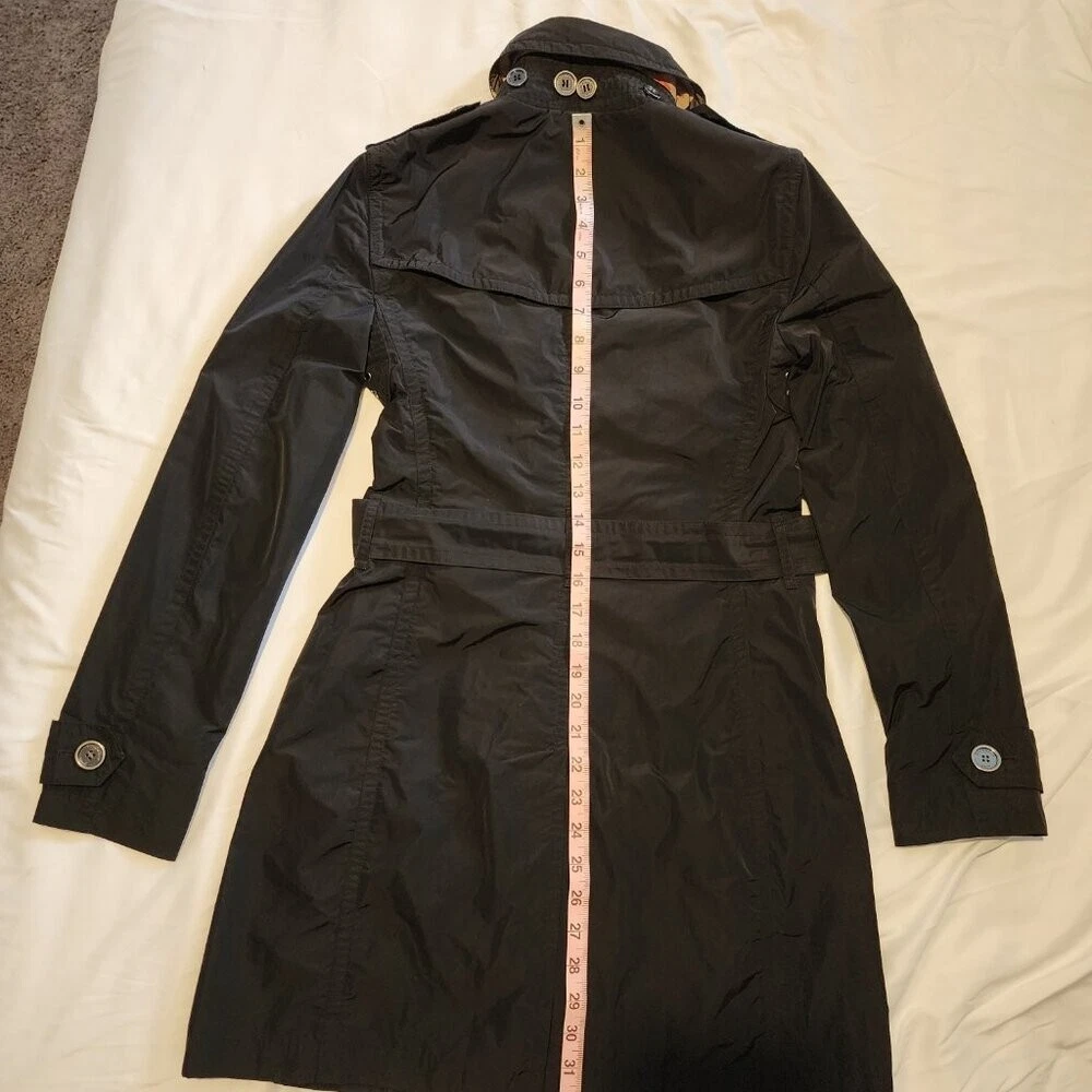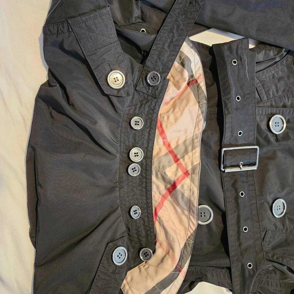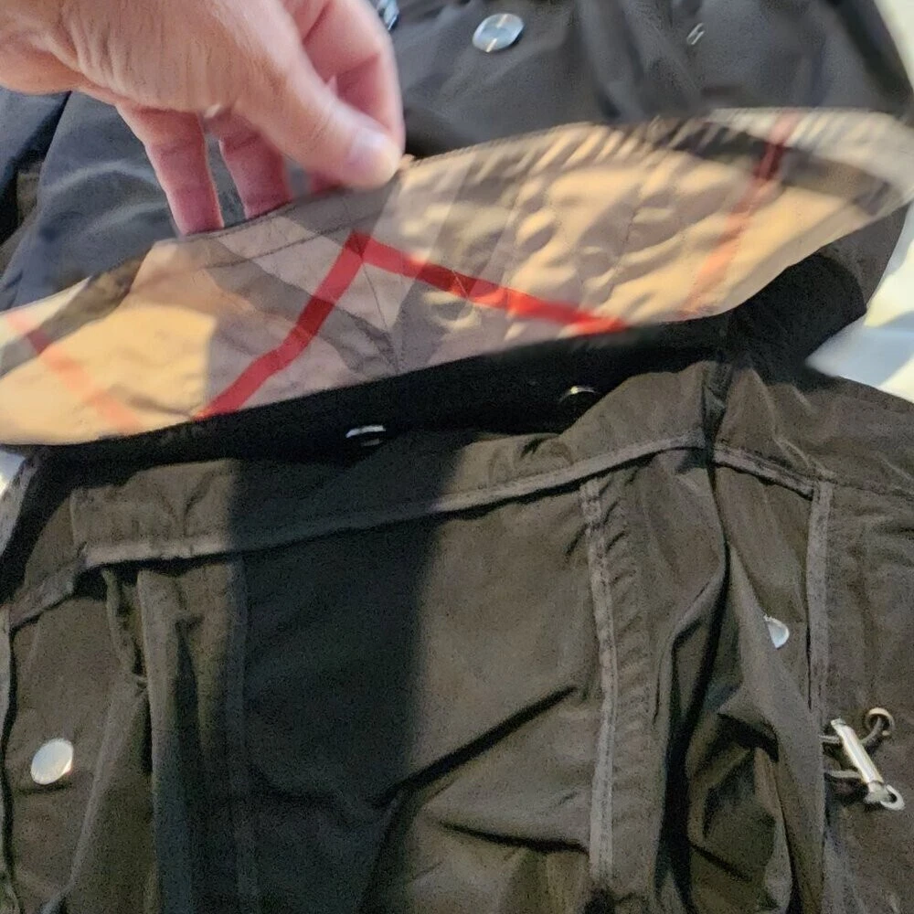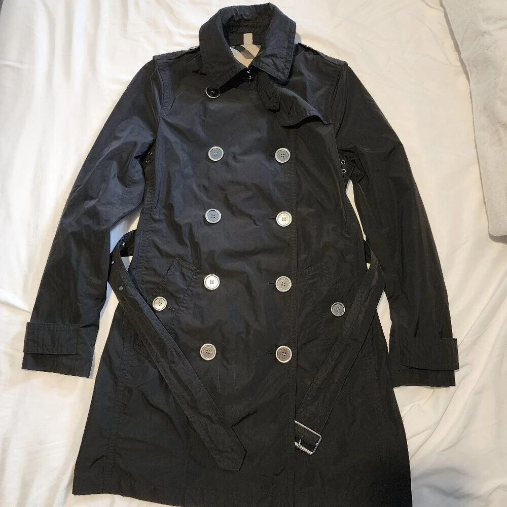Black classic nylon trench coat with hood detail, dark gunmetal buttons, and classic Burberry check interior inset and collar lining. All buttons and other hardware is original and intact. Original belt and hood included. Was $1,500 new at Nordstroms. Clean and from a smoke-free home. Open to REASONABLE offers.