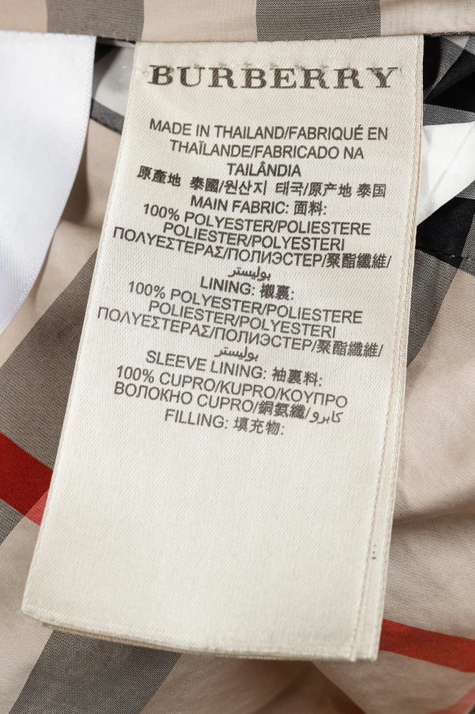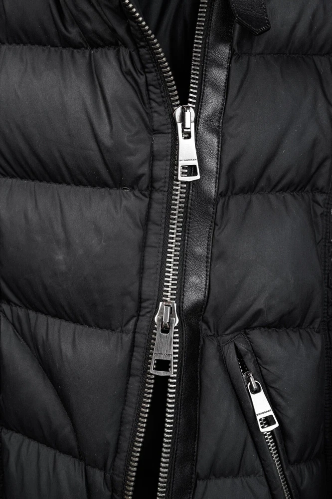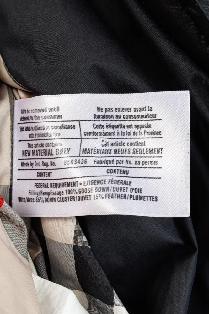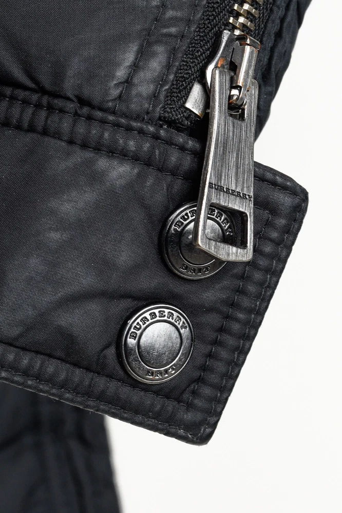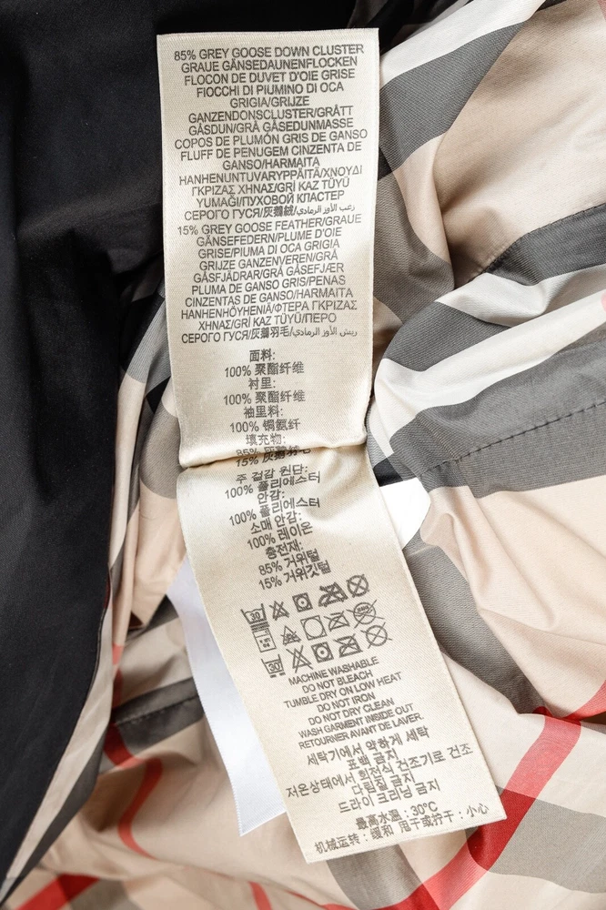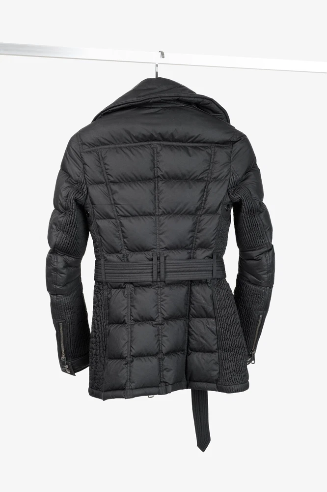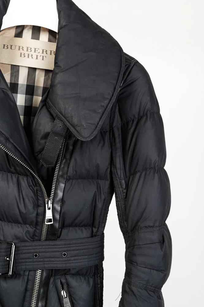 This puffer jacket from Burberry Brit is crafted in a quilted charcoal black synthetic insulated with goose down and feathers, and is trimmed with a tonal leather. It features long sleeves, zip and snap closures on the cuffs, snap-closure shoulder epaulettes, a collared neckline, a belted throat latch secured with snaps, an offset front zip closure with two pulls, a right zip chest pocket, a self belt, front zip pockets, shirring on the underarms and sides; and is lined in a check satin on the body, and a tonal satin on the sleeves. Size: XS Condition: Very good; tearing on armhole lining seams; some marking on neckline, sleeves, and back right hip; light discolouration on hardware. Approximate Measurements (laid flat): Shoulder: 14.5" (37 cm) Chest: 15.75" (40 cm) Waist: 13.5" (34 cm) Length from back: 26" (66 cm) Sleeve length: 23.75" (60 cm) Composition: Main fabric: 100% polyester. Lining: 100% polyester. Sleeve lining: 100% cupro. Filling: 85% grey goose down cluster, 15% grey goose feather.