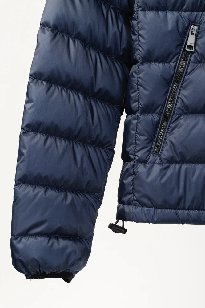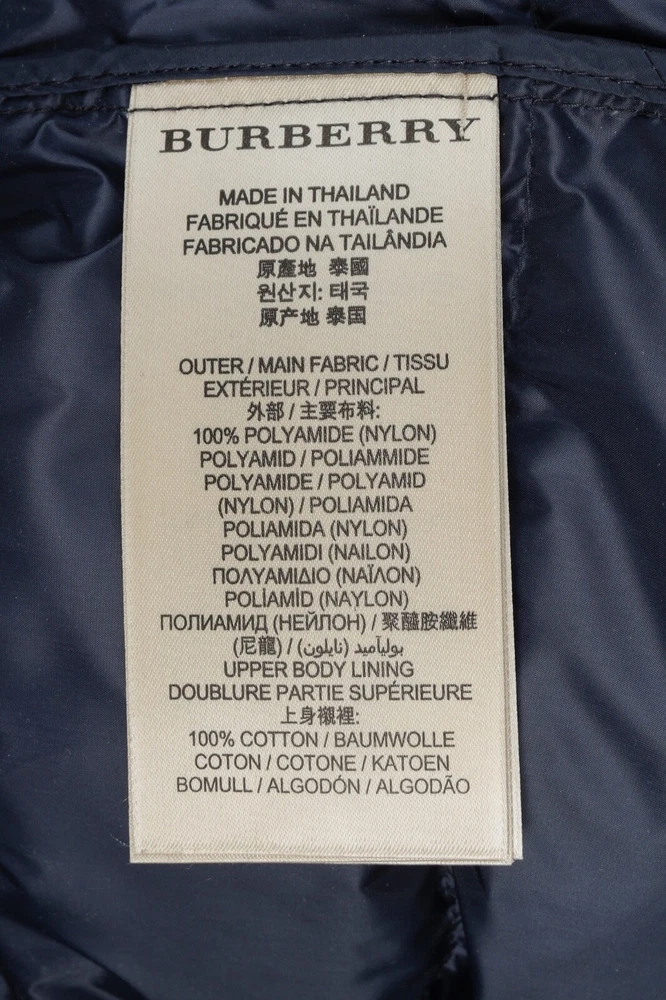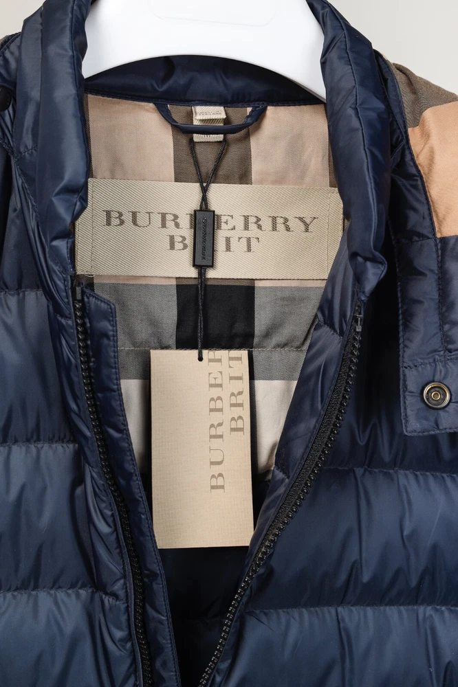 With a tailored fit and iconic Nova Check pattern, the Burberry Brit Mitchson Navy Blue puffer jacket is a stylish and functional choice. Made with lightweight quilted down, it offers excellent insulation for colder weather, and features long sleeves, elasticized cuffs, a stand collar with a detachable drawcord hood, a front zip closure, front zip pockets, and a drawcord hem. Stay warm and fashionable with this versatile jacket. Size: M Condition: New with tags. Approximate Measurements (laid flat): Shoulder: 18.5" (47 cm) Chest: 20.5" (52 cm) Length from back: 25" (63.5 cm) Sleeve length: 26.5" (67 cm) Composition: Outer/main fabric: 100% polyamide (nylon). Upper body lining: 100% cotton. Hood lining: 100% cotton. Lower body lining: 100% polyamide (nylon). Sleeve lining: 100% polyamide (nylon). Down content: 80% greylag goose grey down cluster, 20% greylag goose grey down feathers.