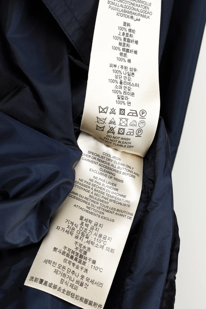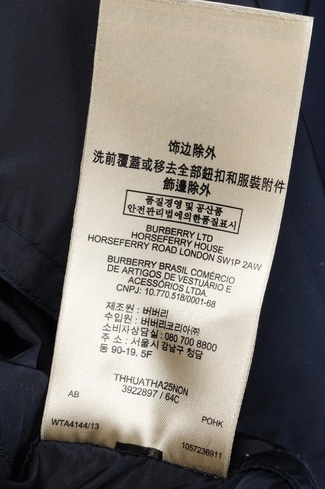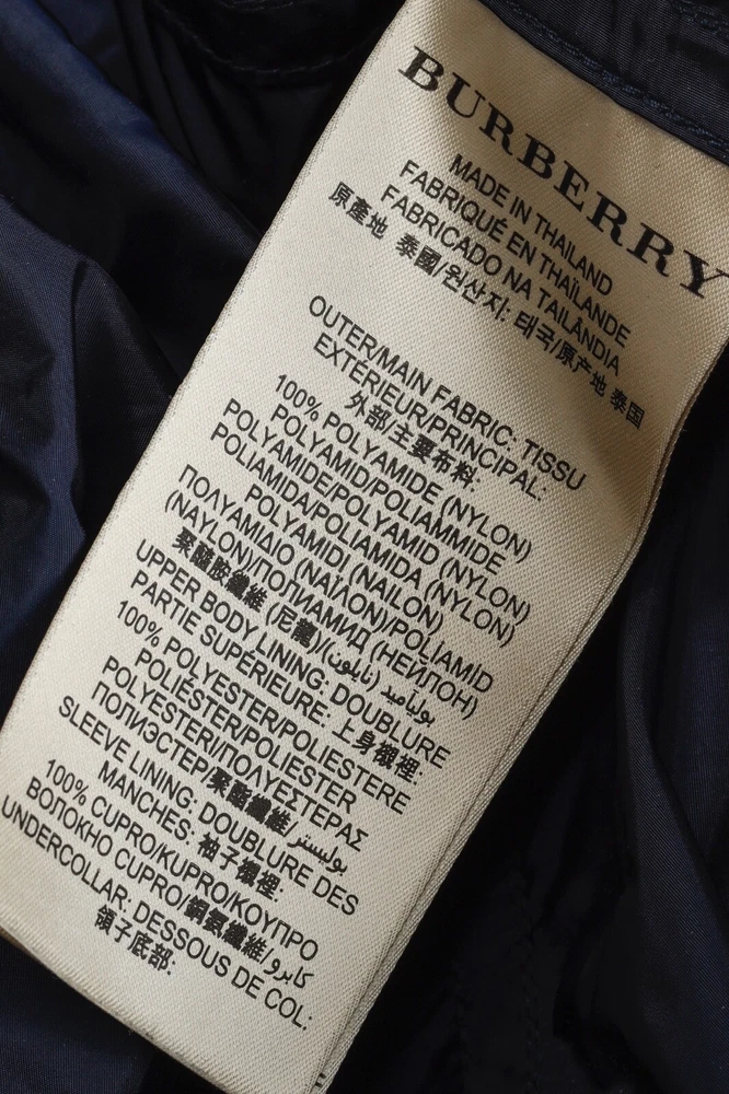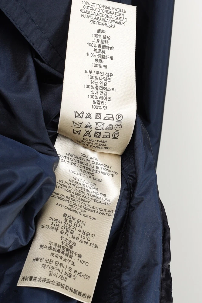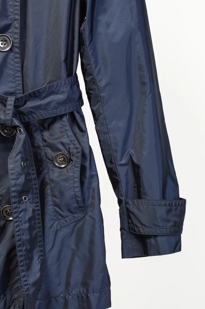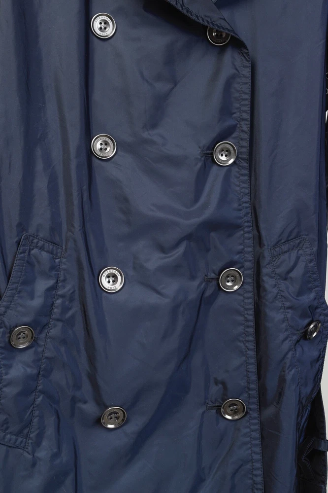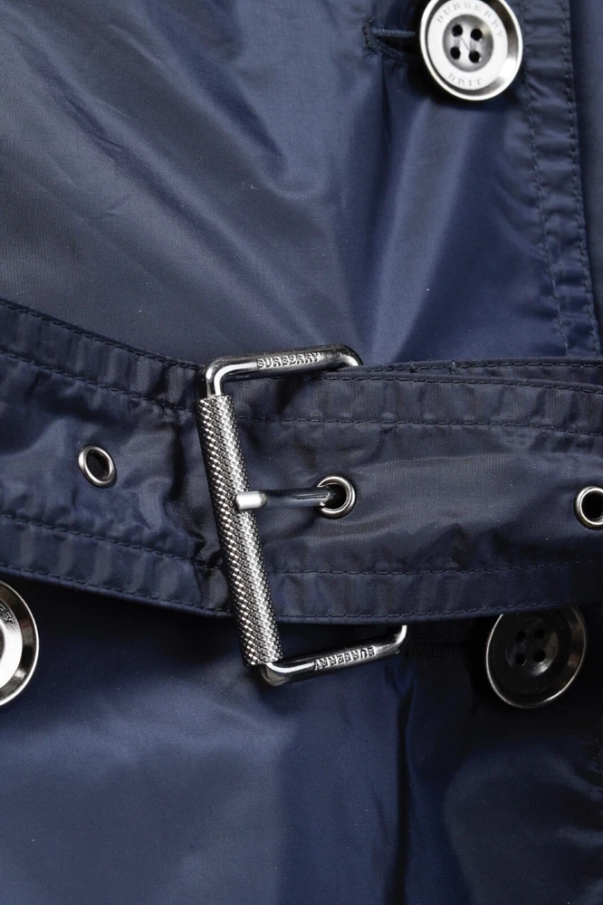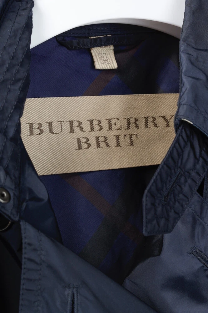 This rain coat from Burberry Brit is crafted in navy blue nylon, and features long sleeves, button-closure tabs on the cuffs, shoulder epaulettes, a collared neckline with an oversized hook closure and button-closure throat latch, double-breasted button closures, grommets for venting on the underarms, a self-belt, front button-closure pockets, a back vent, and is partially lined in a blue check synthetic on the bodice, and a tonal satin on the sleeves. Size: US 8 (M) Condition: Great; light marking on right chest, near left armhole, and front right hem Approximate Measurements (laid flat): Shoulder: 15" (38 cm) Chest: 19.5" (49.5 cm) Waist: 18.25" (46 cm) Length from back: 28.5" (72 cm) Sleeve length: 25" (63.5 cm) Composition: Outer/main fabric: 100% polyamide (nylon). Upper body lining: 100% polyester. Sleeve lining: 100% cupro. Undercollar: 100% cotton.