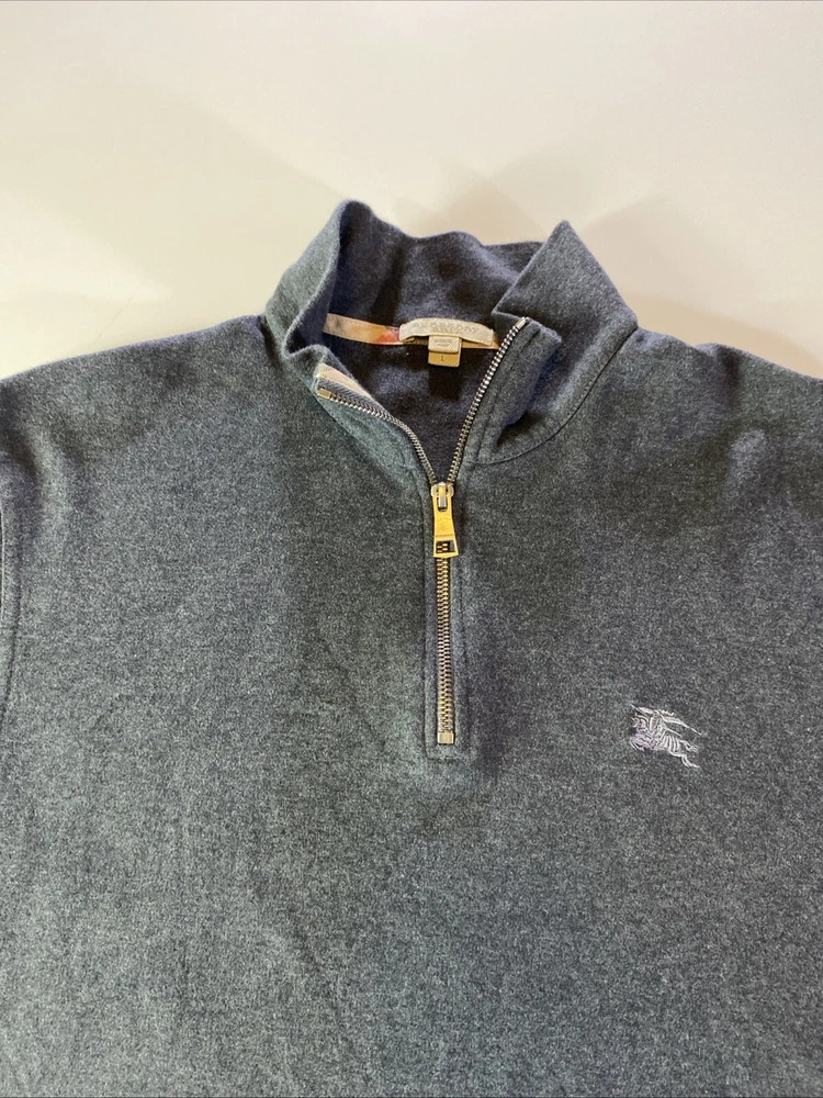 Elevate your wardrobe with this designer Burberry Brit sweatshirt. Crafted from 100% Pima cotton with a tight-knit pattern, this pullover features a high neck and long sleeves with a quarter zip for style and comfort. The black color and embroidered logo accents add a touch of sophistication, making it perfect for any occasion, from casual outings to business meetings to outdoor activities. Machine washable for easy care, this regular-fit sweatshirt is available in size L. Whether you're hiking in the mountains or attending a party in the city, this Burberry sweatshirt is a must-have addition to your wardrobe.