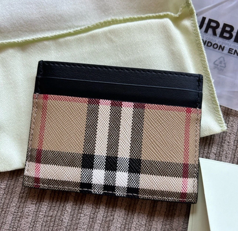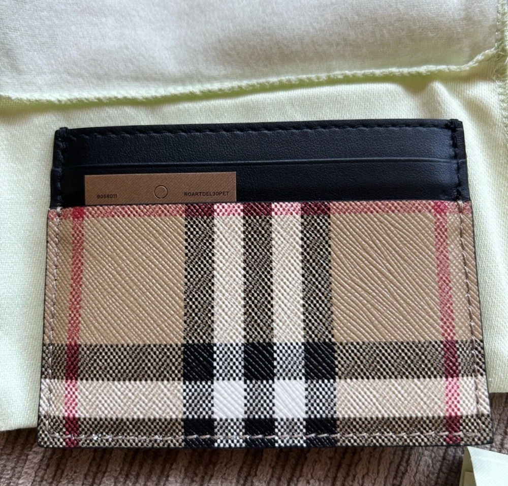 BURBERRY SANDON ARCHIVE BEIGE CHECK BLACKCANVAS CARD HOLDER WALLET NEW WITH TAGS