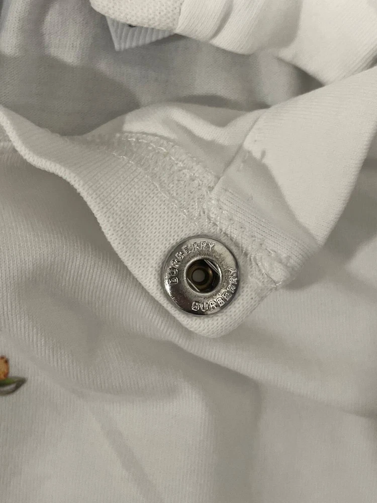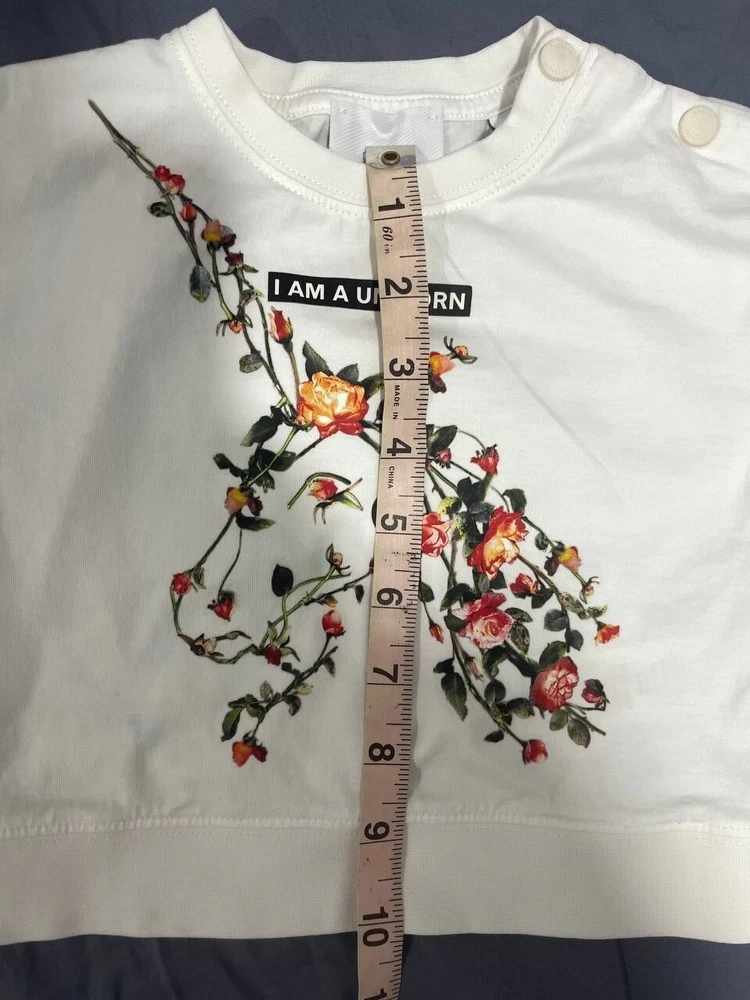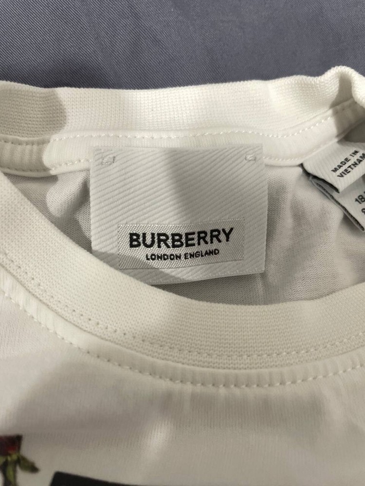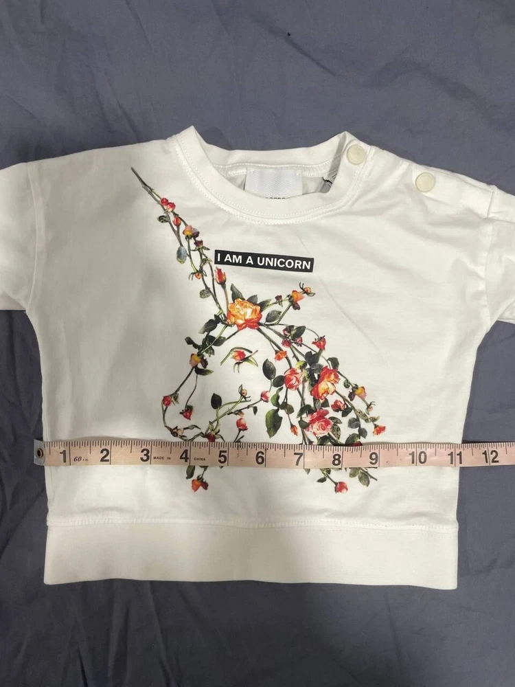 The Burberry Girls' Pia Floral Unicorn White Top in size 18M is a stylish and comfortable t-shirt made of 100% cotton. Featuring a charming floral pattern and a cute unicorn theme, this short-sleeve top with a crew neck and button closure is perfect for casual or travel occasions during the summer, fall, or spring seasons. The regular fit ensures a comfortable and easy-to-wear garment for young girls, while the renowned Burberry brand adds a touch of luxury to this basic yet trendy piece. Made in Vietnam, this machine washable top is a must-have for any fashion-forward child.