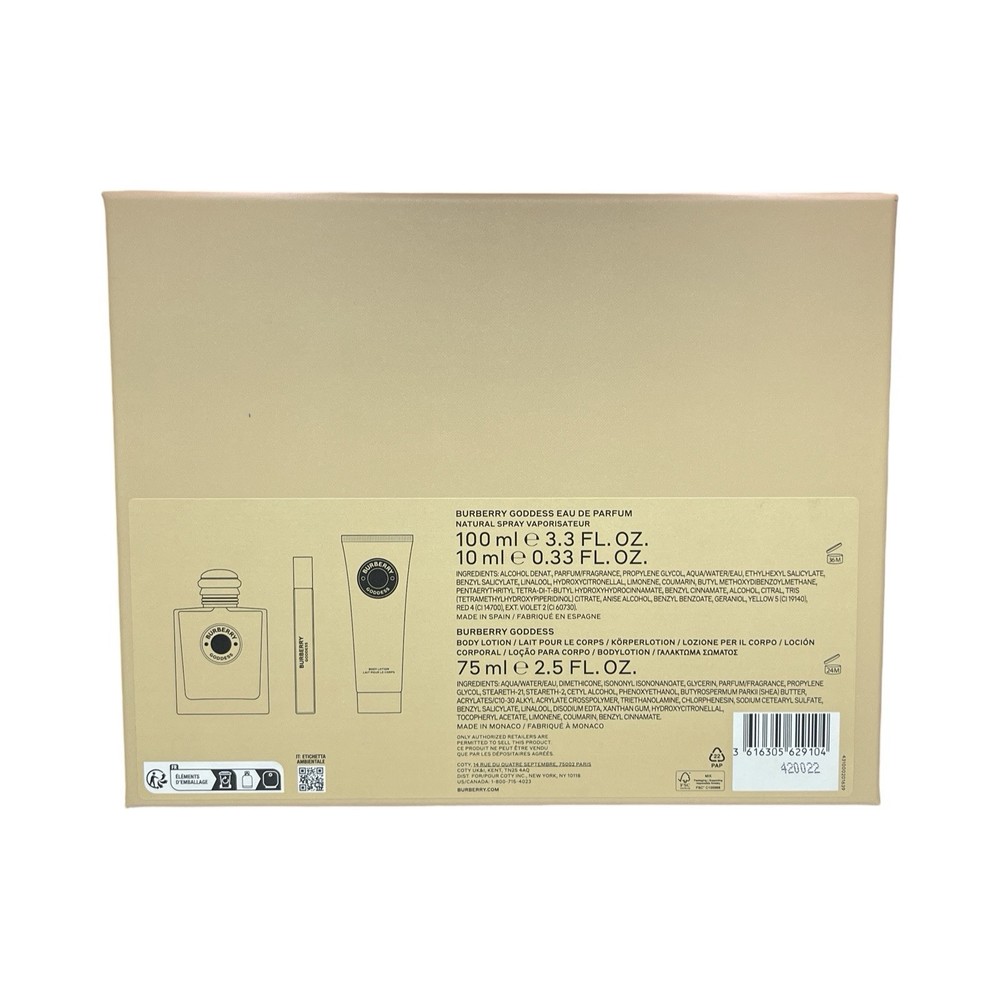 Burberry Goddess Eau de Parfum Gift Set 3-PC New* Condition: ORIGINAL, BRAND NEW, 100% AUTHENTIC Condition is New with box. Shipped with USPS Shipping: FREE! SET INCLUDES Burberry Goddess Eau de Parfum, 3.3 oz/ 100ml Burberry Goddess Body Lotion, 2.5 oz/ 75ml Burberry Goddess Spray, 0.3 oz/ 10ml KEY NOTES Top notes: Vanilla Infusion, Lavender Middle note: Vanilla Caviar Base note: Vanilla Absolute Return Policy: All our products are authentic. If you are unhappy with your purchase, please message me directly to request a refund or return within 7 days after receiving your item. The item must be in the original box upon return, used items will not be eligible for returns or exchanges. If the item is used, returns will not be accepted, and buyer will not receive refund. Thank you for your business!