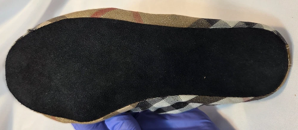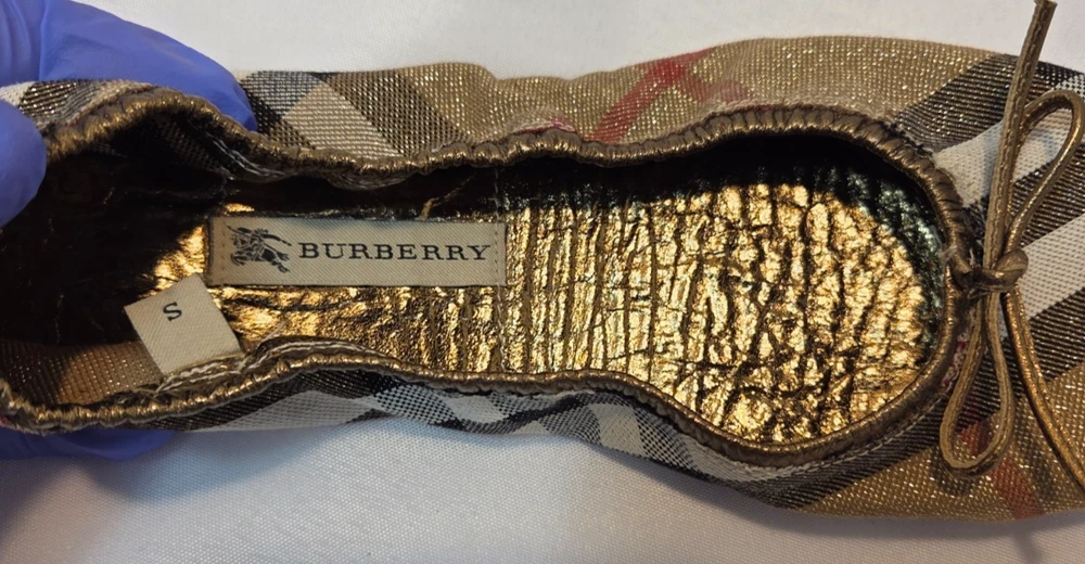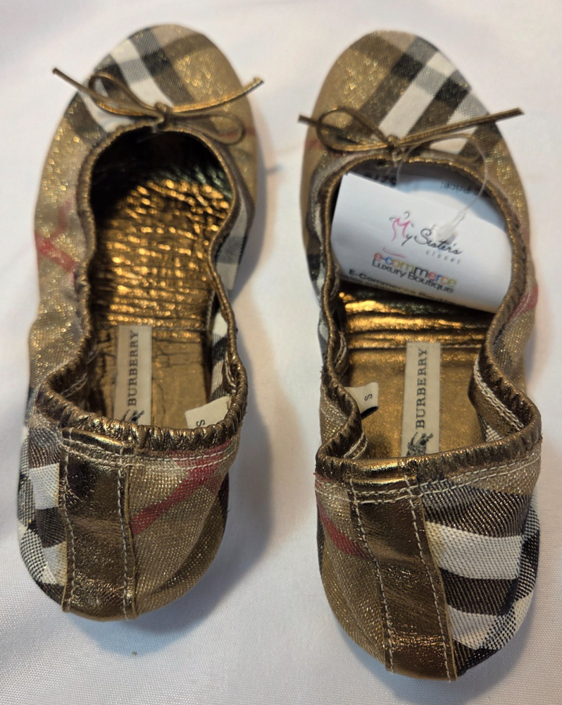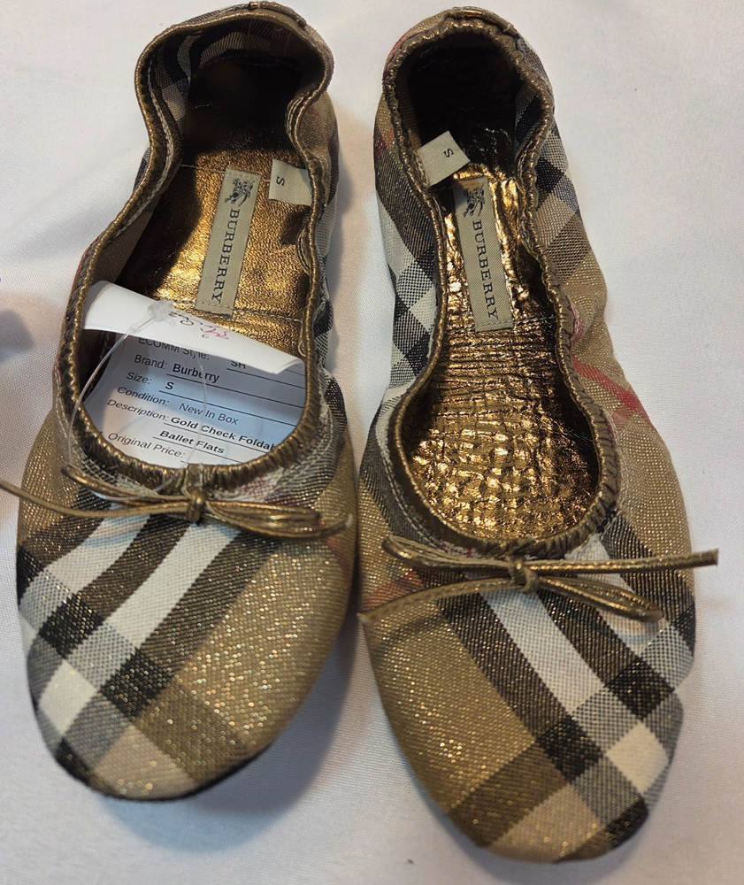 Burberry Gold Check Foldable Ballet Flats Size S Brand: Burberry Overall Condition: New in box. See pictures for details. Materials: Nylon and man made materials. Shipped with USPS Priority, Flat Rate or, when possible, First Class Mail. Description: Burberry gold check foldable ballet flats are luxurious, travel-friendly shoes often featuring the iconic Nova or House Check canvas paired with metallic gold leather trim. These slip-on, scrunched-silhouette flats typically feature a comfortable elasticated opening, a round toe, and a dainty bow detailKey details of these ballet flats include: Design & Material: A combination of durable Check canvas and metallic gold leather, designed with a flexible, foldable structure. Signature Style: Features the distinctive Burberry check pattern (Nova or Vintage), often trimmed with leather and accented with a small bow on the vamp. Comfort Features: A scrunched or elasticated topline ensures a snug, comfortable fit. Versatility: Designed as a compact, "travel" flat, suitable for easy packing. Details for Shopper Size: S Shoes Width: 3 inches wide Shoe Length: 9.5 inches Heel Height: Flat Heel Type: Flat Toe Style: Closed Round Toe Payment Policies We accept payment through PayPal, credit card, and debit card. Please note that the item may be relisted if payment is not received within the 10 day period. Shipping Policies Delivery estimates will be displayed at checkout. In-store pickup is also available if you would like to visit us in store. We ship to Continental United States only. Terms of Sale Each item we sell is unique. There are no exchanges for the same item available. All items are carefully inspected by My Sister’s Closet of Monroe County’s quality control team prior to shipping. Please carefully review item details. If you have questions, please message us regarding the item before purchasing. Note: Due to the different monitor and light effects, the actual color of the item shown might be slightly different from the color in pictures. Return Policy We strive to describe and measure our items accurately. If your order is not what you expected, we accept returns under the following conditions: The item was not as described as listed The wrong item was shipped. The item does not fit. If the wrong item was shipped, we will attempt to replace it with the item originally ordered. Please note - items not returned in the exact same condition, with tags attached, may be subject to a partial refund to account for loss of the item’s value. Please refer to eBay Return policy for more details. You are covered by the eBay Money Back Guarantee if you receive an item that is not described as listed. Return Requirements: The buyer must return the item within 30 days of receipt. Buyer is responsible for return shipping charges. The item(s) must be returned in the original condition, unworn, with tags attached. Thank you for shopping with us! A little bit more about us… My Sister’s Closet is a nonprofit serving women in poverty since 1998. Our mission is to help women move closer to economic self-sufficiency by providing essential career development tools. This includes job training, mentoring, advocacy services, and professional attire for job interviews to help them find employment. We have helped over 2500 women thus far. Most clients we serve have been dealing with homelessness, domestic violence, illness, divorce, job loss, economic recovery and/or lack basic education. Visit Our eBay Store
