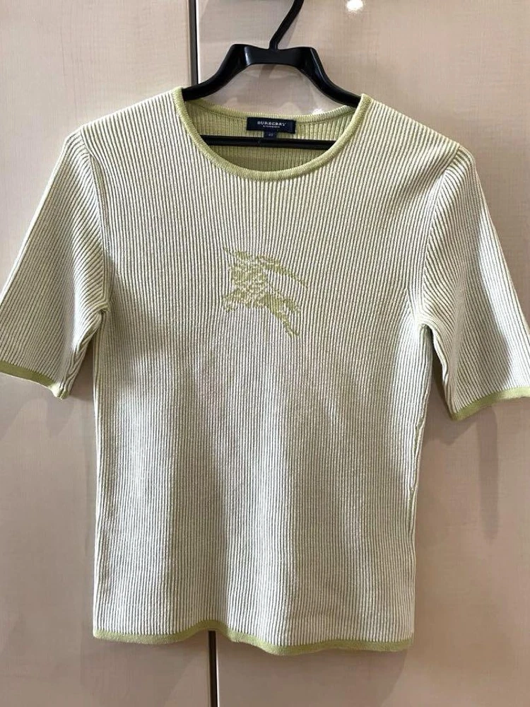 Burberry Green Ribbed Knit Top Size M Lightweight Cotton Summer Wear Key Features **Burberry Short Sleeve Ribbed Knit Top** - **Brand**: Burberry - **Type**: Short Sleeve Ribbed Knit - **Color**: Light Green - **Size**: Suitable for M (Compact fit, ideal for S/M wearers) - **Material**: 100% Cotton - **Features**: - Lightweight summer knit fabric - Stretchable with a soft texture - Worn only 2-3 times, no visible stains or pilling - **Measurements** (approximate): - Shoulder Width: 34 cm - Bust Width: 40 cm - Length: 55 cm Explore more clothing options from various brands in our listings! Specifications Brand Tomorrowland Country Japan Product Description Item Title Burberry Tops Ralph Lauren Baby Beams Payment Supports managed payments Please pay within 5 days after auction is finished. About Us We are located in Japan. It's our pleasure to make you happy by proposing our recommend item. If you have any questions or request about items, please feel free to ask us. International Buyers - Please Note: -Import duties, taxes, and charges are not included in the item price or shipping charges. These charges are the buyer's responsibility. -Please check with your country's customs office to determine what these additional costs will be prior to bidding/buying. -These charges are normally collected by the delivering freight (shipping) company or when you pick the item up - do not confuse them for additional shipping charges. -We do not mark merchandise values below value or mark items as - gifts - The US and International government regulations prohibit such behavior. Thank you for your understanding.