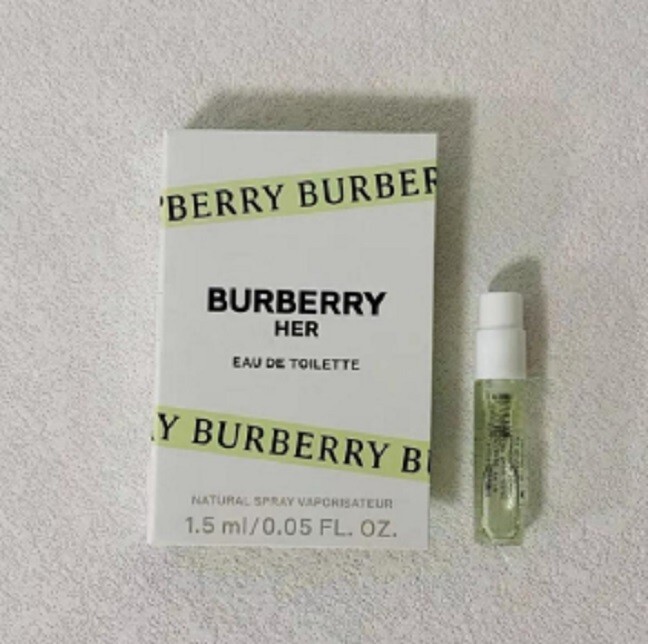 2x s Burberry Her Women's Perfume SAMPLE 1.5ml / .05fl oz Carded Fragrance Vial Spray GREAT for travel TWO samples 1.5ml / .05fl oz Carded. Burberry Her Burberry for women main accords fruity sweet woody musky powdery Burberry Her by Burberry is a Floral Fruity Gourmand fragrance for women. Burberry Her was launched in 2018. The nose behind this fragrance is Francis Kurkdjian. Top notes are Strawberry, Raspberry, Blackberry, Sour Cherry, Black Currant, Mandarin Orange and Lemon; middle notes are Violet and Jasmine; base notes are Musk, Vanilla, Cashmeran, Woody Notes, Amber, Oakmoss and Patchouli.