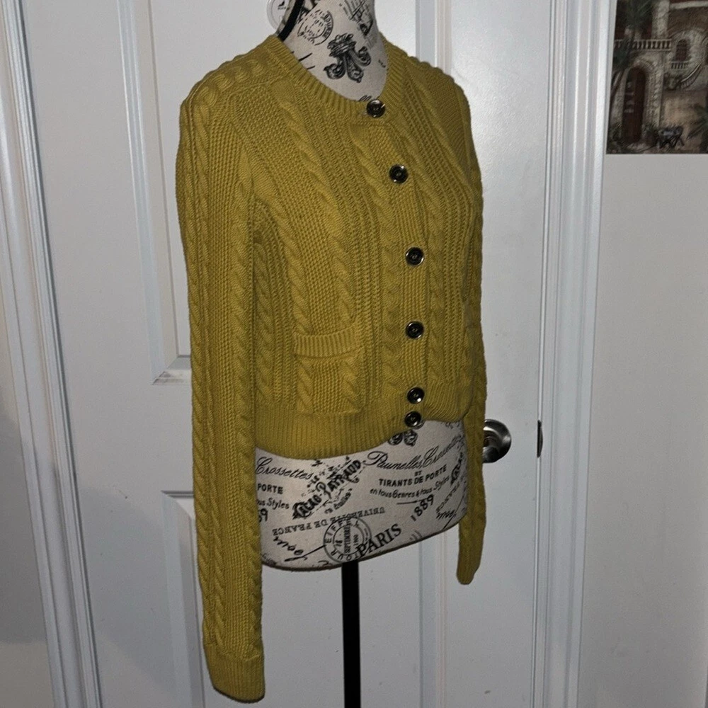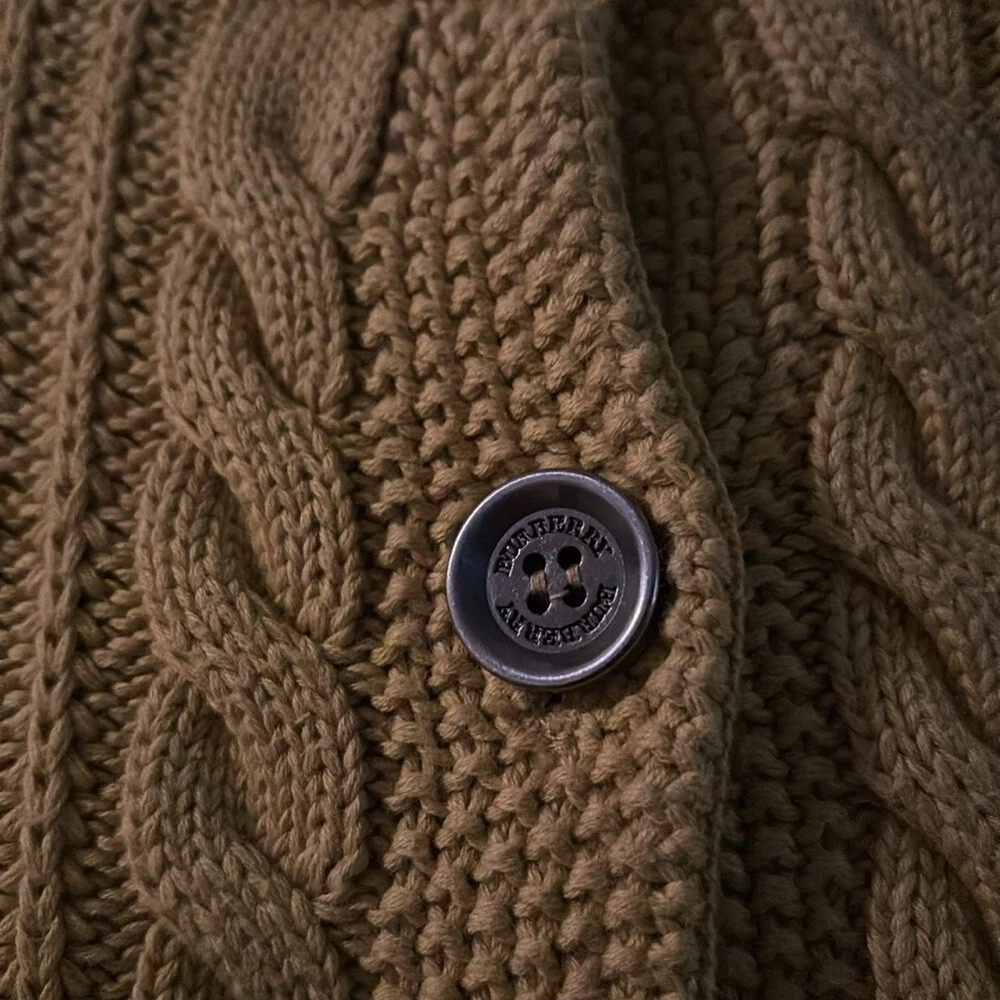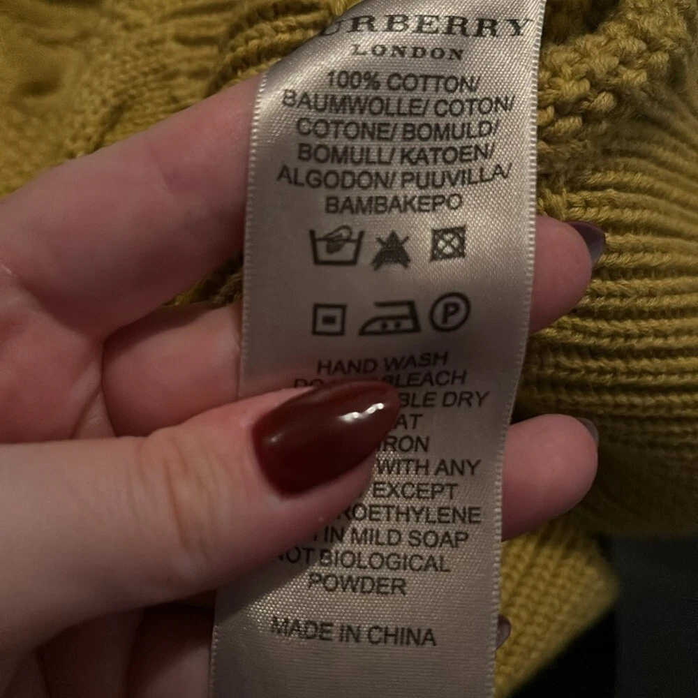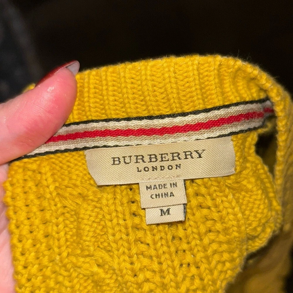 This vintage cardigan from Burberry London is an authentic piece that will add a touch of elegance to any outfit. The cable-knit design is beautifully crafted and the yellow color is vibrant enough to catch anyone's eye. The cardigan is of size M and is perfect for regular size types. It is made of high-quality material and is perfect for women who want to add a stylish touch to their wardrobe. The cardigan is versatile enough to be worn for any occasion and is a must-have for any fashion-conscious woman. Very good preowned condition. Runs small, I would say this is more of a size small than medium. 100% cotton.