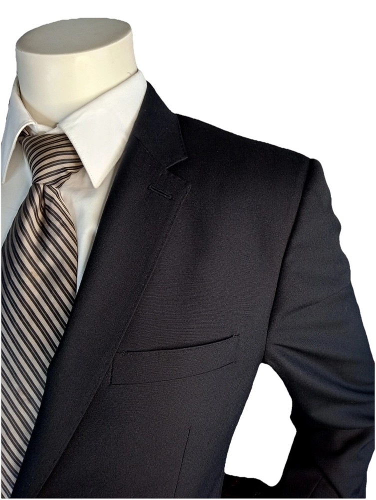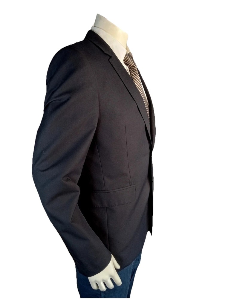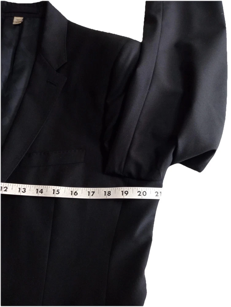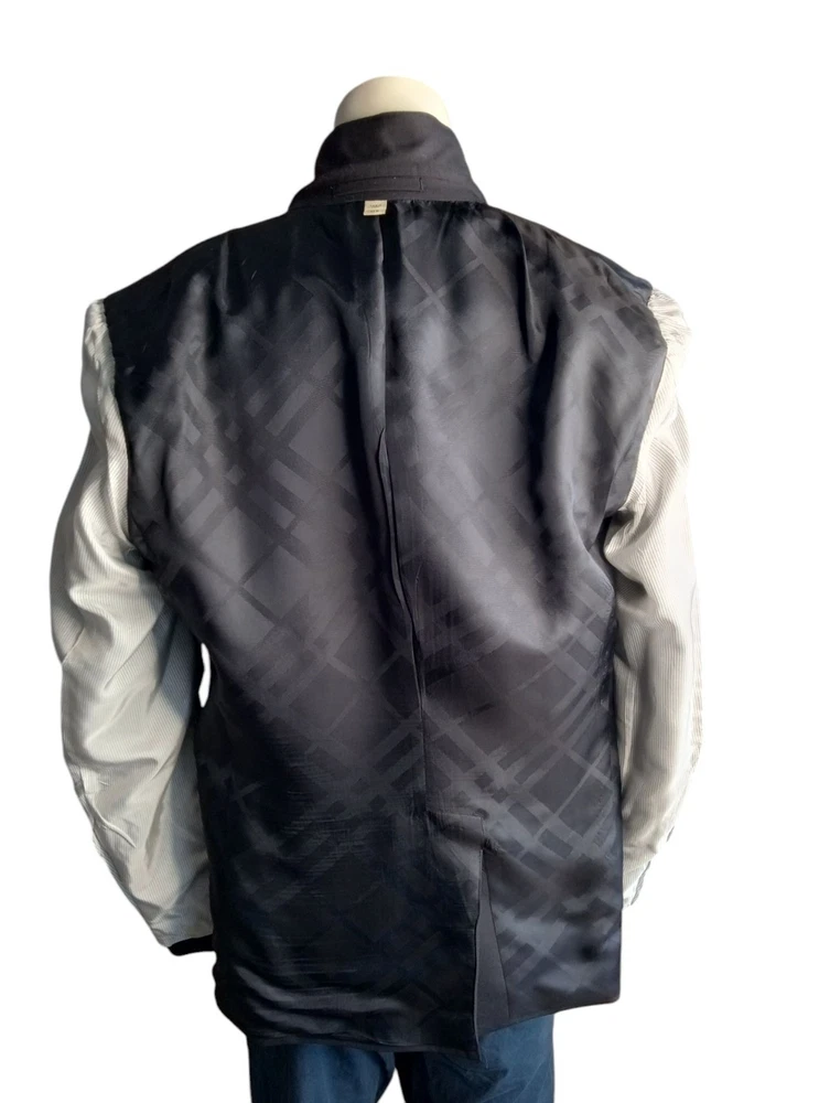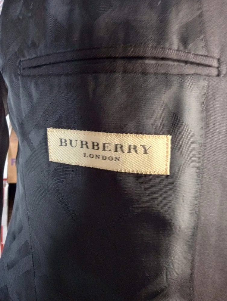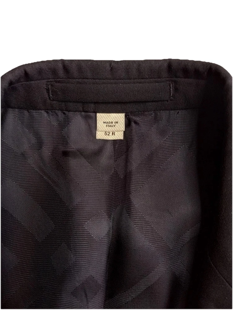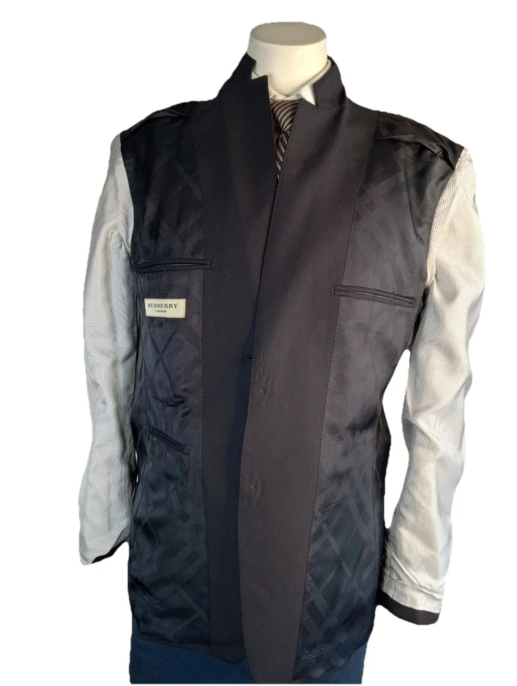 The Burberry London Blazer is a classic and stylish designer jacket made in Italy, crafted from high-quality wool in a sophisticated black color. This single-breasted blazer features a notch lapel style, four-button sleeve button style, and a regular fit for a smart and timeless look. With its single vented back and inner pockets, this blazer is perfect for both casual and formal occasions during the winter and fall seasons. The Burberry London brand ensures exceptional quality and style that will elevate any man's wardrobe with its sport coat design.