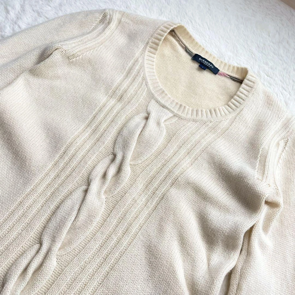 Burberry London Cashmere Blend Cable Knit Sweater Ivory Size M New Key Features **Burberry London Sweater - Center Cable Design** - **Brand:** Burberry London - **Product Type:** Sweater - **Model:** Center Cable - **Color:** Ivory - **Material:** 73% Wool, 27% Cashmere - **Size:** 1 (M) - **Measurements:** - Length: Approximately 65 cm - Shoulder Width: Approximately 35 cm - Chest Width: Approximately 40 cm - Sleeve Length: Approximately 62 cm **Features:** - Soft and fluffy texture - Classic round neck design - Longer sleeves for added comfort **Condition:** - Pre-owned item - In good condition with some minor fraying; please refer to photos for details before purchasing. *Note: This item is sourced from a reputable recycling shop.* Specifications Brand Burberry London Country Japan Product Description Item Title Soft To The Touch Burberry London Cashmere Blend Sweater Cable Knit Hose Embroid Payment Supports managed payments Please pay within 5 days after auction is finished. About Us We are located in Japan. It's our pleasure to make you happy by proposing our recommend item. If you have any questions or request about items, please feel free to ask us. International Buyers - Please Note: -Import duties, taxes, and charges are not included in the item price or shipping charges. These charges are the buyer's responsibility. -Please check with your country's customs office to determine what these additional costs will be prior to bidding/buying. -These charges are normally collected by the delivering freight (shipping) company or when you pick the item up - do not confuse them for additional shipping charges. -We do not mark merchandise values below value or mark items as - gifts - The US and International government regulations prohibit such behavior. Thank you for your understanding.
