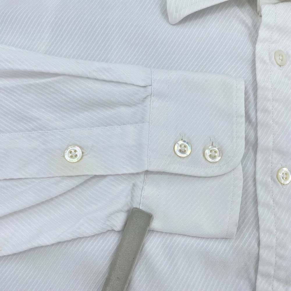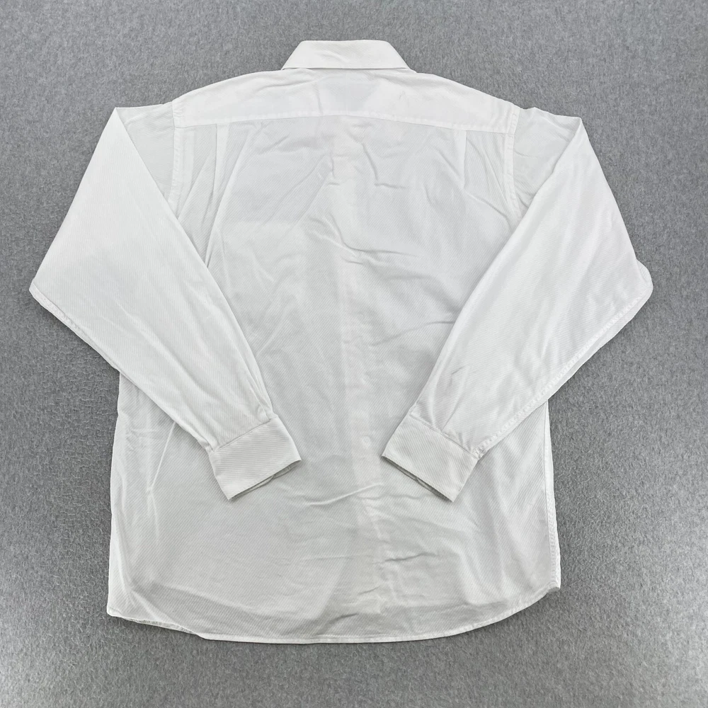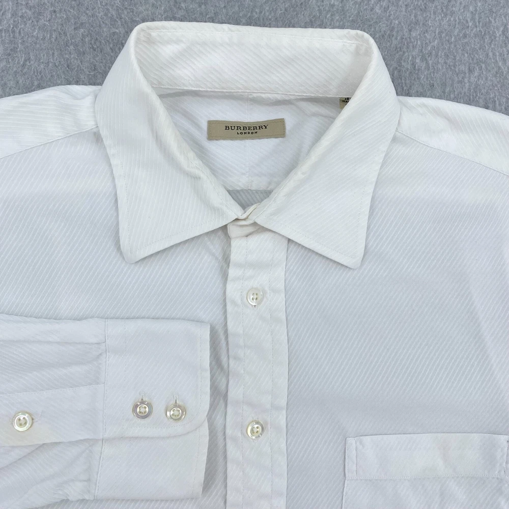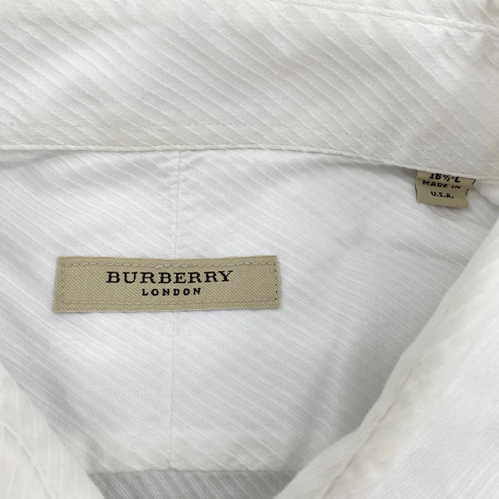 Size: L Closure: Button Fabric Wash: Medium Collar Style: Spread Theme: 20s, 50s, 60s, 70s, 80s, 90s, City, Classic, College, Computer & Office, Dad, Designer, Food & Drink, Fun, Geek, Hipster, Italian, Korean, London, Modern, Nerd, Preppy, Retro, School, Special Occasion, USA, Wedding Brand: Burberry London Type: Dress Shirt Sleeve Length: Long Sleeve Size Type: Regular Features: Adjustable, All Seasons, Breathable, Easy Care, Lightweight, Packable Garment Care: Machine Washable Material: 100% Cotton Pattern: Solid Department: Men Fabric Type: Woven Handmade: No Neckline: Collared Seller Notes: “Pre-owned condition; heavily used shirt, blemishes around collar and sleeves (see photos)” Accents: Button, Logo Fit: Regular Occasion: Business, Casual, Formal, Party/Cocktail, Travel, Wedding, Workwear Color: White Neck Size: 16.5 in Vintage: No Top Cuff Style: Barrel Cuff