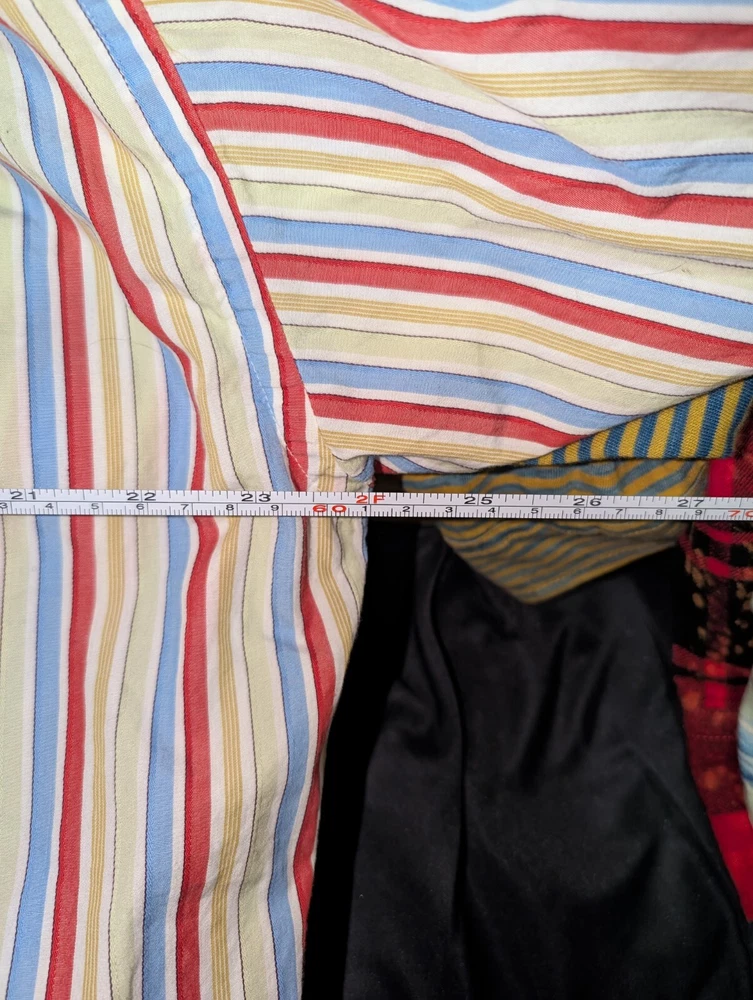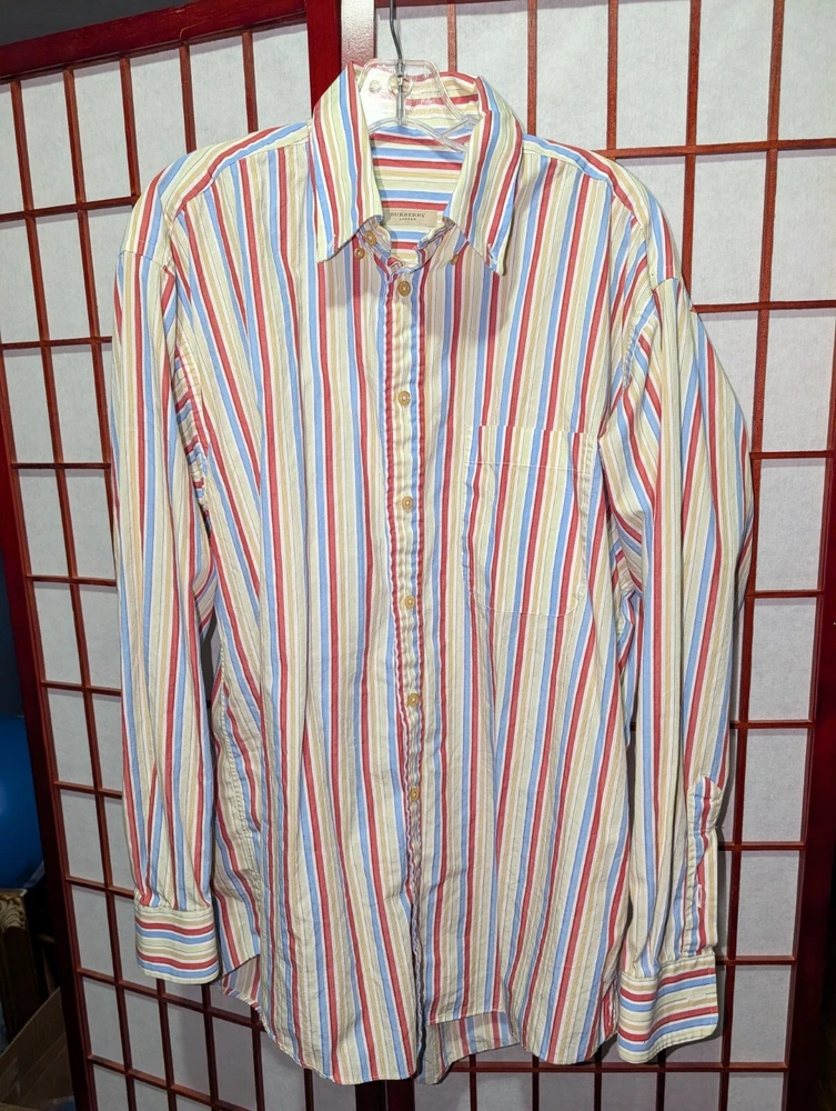 Length 32.5" Chest 48" Crafted by Burberry London, this Large button-down shirt is a versatile addition to any wardrobe. Featuring a classic fit with long sleeves, it boasts a timeless striped pattern in a multicolor palette, suitable for a range of occasions from casual outings to business settings. The shirt is designed with a comfortable button-down collar and a neat button closure, ensuring a polished look. The shirt is made from high-quality woven cotton, allowing for breathability and ease of care—machine washable for convenience. With a chest size of 48 inches, it caters to a regular size L, fitting seamlessly into the everyday style of the modern man. Made in the United States, this piece maintains a sense of USA-themed sophistication without compromising on comfort.