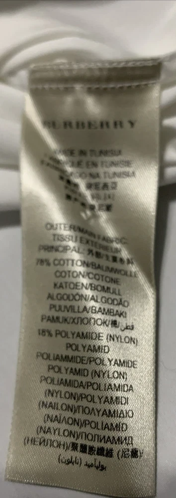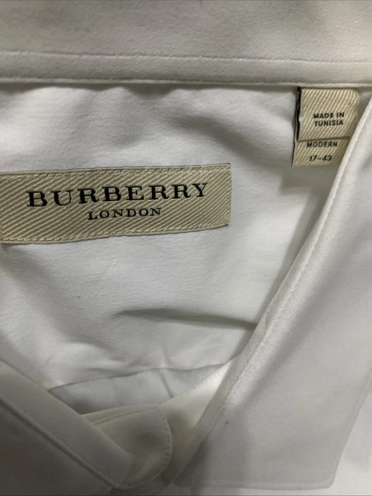 The Burberry London White Button Up Shirt is a stylish and sophisticated men's dress shirt designed for formal occasions. Made in Tunisia, this shirt features a solid white color and a classic fit with a collared neckline, long sleeves, and button closure. The light fabric wash and blended fabric of polyamide and cotton ensure comfort and durability. With its designer brand and London theme, this shirt exudes a timeless and elegant style perfect for weddings, business meetings, or any formal event. The size 17-43 and regular size type make it a versatile option for any man's wardrobe.