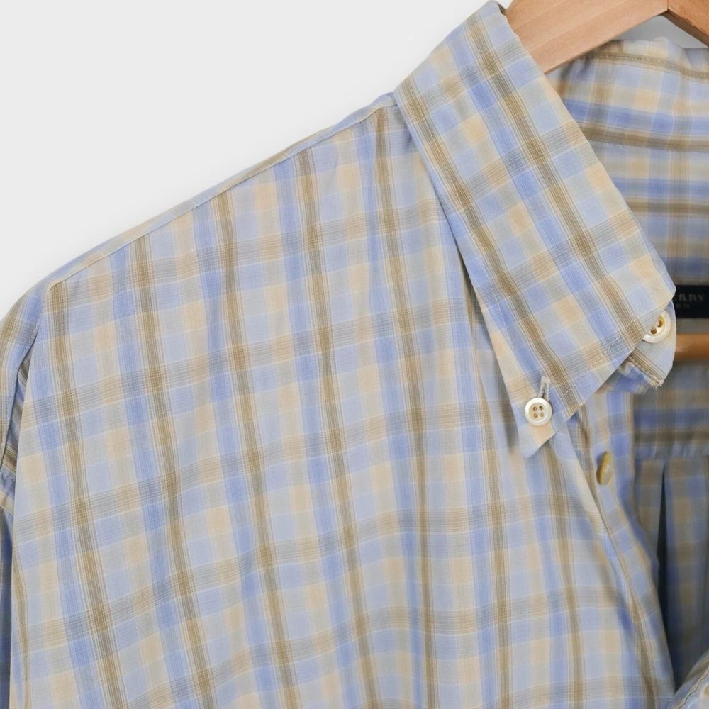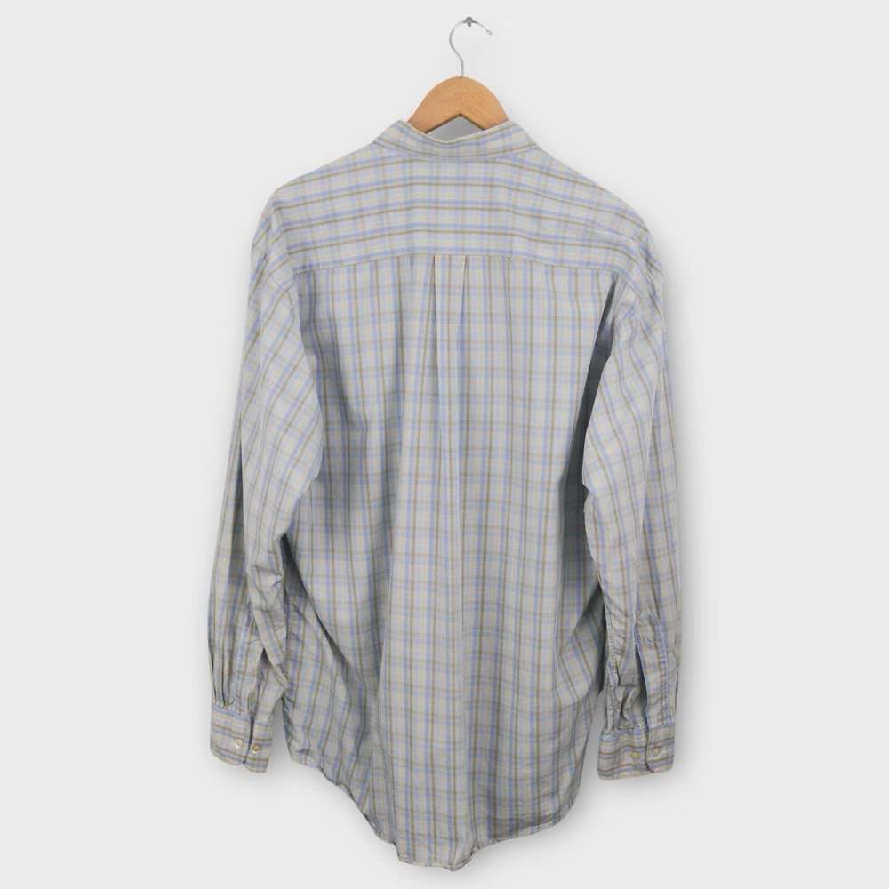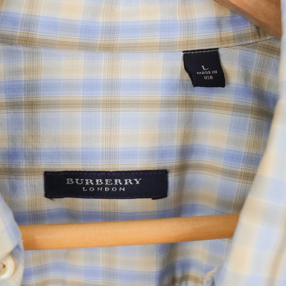 Elevate your style with this Burberry London Nova Check Plaid Button Shirt. The shirt features a collared neckline, button closure, and long sleeves. The plaid pattern in blue and beige adds a classic touch to the shirt, making it perfect for any occasion, whether it be a party, cocktail, business meeting, or casual outing. Made from 100% cotton, this shirt is easy to care for, packable, and suitable for all seasons. It also comes with pockets and is double-sided, making it a practical and stylish addition to your wardrobe. The shirt is a size large, with a chest size of 52 inches, and is a regular fit. Buy this designer shirt from Burberry London today and add a touch of London classic to your wardrobe. Tag Size: Large Best Fit: * Men: L Approximate Flat Measurements: * Chest: 26” * Length: 31” * Material: Cotton Condition: No Noticeable Flaws All items are second hand, many being vintage and may have small imperfections. Anything major is noted.