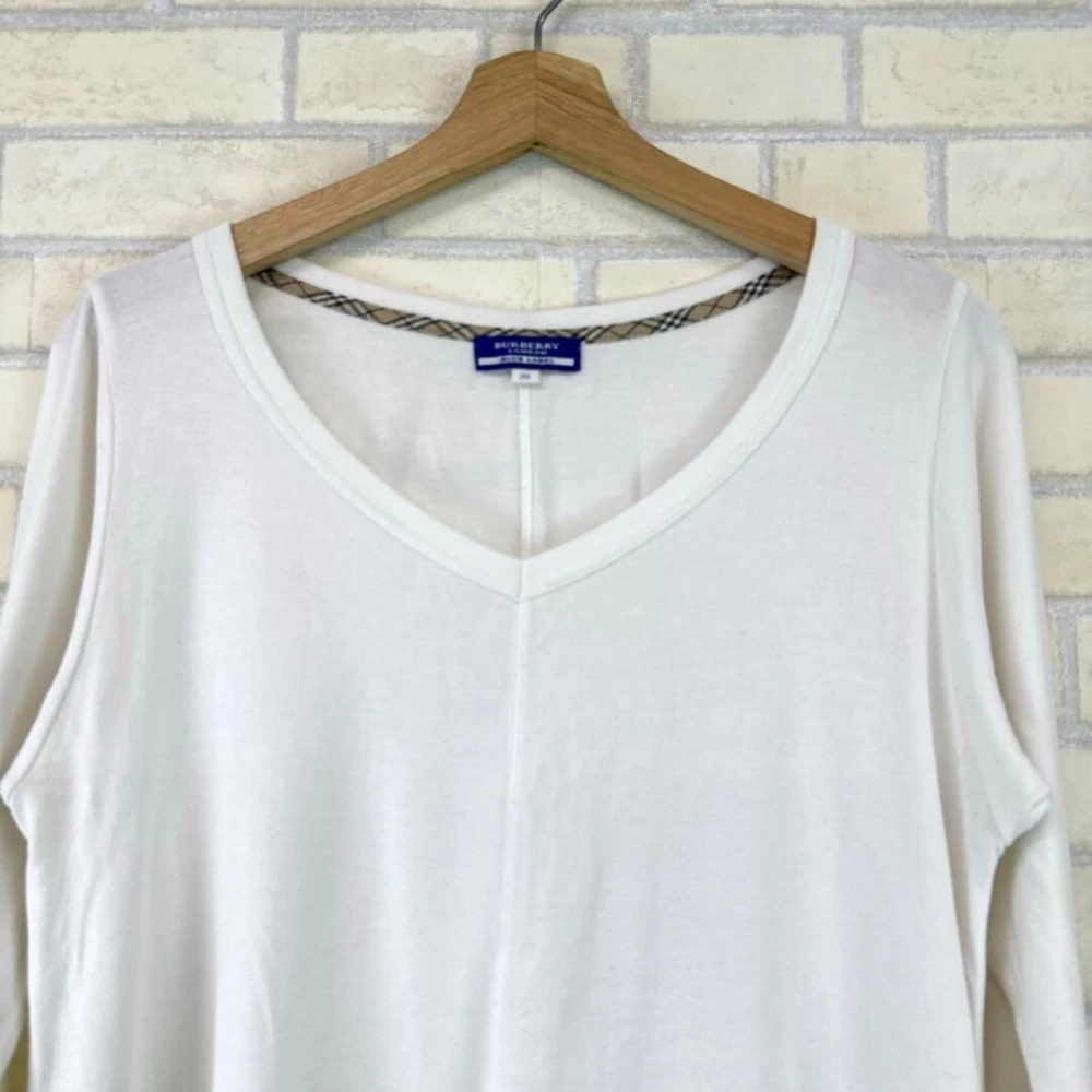 Season: Fall, Spring, Winter Fit: Slim Personalize: No Sleeve Length: Long Sleeve gtin13: Does not apply Brand: Burberry London Sleeve Type: NA Pattern: Solid Material: Cotton Features: NA Strap Type: NA UPC: Does not apply Style: Basic Closure: Pullover Neckline: V-Neck Size: 38 MPN: NA Department: Women Size Type: Regular Handmade: No Type: T-Shirt Country/Region of Manufacture: China Fabric Type: NA Occasion: Business, Casual, Travel Garment Care: NA Character: NA Vintage: No Theme: NA Color: White