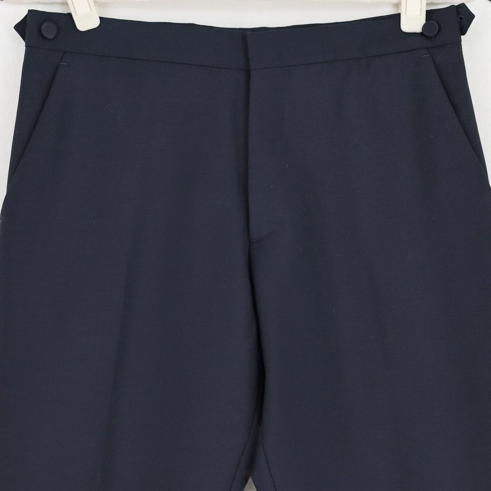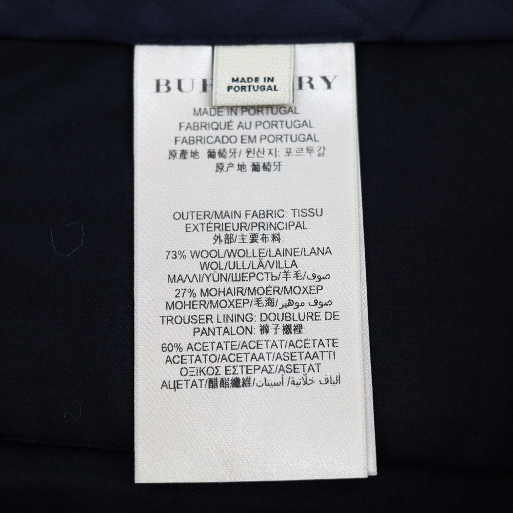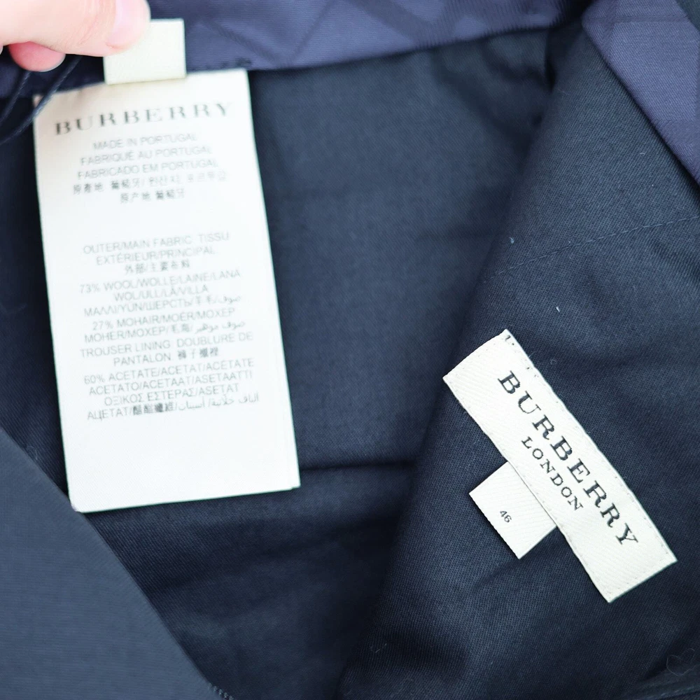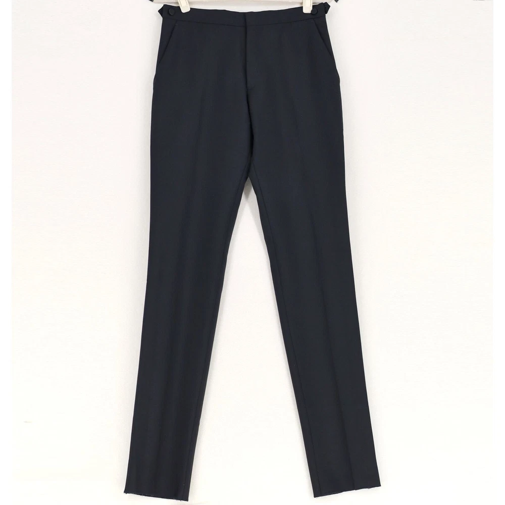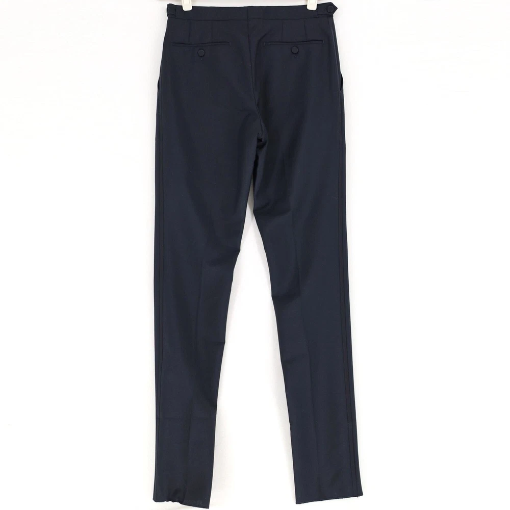 Burberry Men's Black Mohair Wool Embellished Classic Fit Dress Pants Size EU46 New without tags. Never worn - still unhemmed bottom MRSP $1420 EU 46 / US 30 (Small) Crafted in Italian-woven mohair wool Classic-fit Zip fly with hook-and-bar closure Side slip pockets Back button welt pockets Contrast side stripe trim 73% wool, 27% mohair Inseam 37" Waist flat lay measuring 15.5"