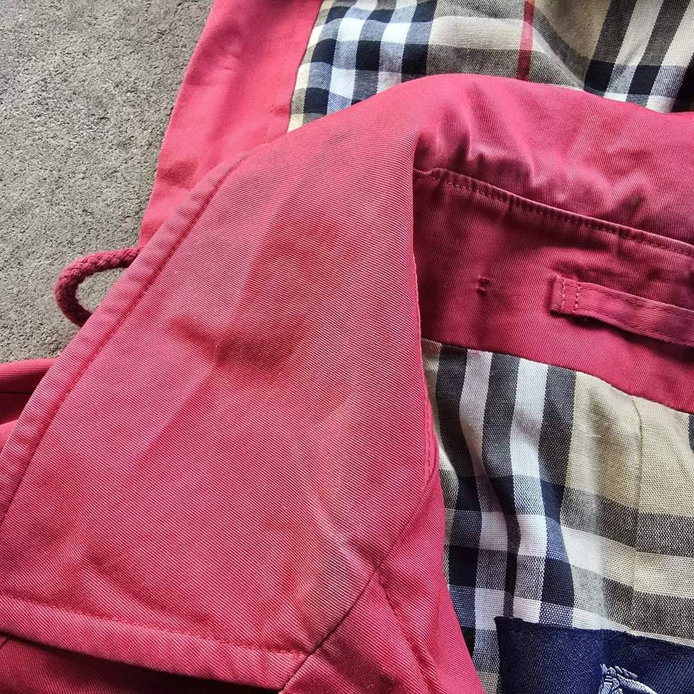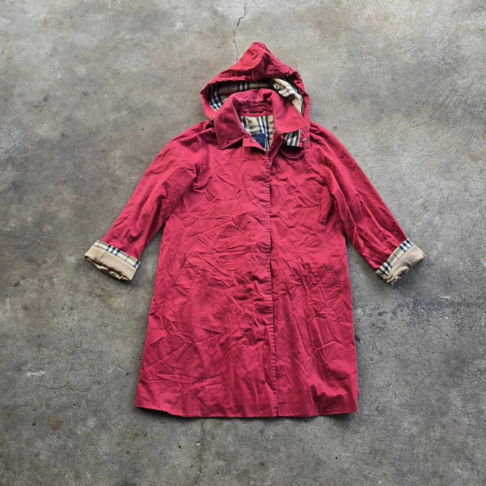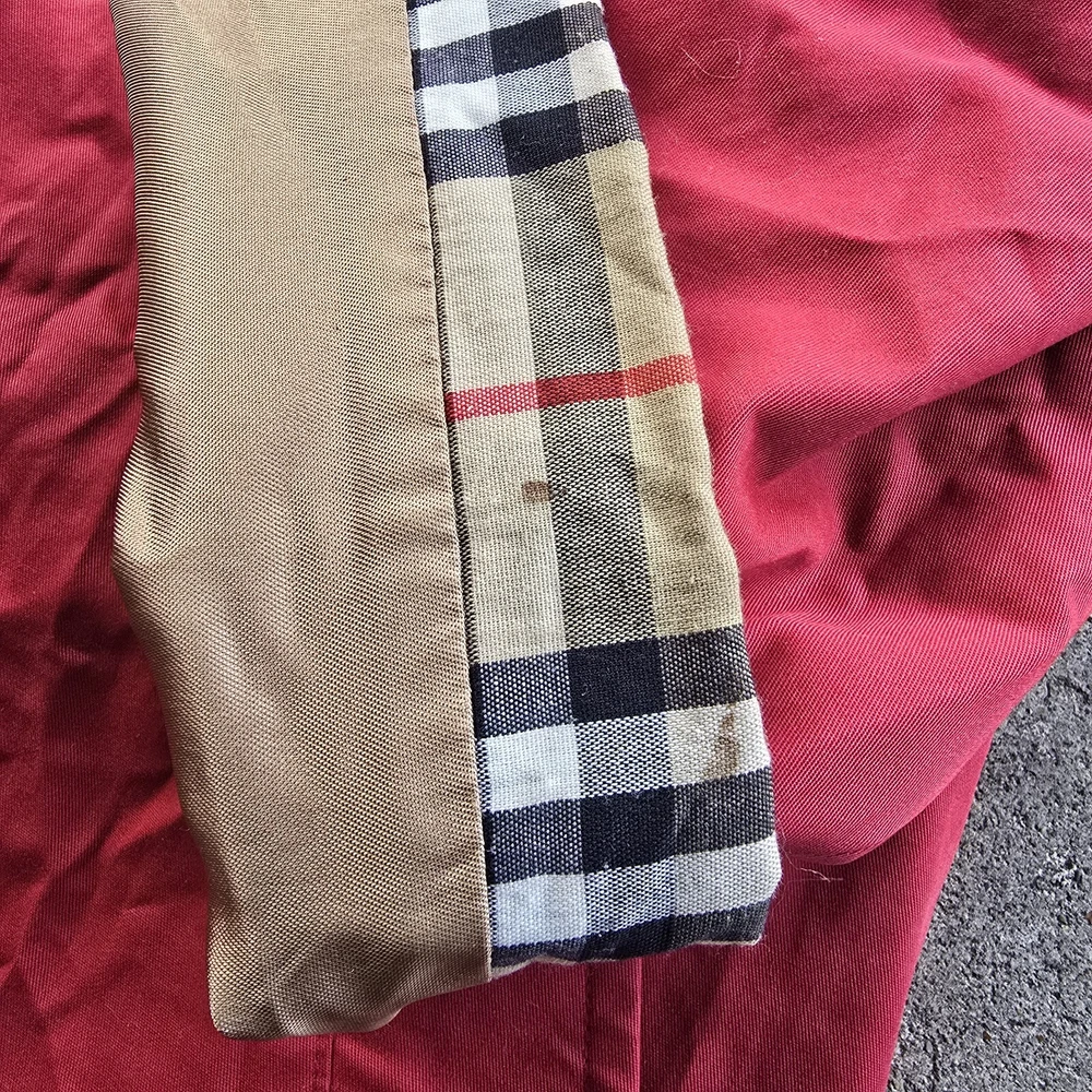 Burberry Nova Check Red Trench Coat Jacket Womens 12 In preloved condition This little cutie has cosmetic spots on inner button bed, wrist, hood and fading along opening Please check out photos for details/ flaws Chest: 22 Length: 37