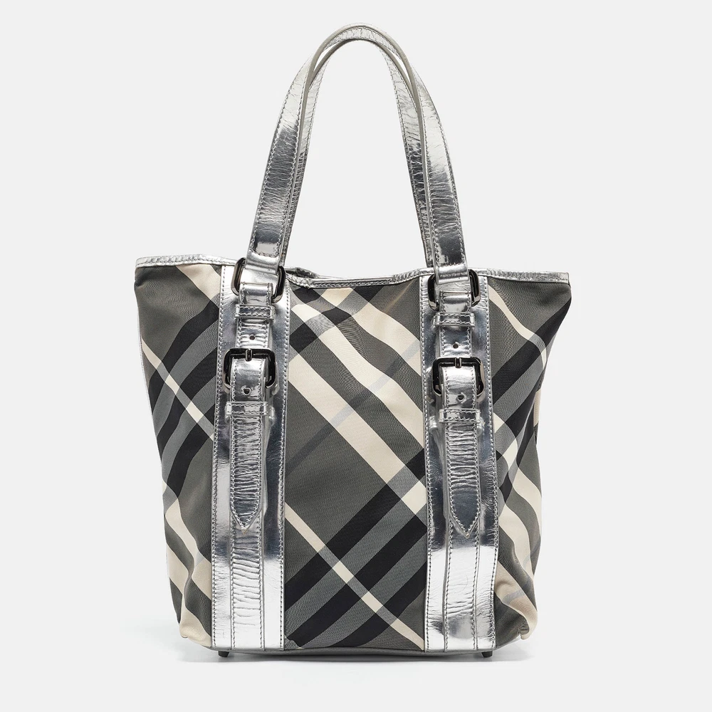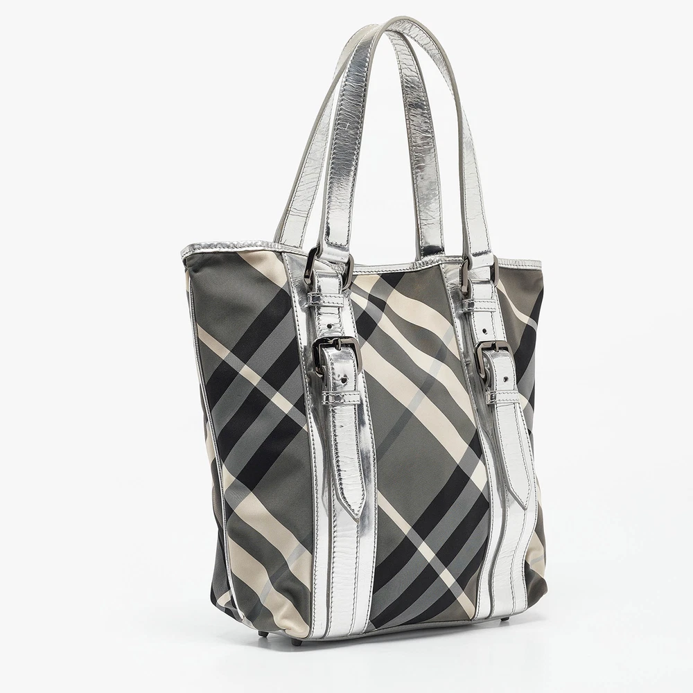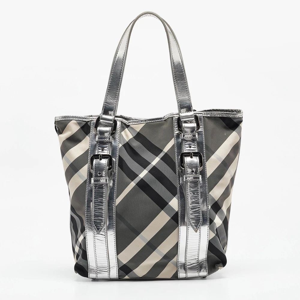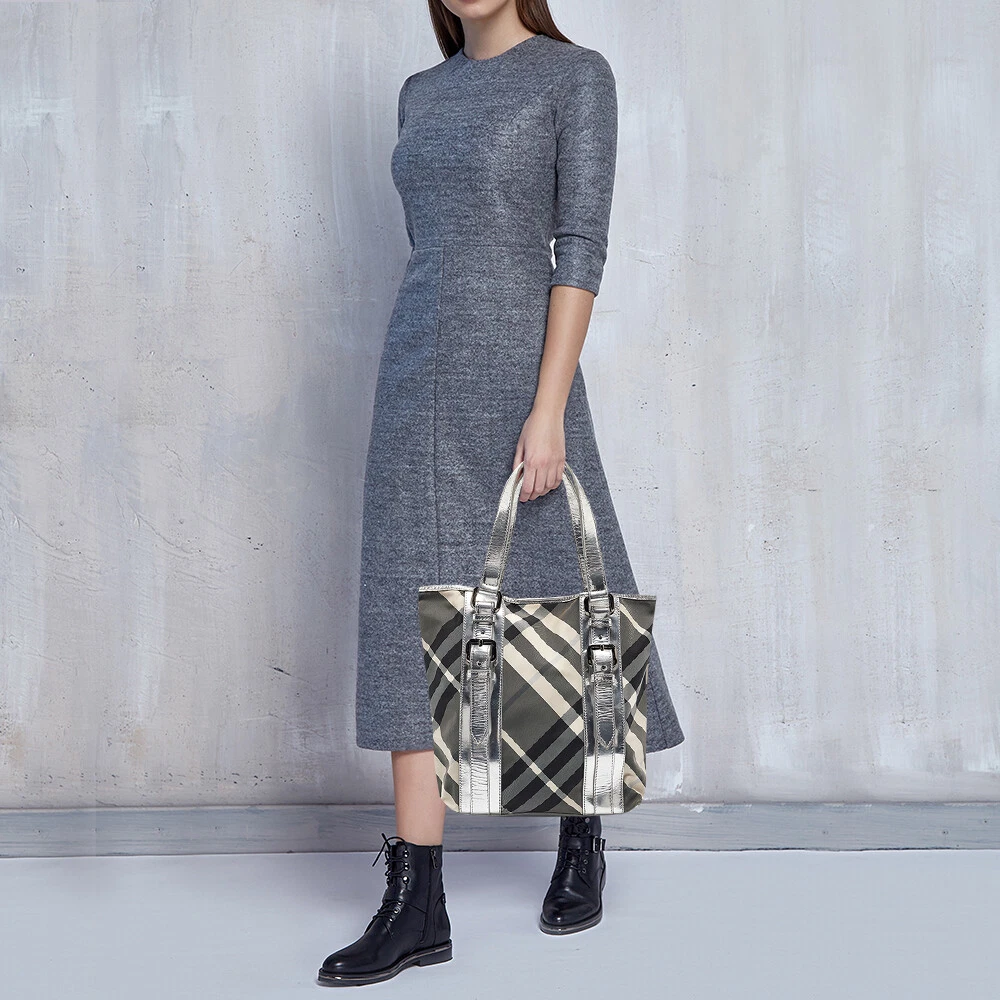 This alluring tote bag for women has been designed to assist you on any day. Convenient to carry and fashionably designed, the tote is cut with skill and sewn into a great shape. It is well equipped to be a reliable accessory.Certified by The Luxury Closet - This item has gone through a detailed authentication process overseen by our experts. We offer a lifetime guarantee of authenticity on all our items. Import duties, taxes and charges are not included in the item price. These charges are the buyers responsibility. Please check with your country’s customs office to determine what these additional cost will be prior to buying. Our eBay Store About Us Contact Us Add to Favorite Sellers Burberry Silver Beat Check Nylon Victoria Tote $614.9 This alluring tote bag for women has been designed to assist you on any day. Convenient to carry and fashionably designed, the tote is cut with skill and sewn into a great shape. It is well equipped to be a reliable accessory. Product Details Brand Color Silver Dimensions Height: 31 cm, Width: 10 cm, Length: 26.5 cm Material Laminated Leather, Nylon Size Outsole Width Outsole Length Heel Height Includes The Luxury Closet Packaging Certified by The Luxury Closet This item has gone through a detailed authentication process overseen by our experts. We offer a lifetime guarantee of authenticity on all our items. How We Check The in-house team of experts at The Luxury Closet is highly trained to verify the authenticity and the condition of the luxury products. They ensure that only 100% authentic items are put on sale.The evaluation process is unique with its own mix of assessment criteria and differs according to the category. Each item is evaluated based on the following combination of hallmarks, hardware, stitching, symmetry, material, craftsmanship, stamping, codes, hologram stickers, and packaging. Our authenticators also check if the items have been modified or amended (e.g., aftermarket diamonds, replaced batteries, repaired bags, etc.) International Buyers Import duties, taxes and charges are not included in the item price. These charges are the buyers responsibility. Please check with your country’s customs office to determine what these additional cost will be prior to buying.