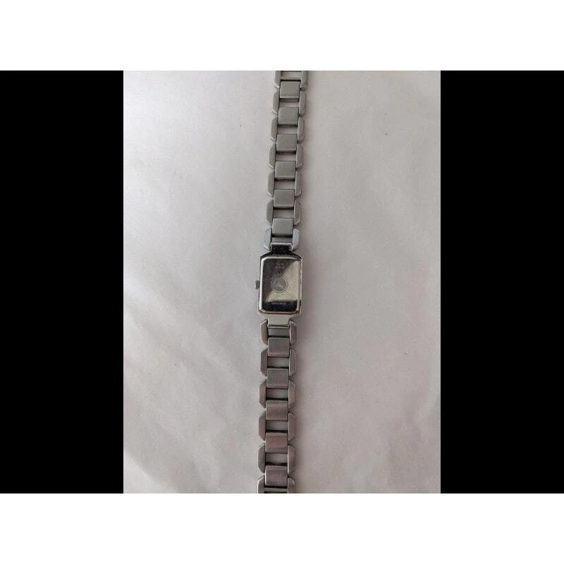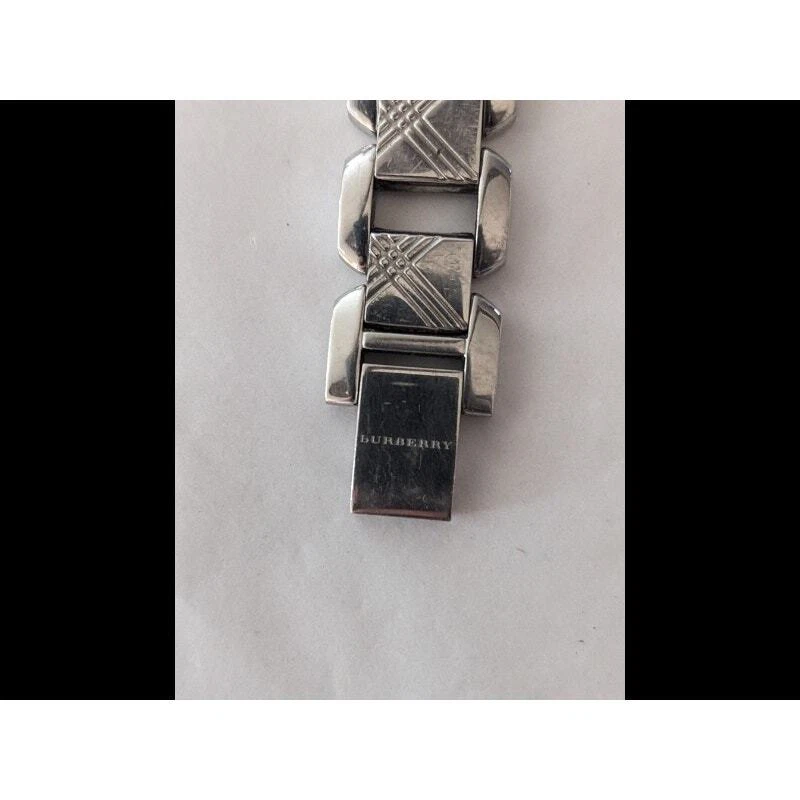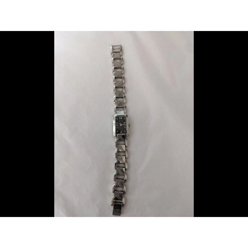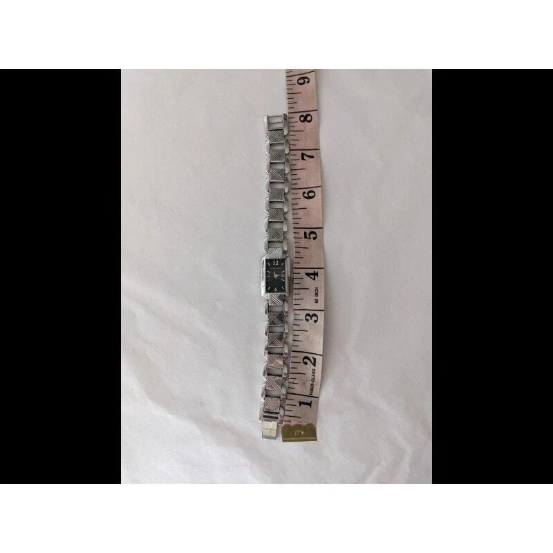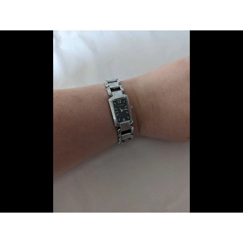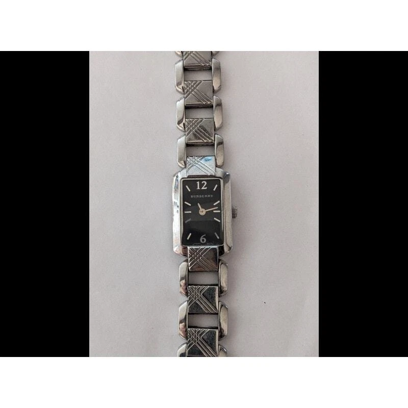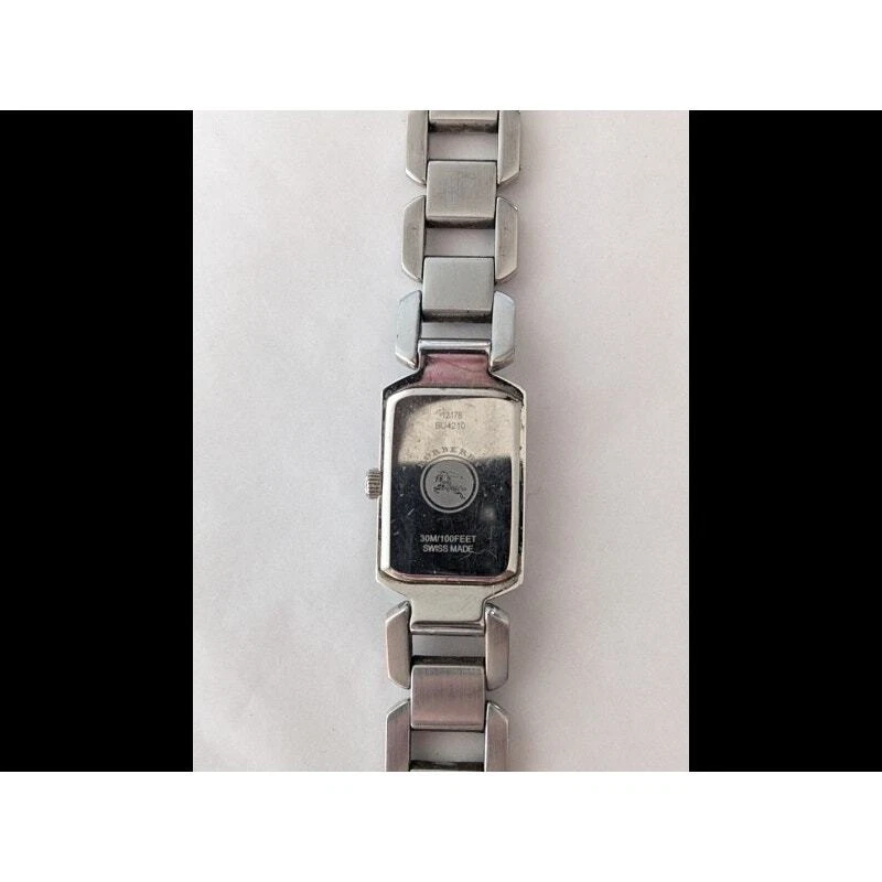 Burberry Silver Tone Rectangular Watch with Black Dial BU4210 8in working This watch is adjustable. The battery has been replaced and the watch is ticking. This item is pre-owned and shows signs of wear. Please refer to the photos for reference.