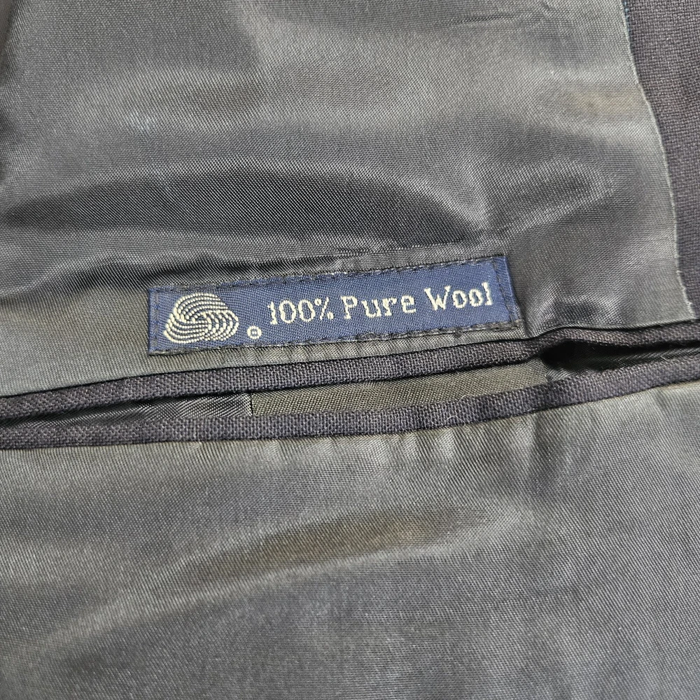 Vintage Burberry navy blue striped sport coat/ blazer/ suit jacket. Material is 100% pure wool, union made in USA. Notched lapel, two button closure, single vent. Size 44 Long, based on measurements as size tag is not marked. Jacket's "Burberrys'" tag dates it to the 90s, as the company dropped the "s" from their name in 1999. *Please verify measurements before purchasing * Good preowned condition