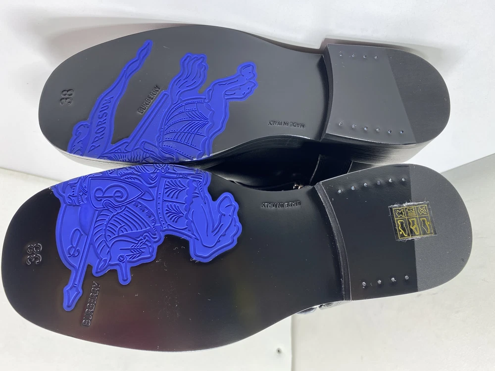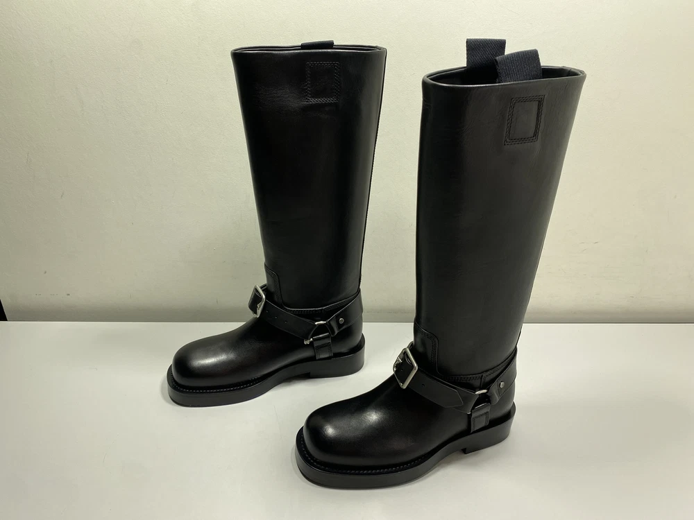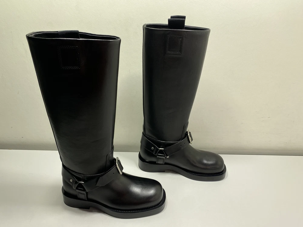 Style: Riding Boot Type: Boot Upper Material: Leather Features: Comfort, Buckle, Adjustable Strap Insole Material: Leather Pattern: Solid Color: Black Season: Fall, Winter Outsole Material: Leather Accents: Equestrian Knight Design at Sole, Harness Lining Material: Leather Closure: Pull On Department: Women US Shoe Size: 8 Shoe Shaft Style: Knee High Brand: Burberry