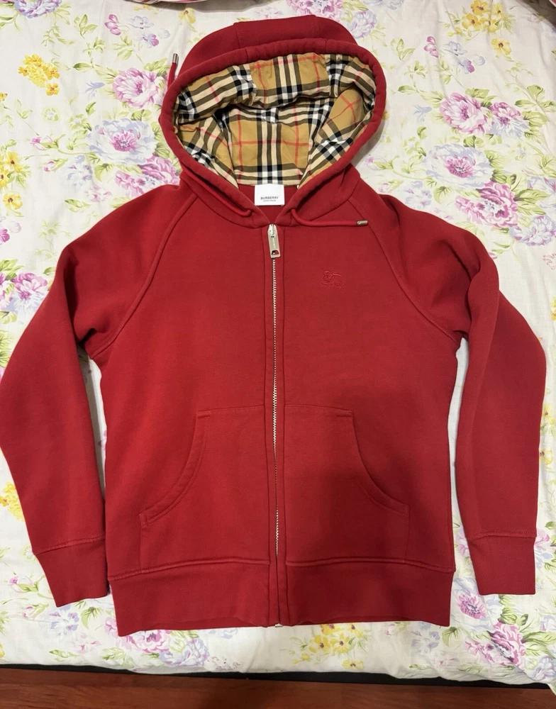 Garment Care: Machine Washable Color: Red Features: Hooded, Pockets Personalize: No Neckline: Round Neck Sleeve Type: Classic/Fitted Size Type: Regular Material: Cotton Blend Character: Nova Fabric Type: Blended Fabric Style: Full Zip Season: Fall, Spring, Winter Vintage: No Performance/Activity: Gym & Training, Running & Jogging, Walking Size: XS Character Family: Red Type: Hoodie Chest Size: 40 in Pattern: Check Department: Women Lining Material: Cotton Occasion: Casual Accents: Embroidered, Logo, Zipper Sleeve Length: Long Sleeve Country/Region of Manufacture: Portugal Fit: Regular Product Line: Burberry Closure: Zip Brand: Burberry Theme: Designer