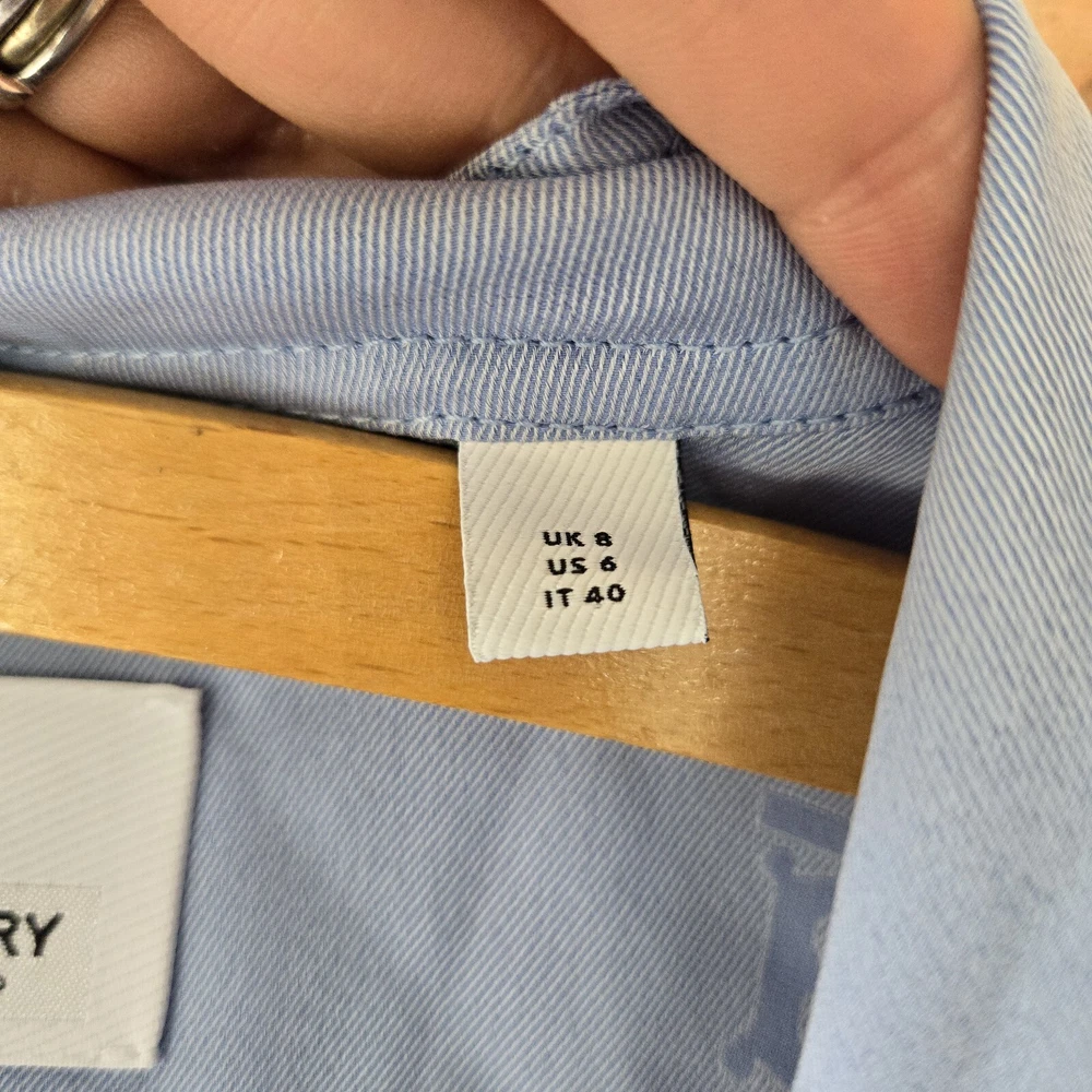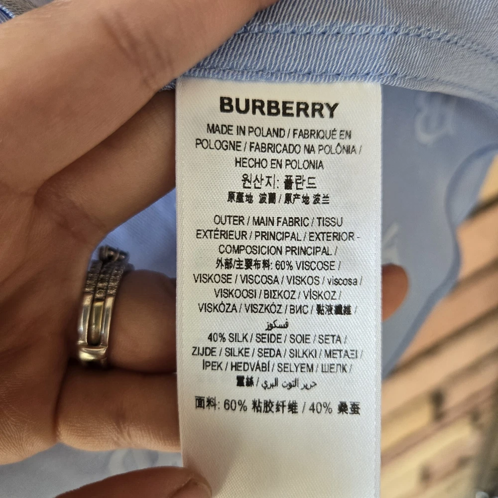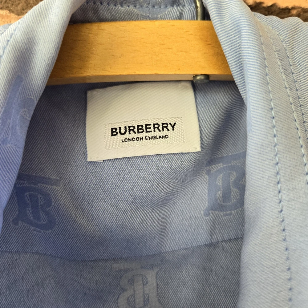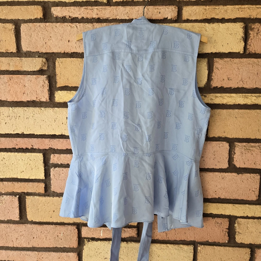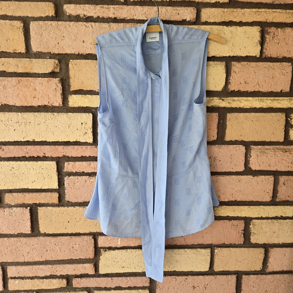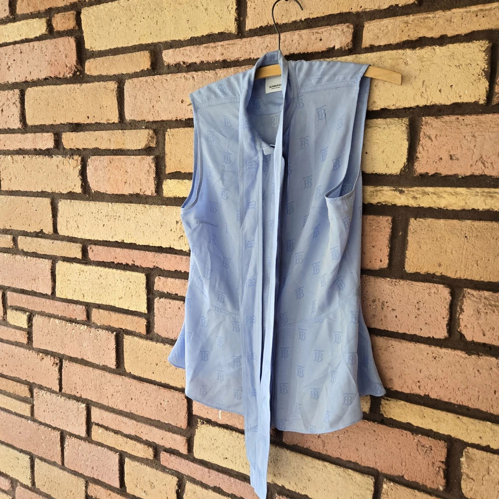 Burberry monogram jacquard sleeveless blue blouse US 6 Preowned excellent condition Burberry monogram jacquard sleeveless Blouse 40% silk Approx Pit to Pit 20" Length 25.5" Waist 17" . . Please note that all items come from a smoke-free pet friendly home. Items are stored away from animals.