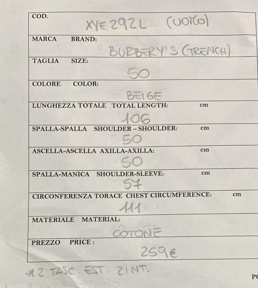 Size Type: Regular Outer Shell Material: Cotton Style: Trench Type: Jacket Closure: Button Department: man UPC: Does not apply gtin13: Does not apply Size: 50 Vintage: Yes Color: Beige Brand: burberry's