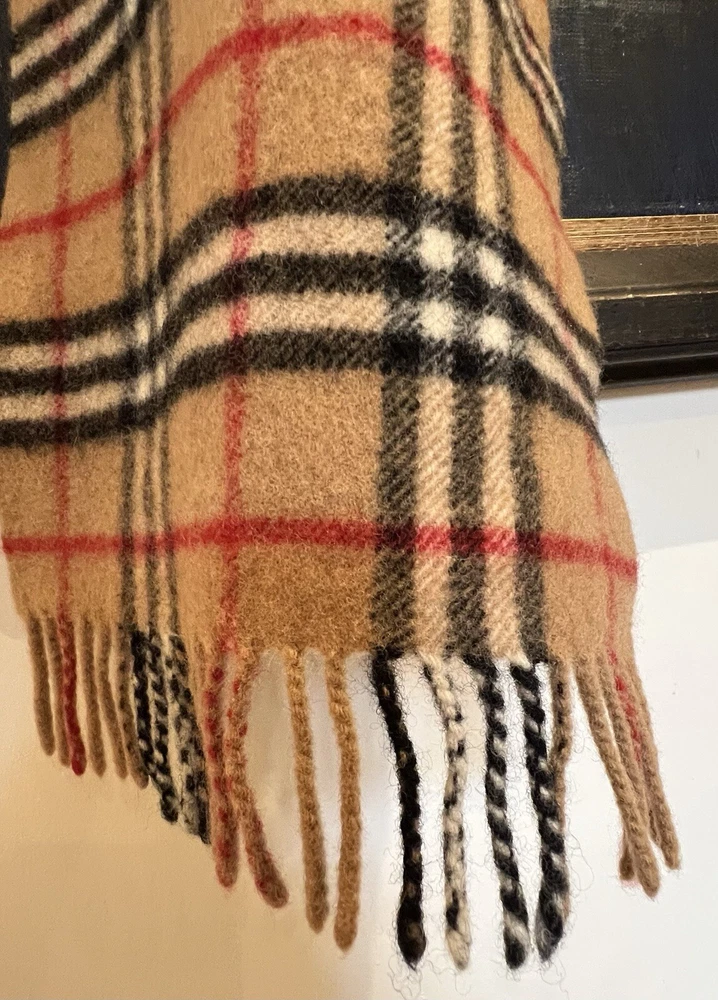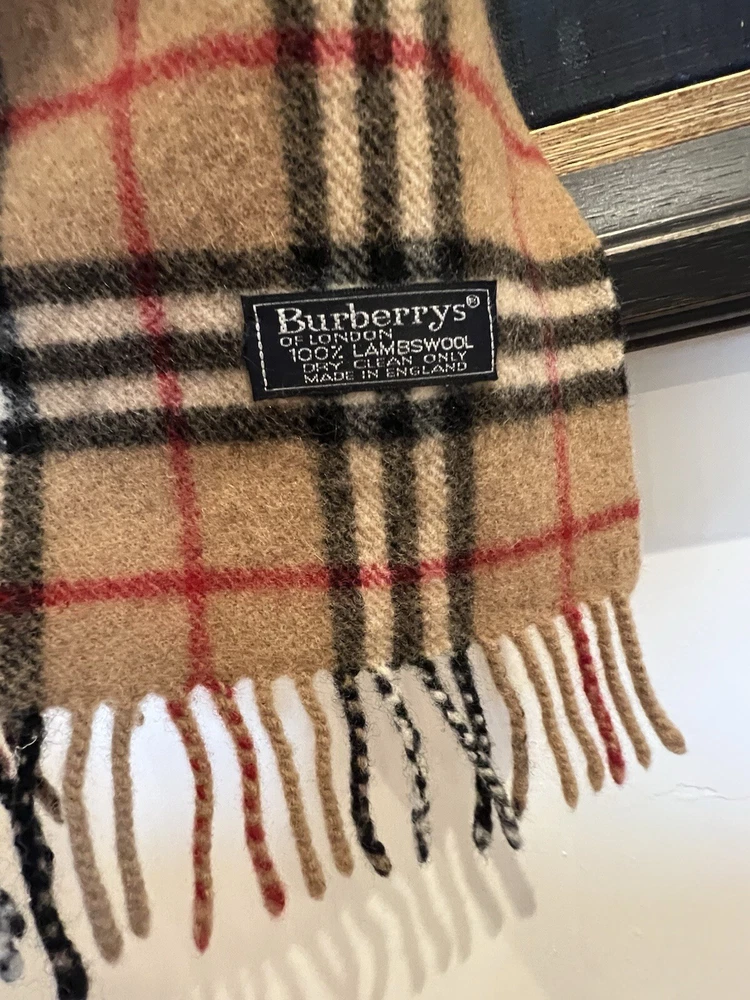 Burberrys Nova Check Classic Scarf. Made of high-quality wool and crafted in the United Kingdom, this unisex rectangle scarf is perfect for keeping you warm and stylish. The scarf features a fringe accent, a rectangle shape, and a multicolor check pattern that is perfect for any occasion. Very good to excellent condition. No flaws.