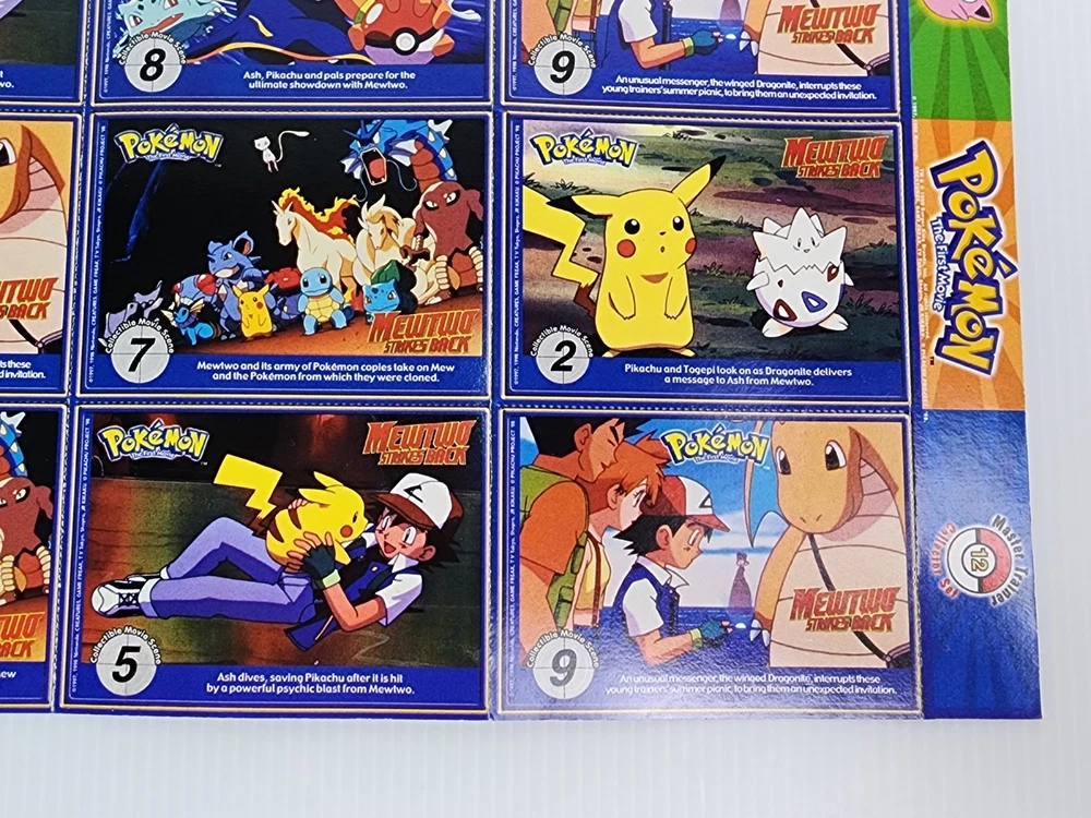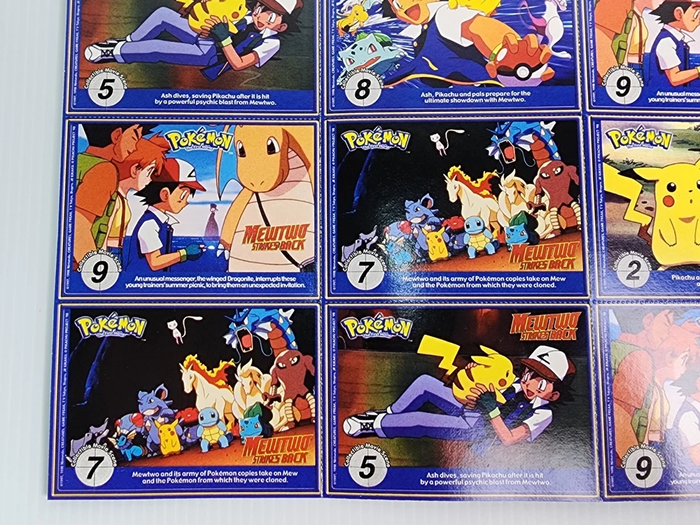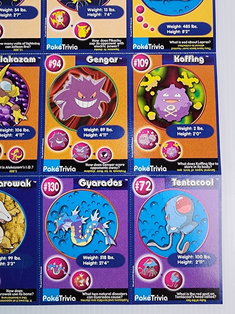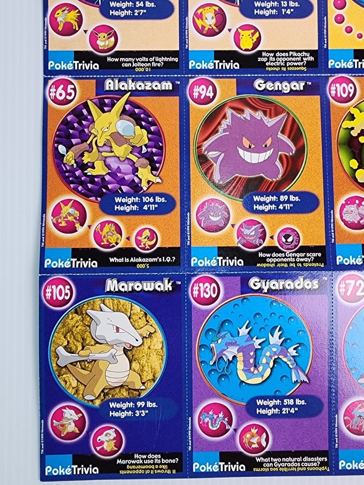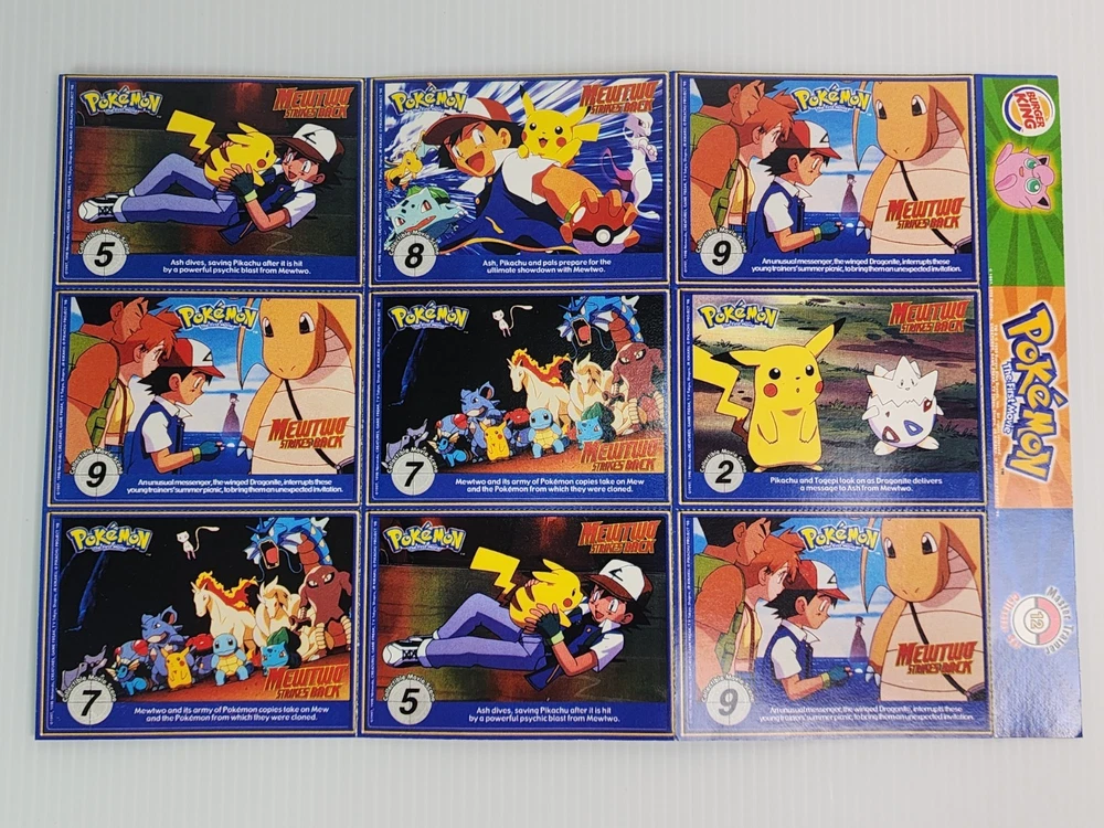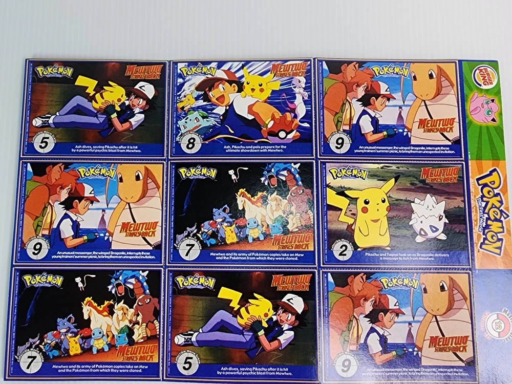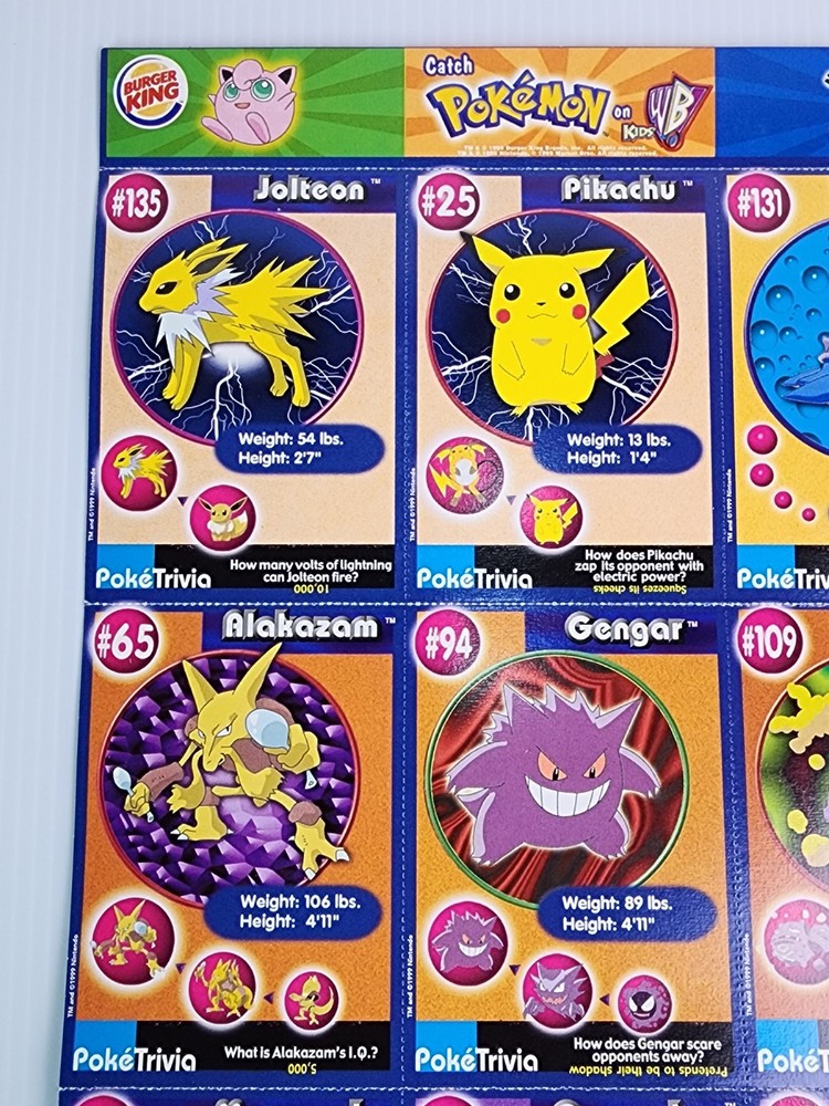 Relive the magic of the Pokémon craze with this original 1999 Burger King Pokémon Master Trainer collector card lot! This vintage set includes 18 cards featuring fan-favorite Pokémon like Pikachu, Gyarados, Jolteon, Gengar, and more. Each card showcases colorful character art, PokéTrivia, and stats like height, weight, and number. Also included are scene cards from the classic Pokémon: The First Movie – Mewtwo Strikes Back, highlighting iconic moments with Ash, Pikachu, Charizard, and Dragonite. These WB Kids promotional inserts were part of the original 1999 Burger King release. Condition: Gently handled with light wear consistent with age. Artwork still pops with bright, vibrant colors. Cards are uncreased and unbent. A nostalgic and collectible piece of Pokémon history! Perfect for collectors, display, or as a gift for any Pokémon fan. Catch ‘em while you can!