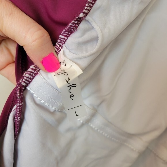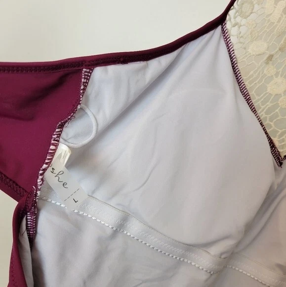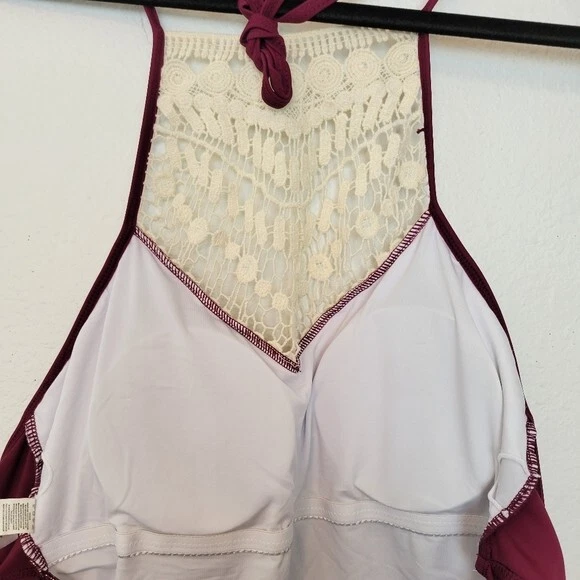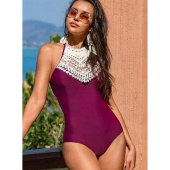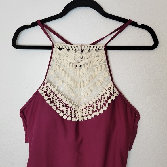 Cupshe Size Large Burgundy Crochet Accented Halter One Piece Swimsuit Boho. Ships With USPS First Class Mail -Adorable one piece swimsuit by Cupshe in a burgundy/wine colored shade with Ivory crochet detailing at the high neckline -Size Large -Halter neck -Shelf bra with padded removable cups -Lined -100% polyester -Measurements are approximately 16 in armpit to armpit 17 in across the hips 28 in from the top of the crochet to crotch -Preloved in excellent condition! ------------------------------------------------ Thanks for looking…have a GREAT DAY! @mandajane223