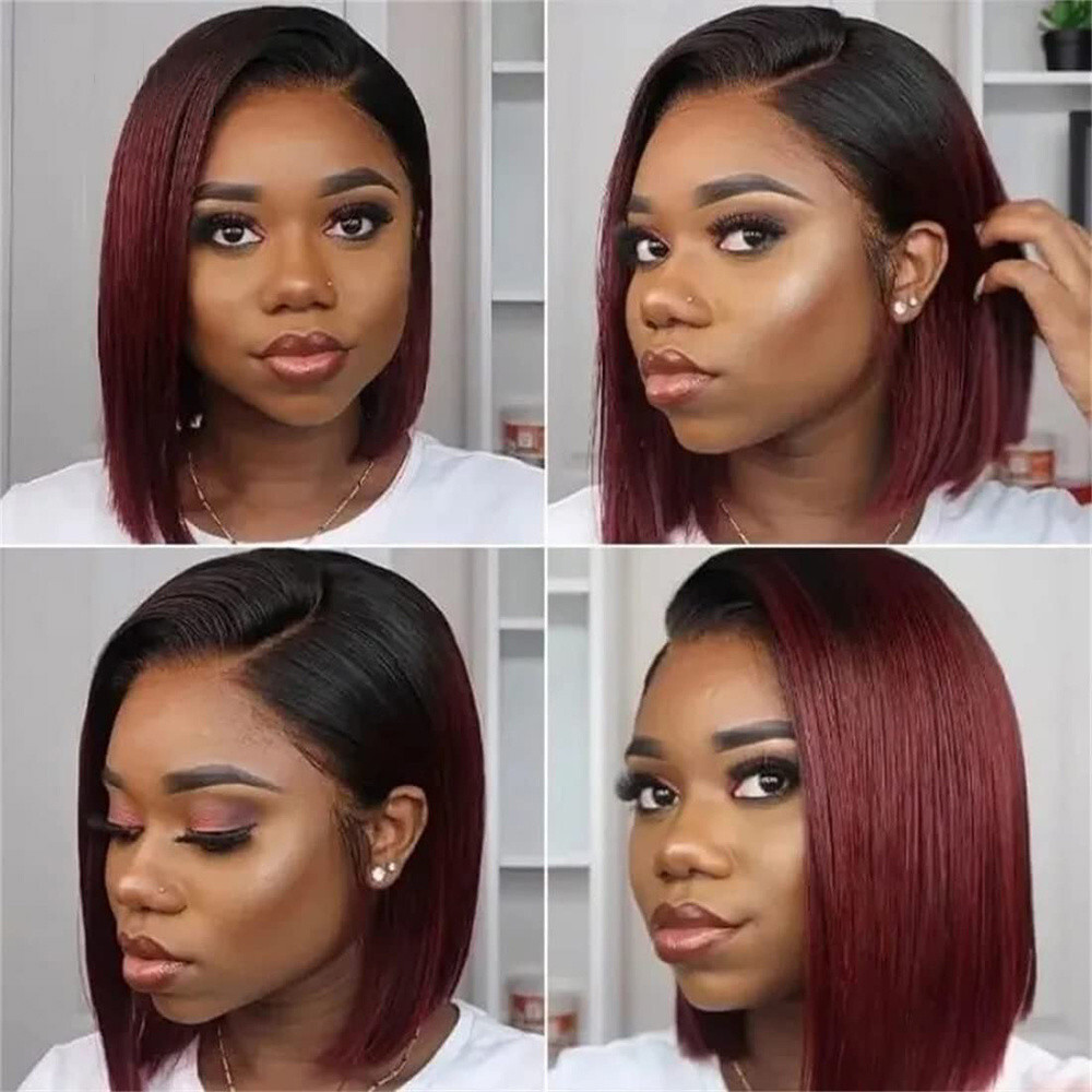 Red Highlight Black Bob Short Human Hair Lace Front Wig Glueless Straight