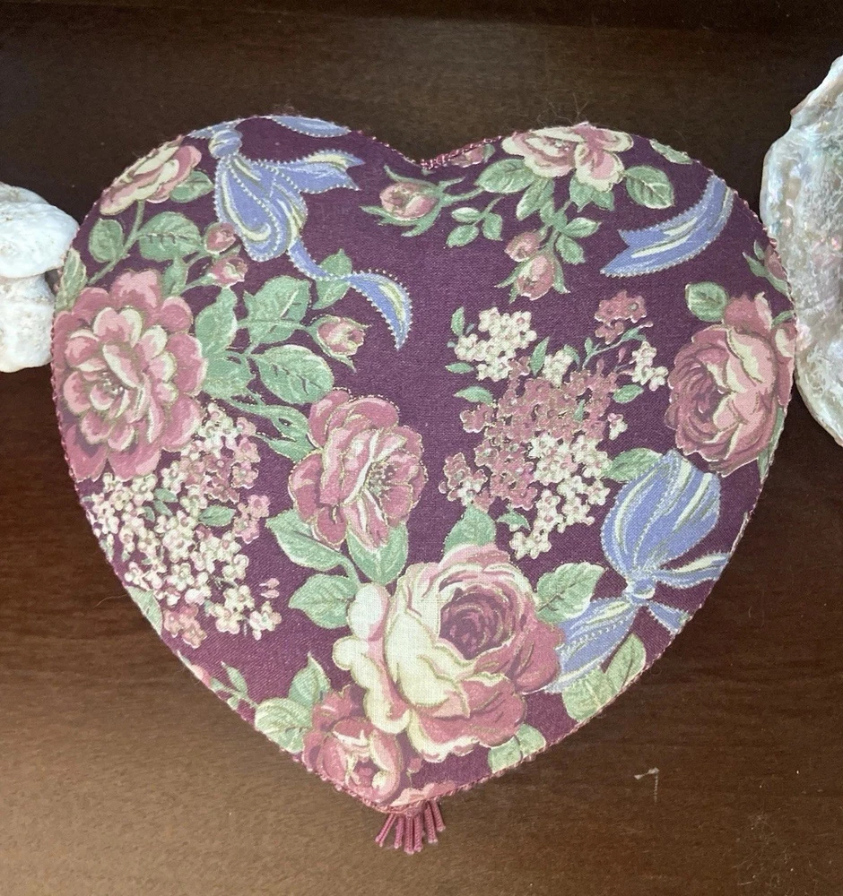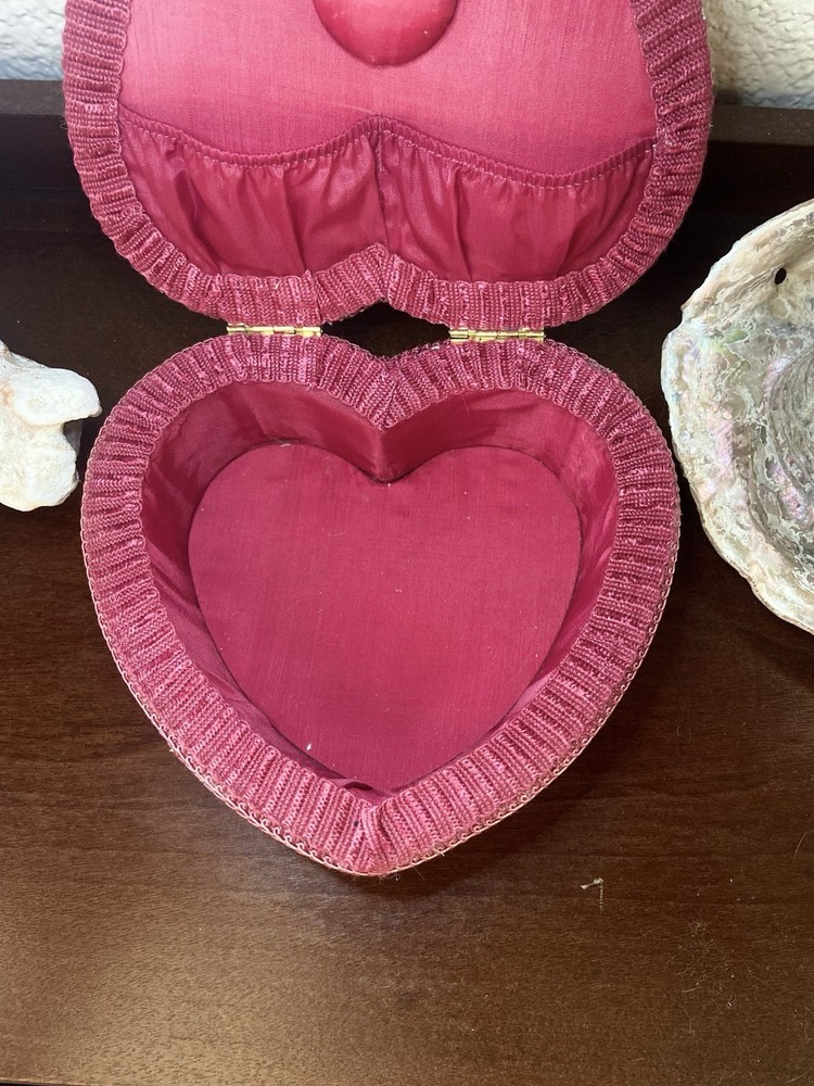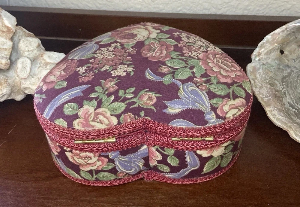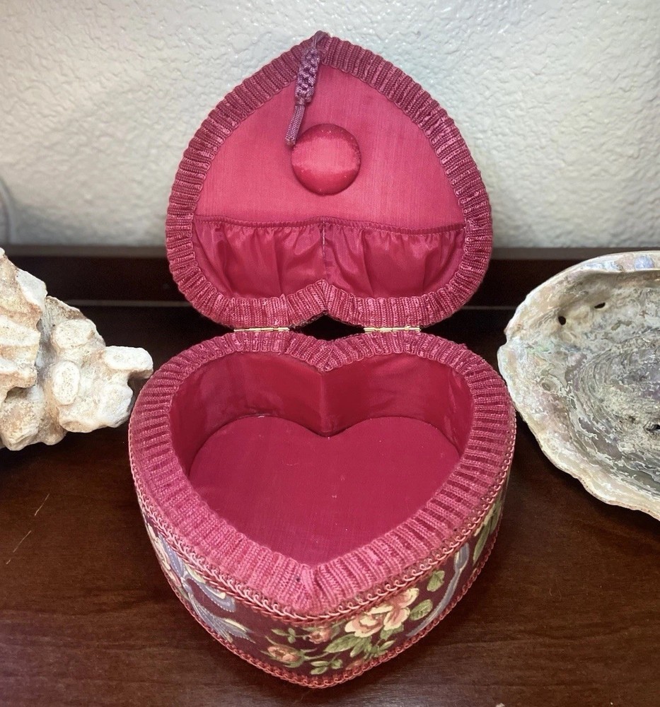 This Burgundy Heart Shaped Jewelry Or Sewing Box is a charming and stylish accessory for any room. The intricate floral detailing on the fabric material adds a touch of romance, making it perfect for all occasions. The heart shape and red color of the box give it a feminine and elegant look, while the ribbon detailing adds a sweet finishing touch. This original piece from the Keepsake Boxes collection is a unique and charming addition to any adult's collection.