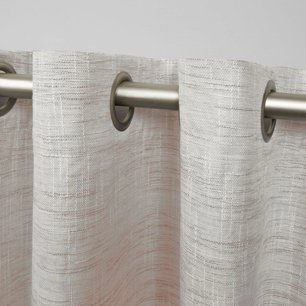 Dress up your windows with the Burke grommet top curtain panels by Exclusive Home. With a tonal slub texture fabric, these curtain panels will provide total blackout experience. Designed with Fused Thermax technology, they will block light, reduce noise, provide privacy and are energy efficient. These thermal insulated curtain panels are constructed with 8 matte silver grommets that can be hung on a curtain rod up to 1.25" diameter. INSULATED & ENERGY EFFICIENT FABRIC: The Burke curtain panels were designed with Fused Thermax technology to be 100% blackout, thermal insulated and energy efficient. 100% BLACKOUT: Created with Fused Thermax technology to eliminate exterior light, you can place your smartphone flashlight behind the fabric and no light will shine through. For a total blackout experience, the curtain panels should measure 2-3 times the width of your window/opening. GROMMET TOP FOR HANGING: These curtain panels feature eight (8) matte silver grommets per curtain panel and fits a curtain rod up to 1.25" in diameter. Each panel is sewn with a 3.5" heading, 1" side hem, and 3" bottom hem. SET OF CURTAIN PANELS: Includes (2) curtain panels, each measuring 52"W x 96"L. STYLISH, TONAL SLUB FABRIC: The tonal stub fabric has a rich, linen-look texture that provides a casual yet chic update to your bedroom, living room, den, or guest room.